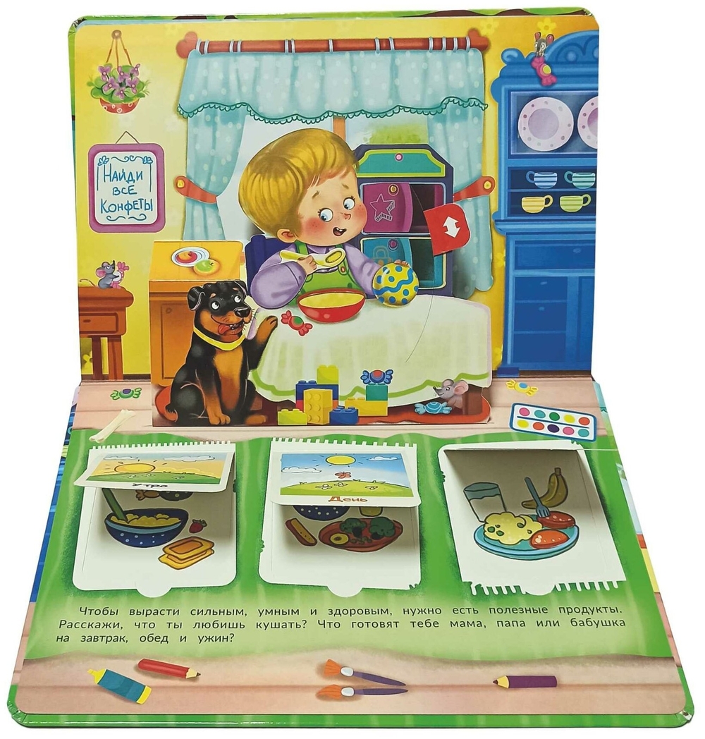 Что сегодня на обед? Эта книжка про животных – домашних и диких, травоядных и хищников, расскажет малышу кто что ест. Как добывают еду? А что на обед у малышей? Почему надо есть полезные продукты? Это удивительная книга! На каждом развороте есть объемные картинки, подвижные детали и даже окошки. А значит книгу можно не только читать, с ней можно играть.