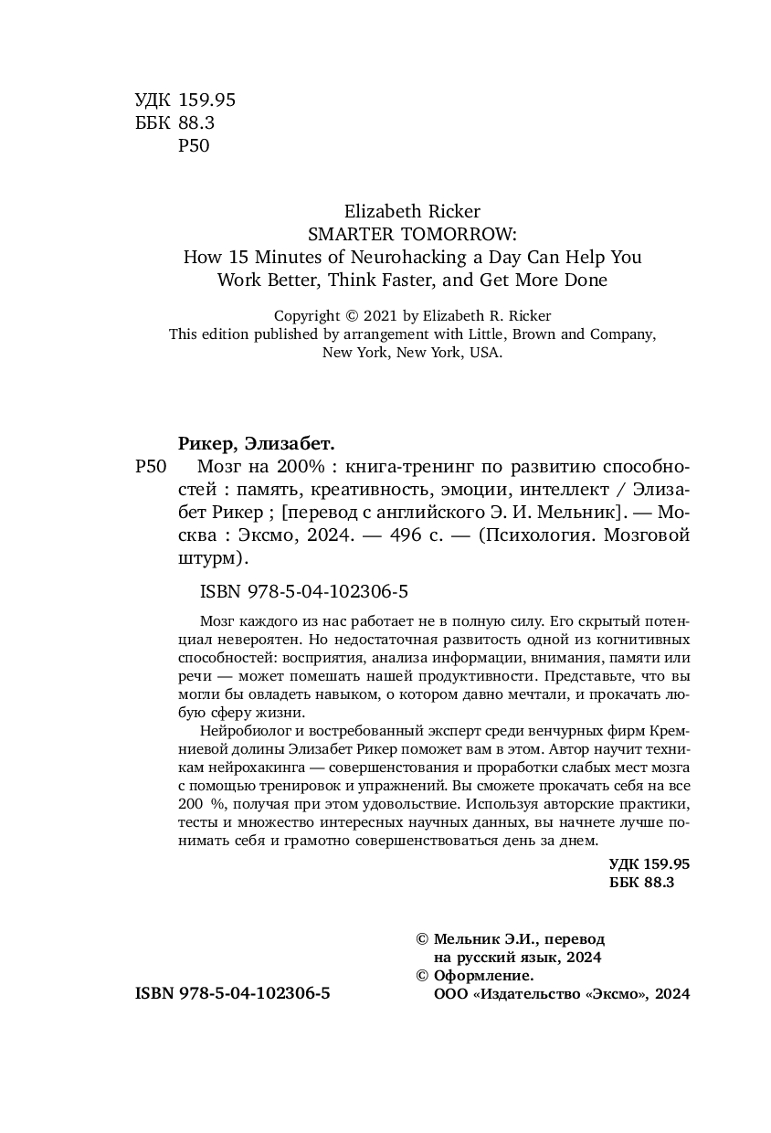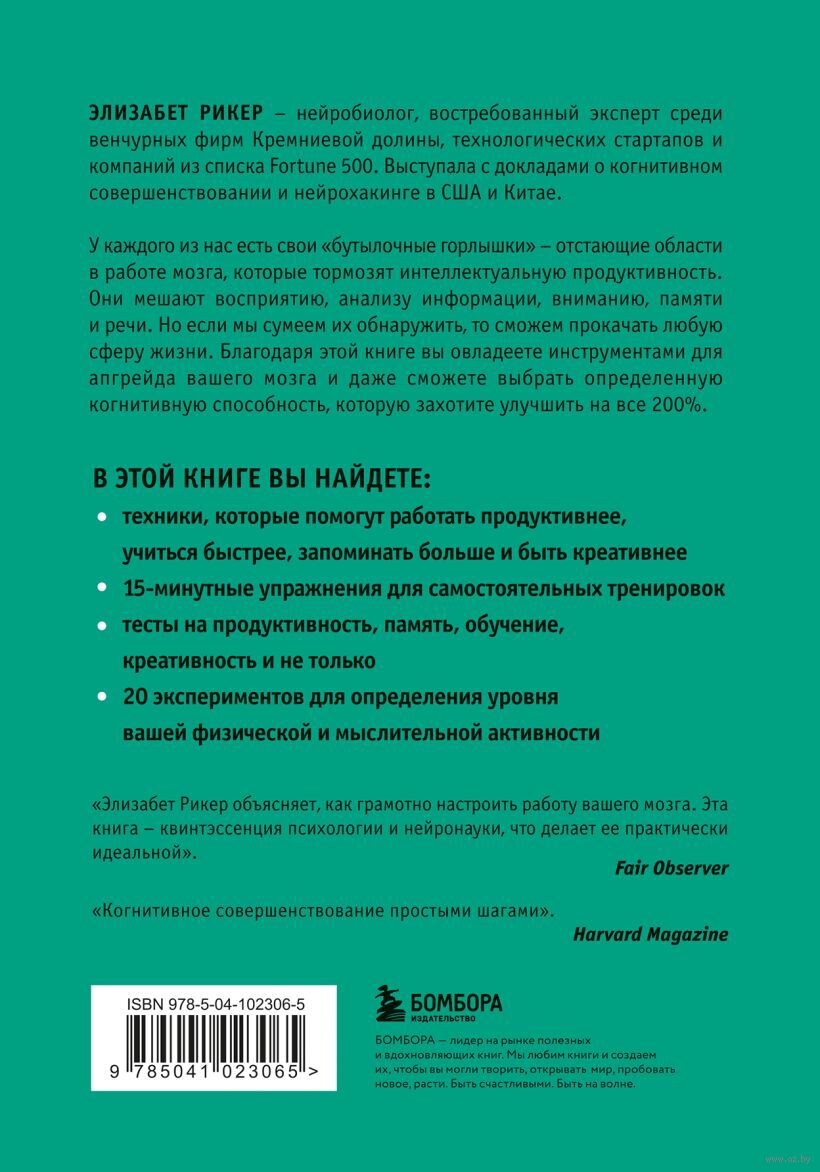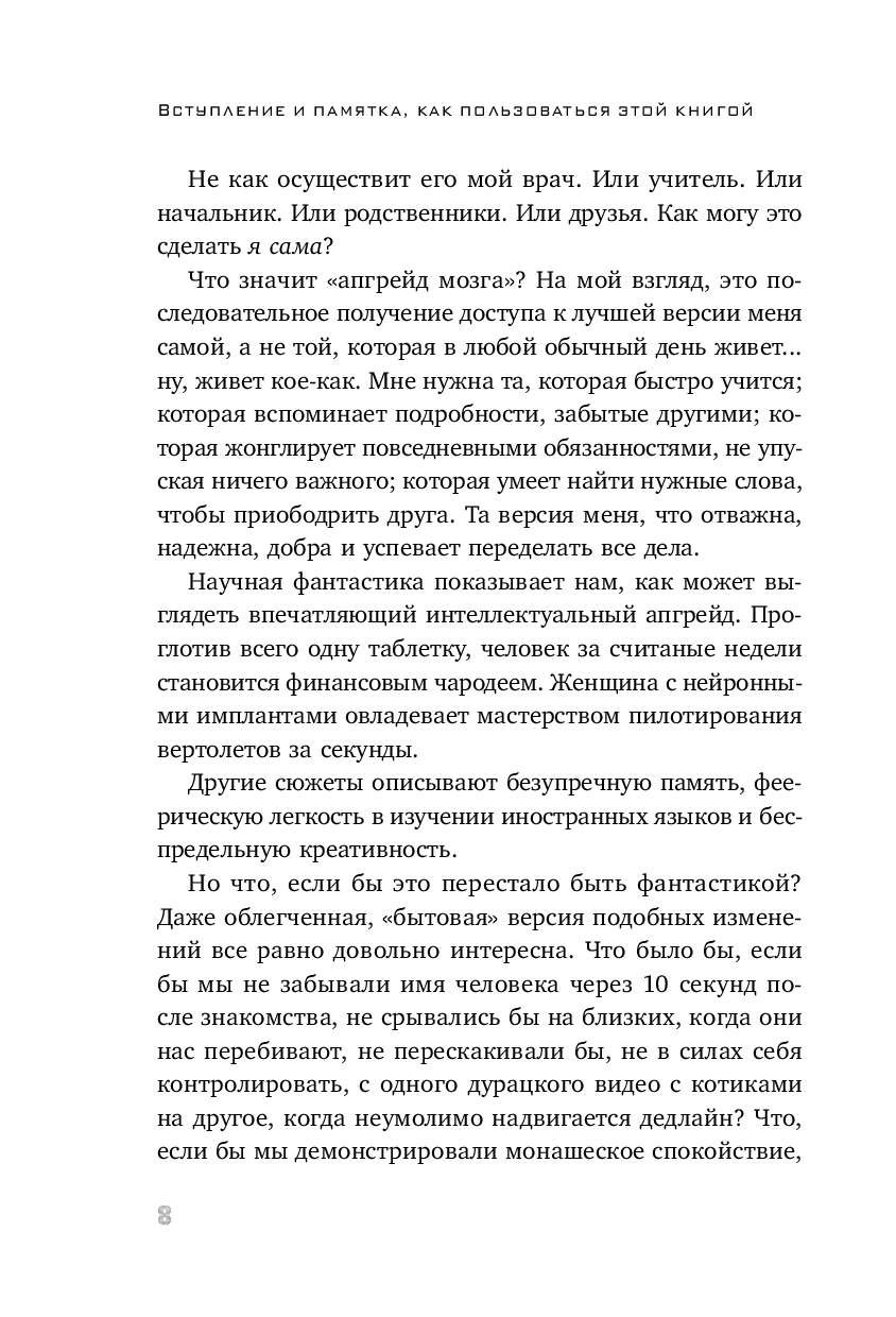 Неправильный образ жизни, стресс, отсутствие физической активности и несбалансированное питание негативно влияют на продуктивность мозга. Нейробиолог и востребованный эксперт среди венчурных фирм Кремниевой долины Элизабет Рикер разработала эффективную программу нейрохакинга, которая поможет проработать слабые места (память, быстрое решение задач, написание текстов, публичные выступления и многое другое). Начать автор предлагает с оценки здоровья, уровня физической активности и удовлетворенности собственной жизнью, что сориентирует вас и поможет проложить увлекательный путь к повышению продуктивности мозга.
