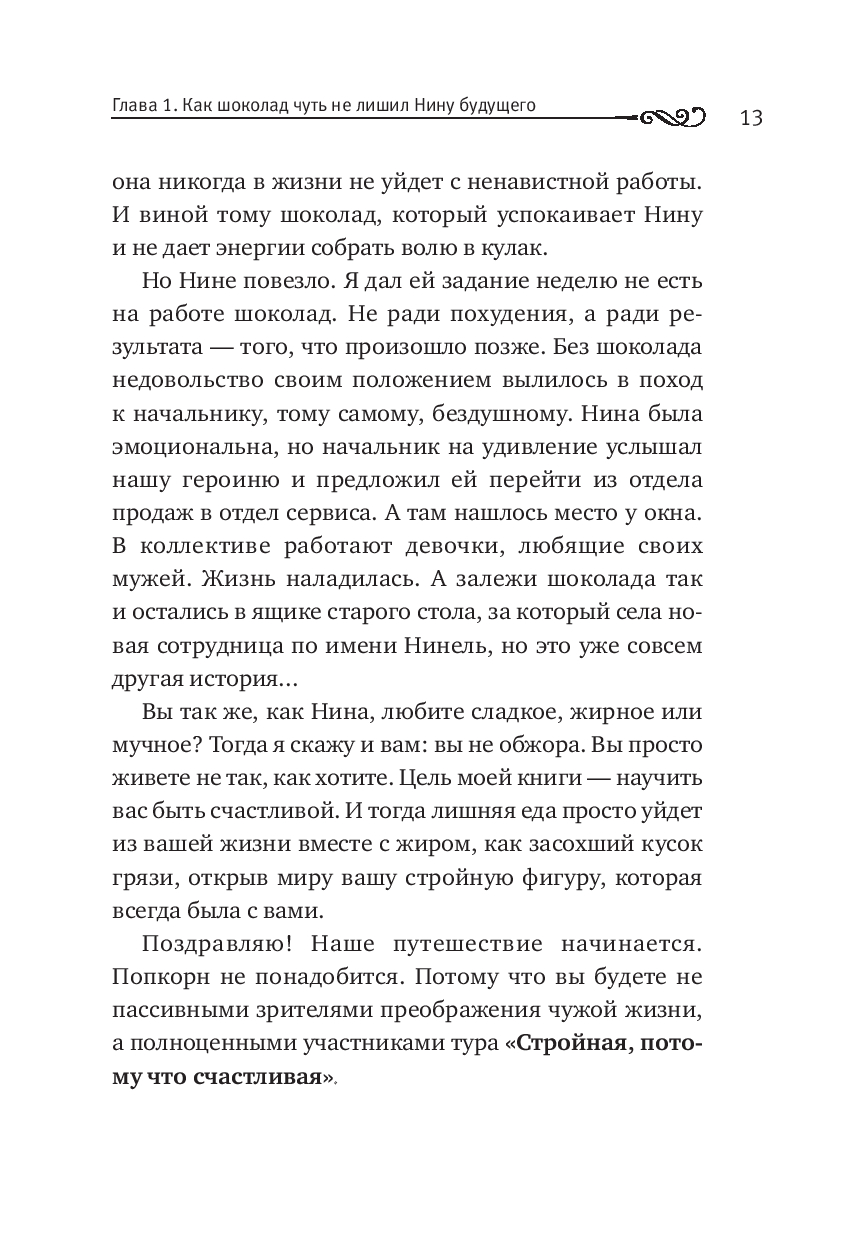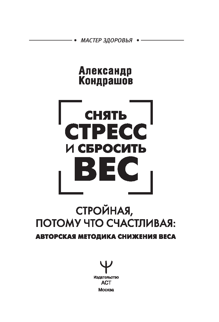 Чтобы похудеть, нужно стать счастливой! Александр Кондрашов, психотерапевт и автор нескольких курсов по снижению веса, расскажет, как счастье приведет к стройности. Курсы похудения от доктора Кондрашова прошли тысячи женщин и мужчин, в результате метод обрел свою совершенную форму, которую автор представил в этой книге. За каждой лишней калорией скрываются слезы, боль, страдания, стресс и тревога. И только избавившись от них можно настроить себя на снижение веса. Книга рассказывает о том, как постепенно подготовить себя и снижать вес: от принятия истинной причины лишнего веса до техник и приемов по нормализации жизни. Станьте стройной и счастливой!