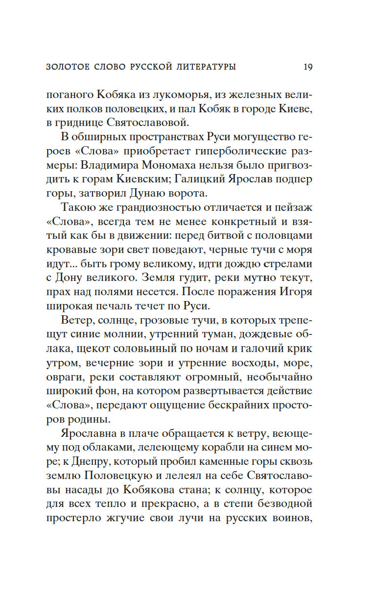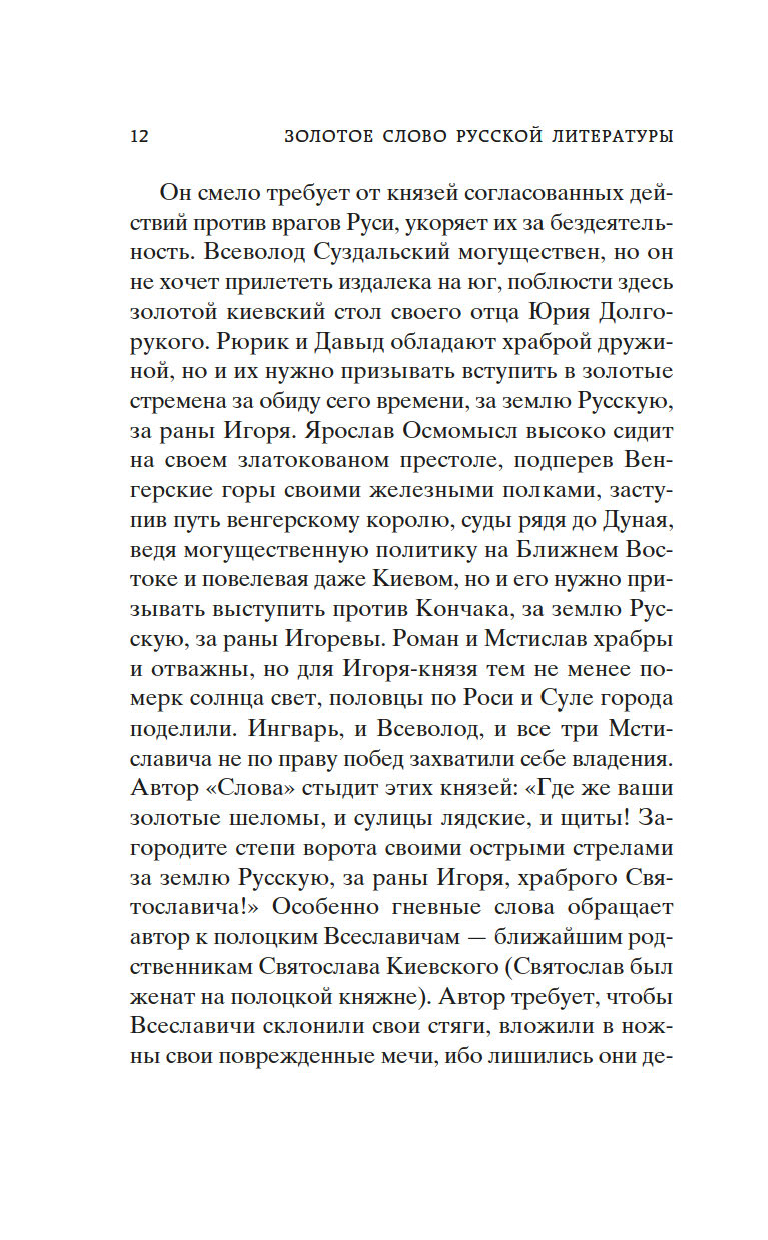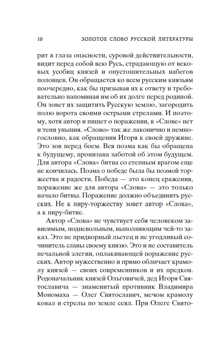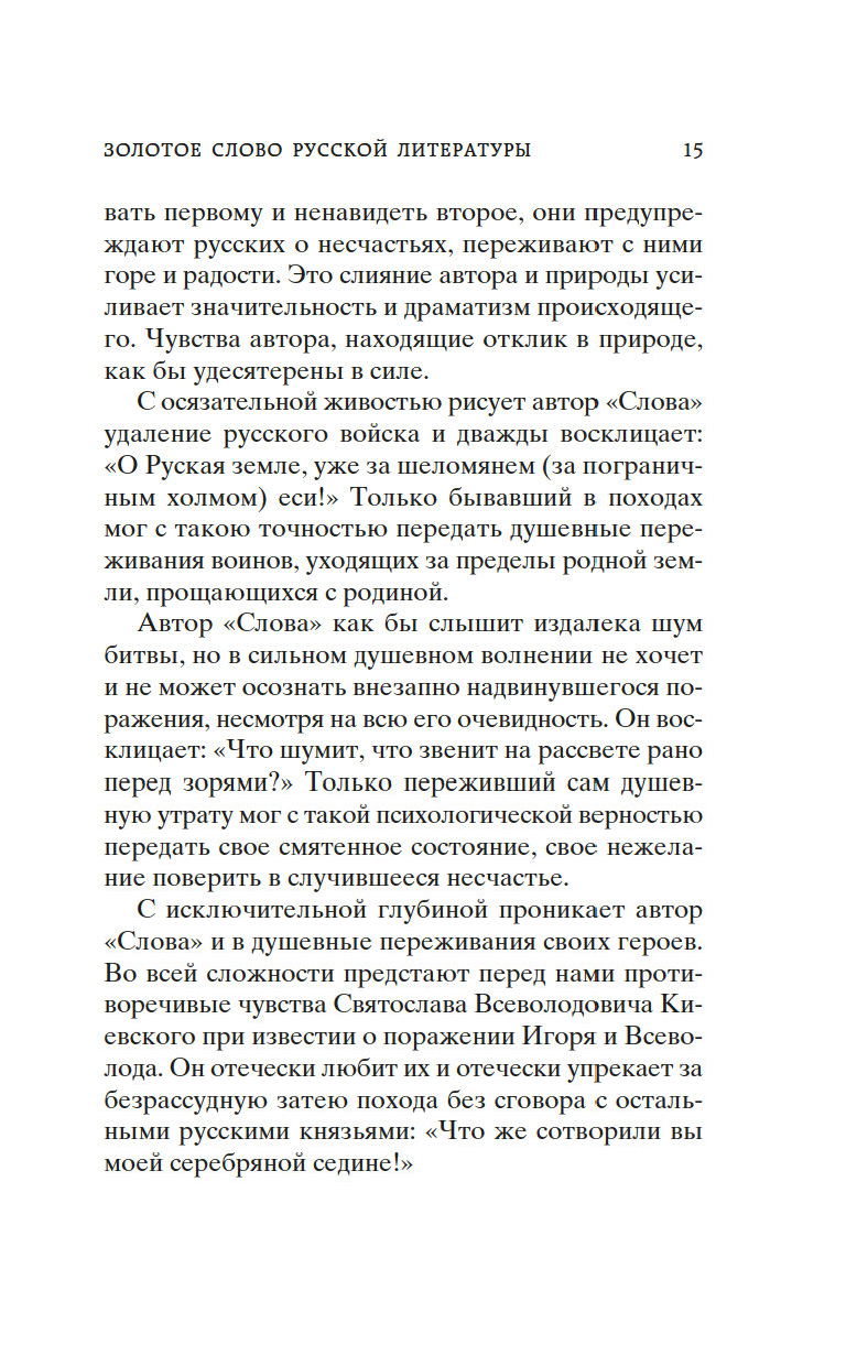 По своему художественному значению "Слово" выделяется на фоне других памятников древнерусской литературы и относится к числу наиболее значительных достижений европейского средневекового эпоса. Обнаруженное в составе рукописного сборника А. И. Мусиным-Пушкиным и опубликованное в 1800 году, "Слово", по словам поэта А. Н. Майкова, "сделало эпоху в нашем литературном мире". Оно привлекло внимание не только исследователей, но и поэтов, художников, музыкантов. "Слово" стало объектом многочисленных стихотворных переводов и переложений, лучшие из которых включены в настоящее издание.
