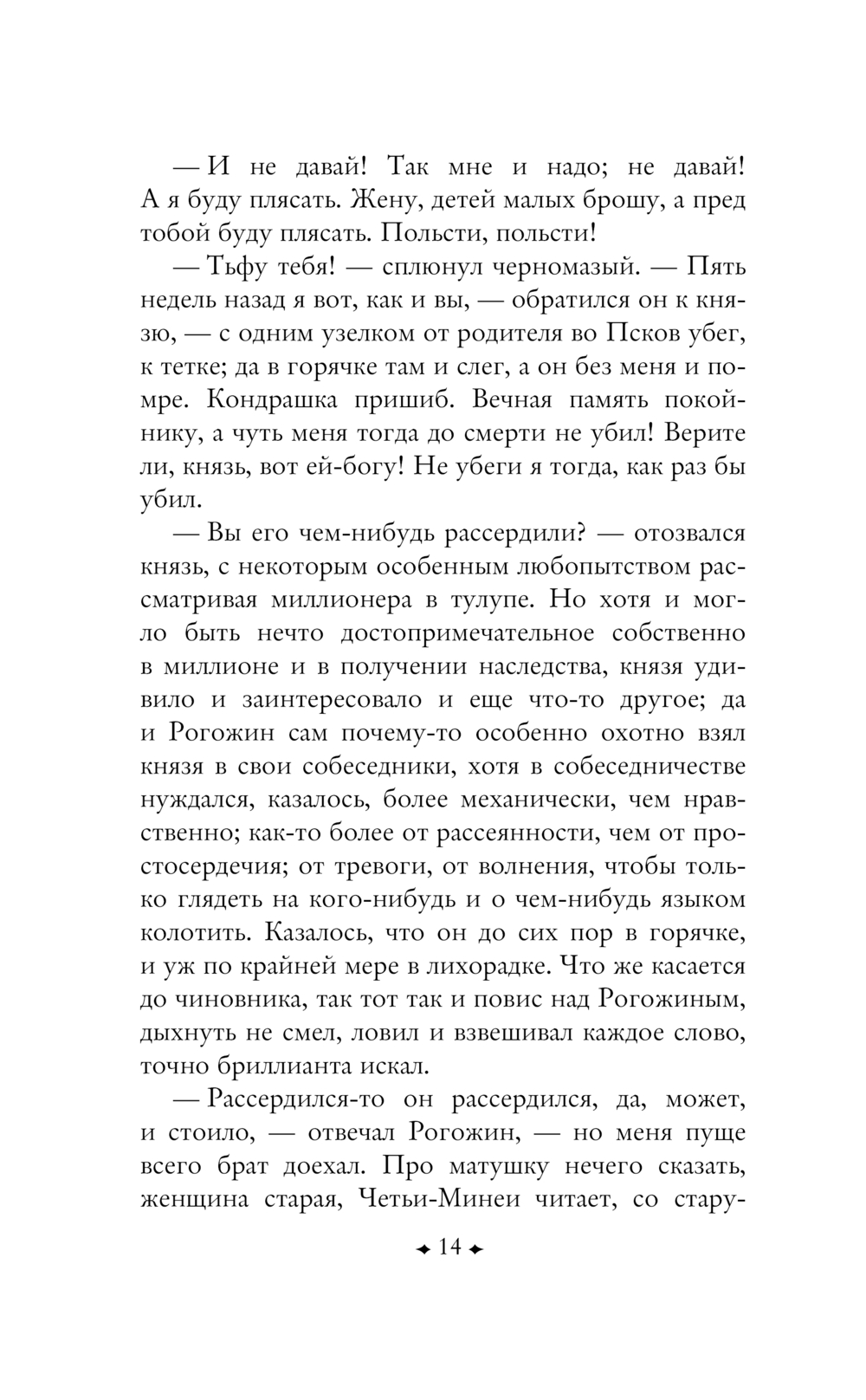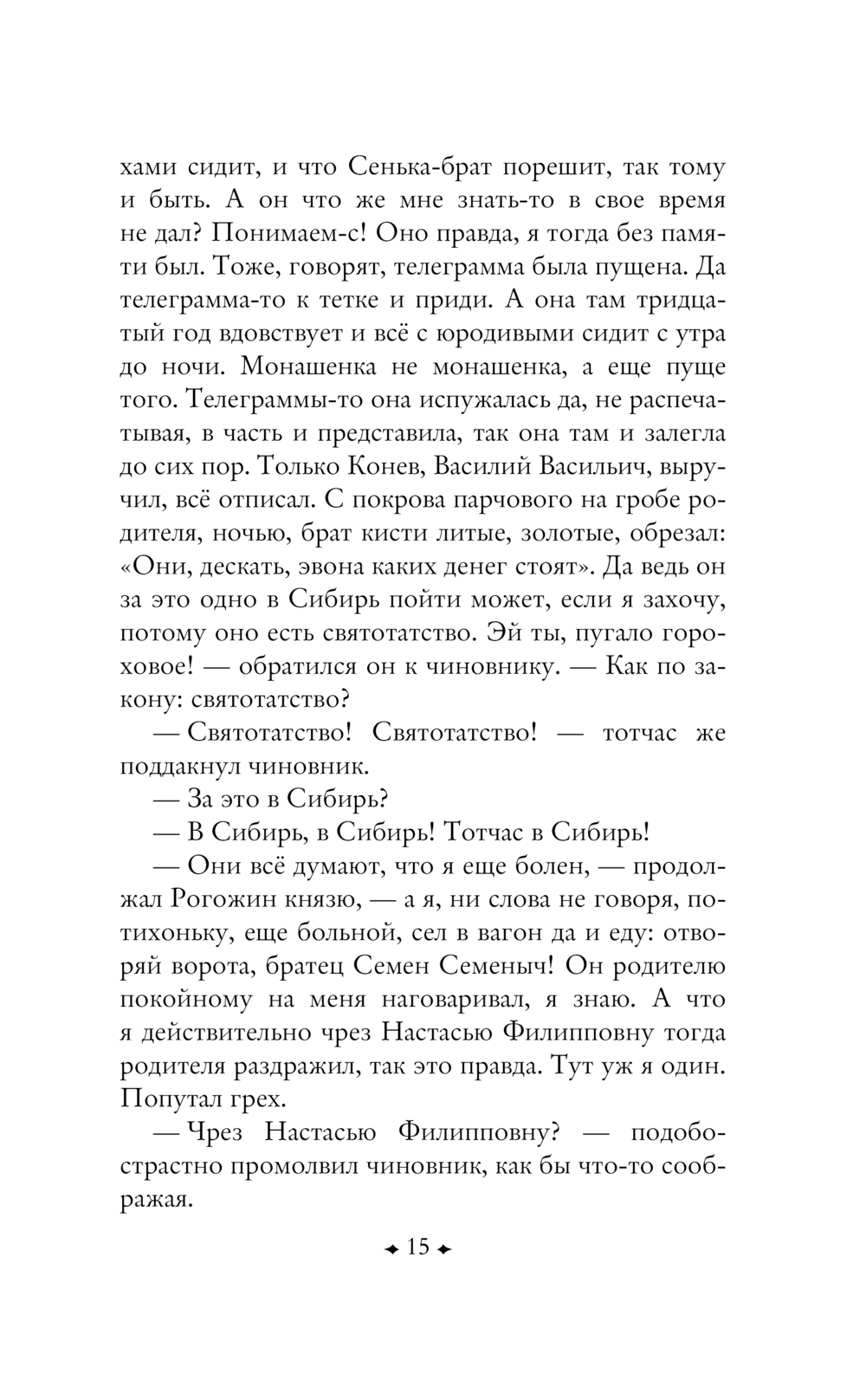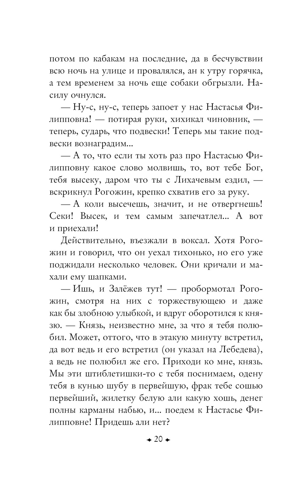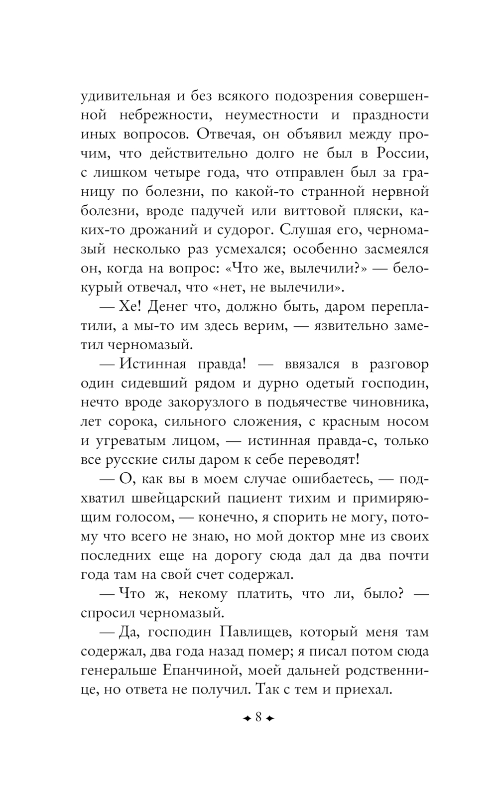 Такие насыщенные сюжеты всегда "обречены" вызывать в читателе автоматический эффект присутствия. Секрет не только и не столько в событийных перипетиях, сколько в великолепно выписанных персонажах и электрических разрядах между ними. Суммой всех слагаемых становится превращение эффекта присутствия в "эффект соучастия": погружаясь в роман, вы становитесь сначала невидимым свидетелем событий, а потом сживаетесь с главным героем так прочно, что смотрите его глазами и меряете его мир биением собственного сердца. И тогда возникает главный вопрос: как выжить в этом мире, который казался вымышленным и вдруг стал таким реальным, и как здесь не сойти с ума. В конце концов, может ли общество определять степень чьей-то "нормальности"? Вообще, кто из нас князь Мышкин?