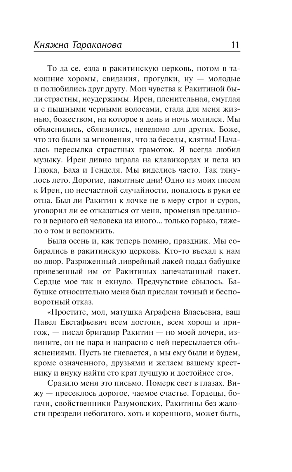 Действие романа "Княжна Тараканова" начинается зимой 1775 года. В Европе появляется молодая аристократка, назвавшая себя дочерью императрицы Елизаветы от ее тайного брака с фаворитом Алексеем Разумовским. Княжна Тараканова заявляет о своих правах на российский престол и пытается заручиться поддержкой европейских монархов и влиятельных русских дворян, в том числе могущественного графа Орлова. Княжна и не подозревает, что государыня Екатерина уже велела верному ей графу изловить "авантюрьеру" и доставить в Петербург.