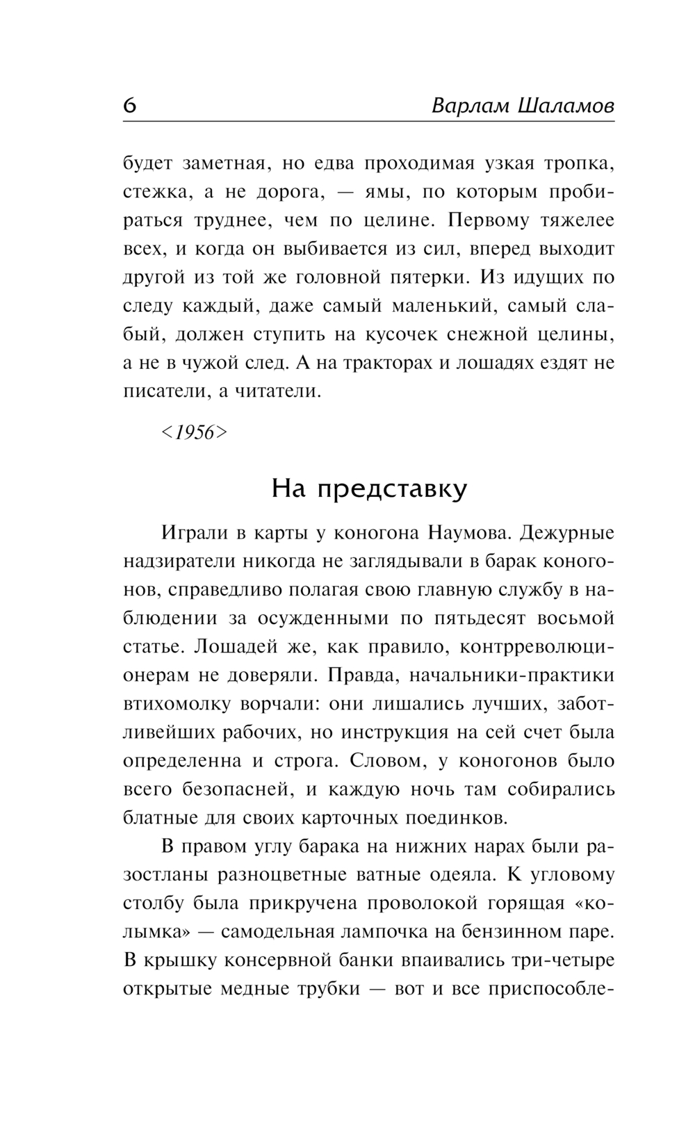 Современный читатель, знакомый со множеством произведений "лагерной" литературы и свободный от политизированных штампов, может по достоинству оценить глубокое художественное своеобразие рассказов Шаламова.
