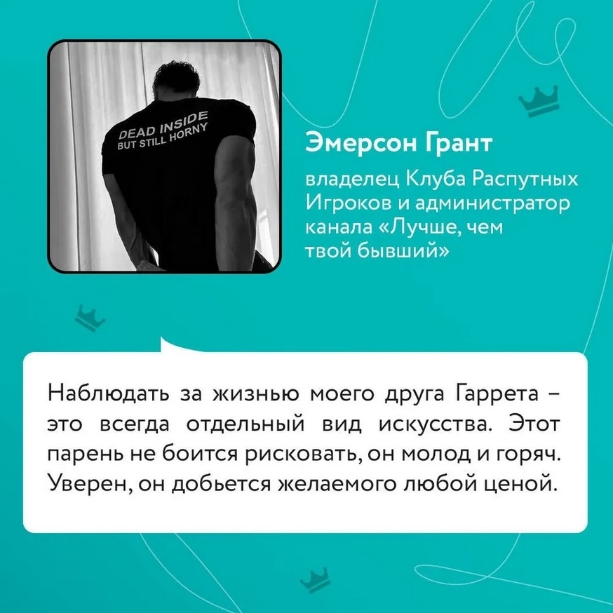 Я давно завязал с любыми отношениями и с головой ушел в работу. Забавно, ведь она напрямую связана с удовольствием... Я остаюсь в тени, мне нравится наблюдать, если ты понимаешь о чем я.