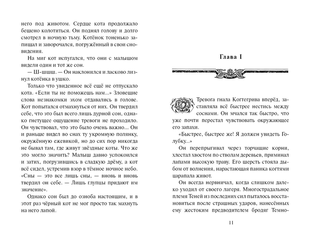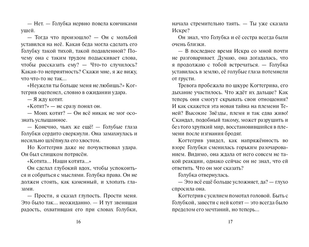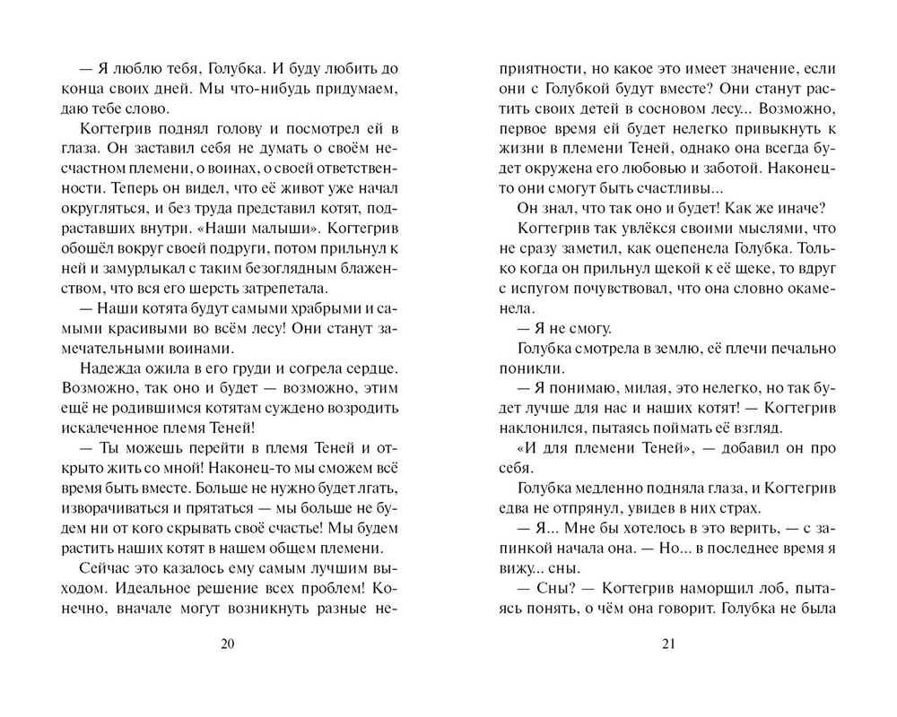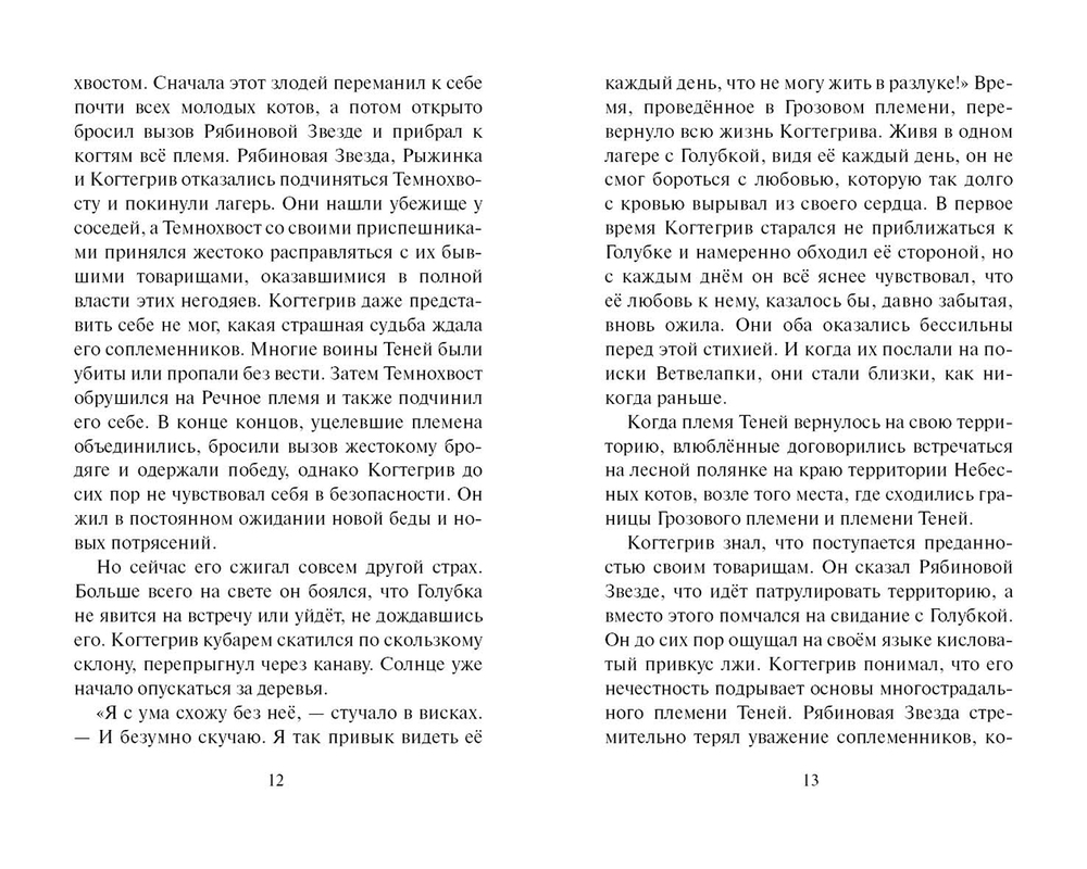 Некогда гордое племя Теней оказалось на краю гибели, и Когтегрив вынужден был взять на себя ответственность за судьбу своих товарищей. Лишь одна тайна всегда стояла между глашатаем и его преданностью племени – любовь к Грозовой воительнице Голубке.