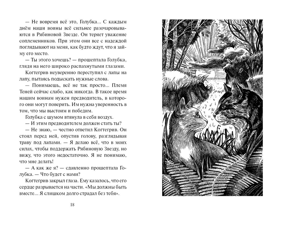 Между тем, племя Теней слабеет, предводитель стремительно теряет авторитет, а пророчества звёзд сулят новые испытания. И когда целитель Лужесвет получает загадочное послание, Когтегрив внезапно понимает, что единственная возможность спасти племя – навсегда его покинуть. Отныне его преданность будет принадлежать только Голубке и их будущим котятам.