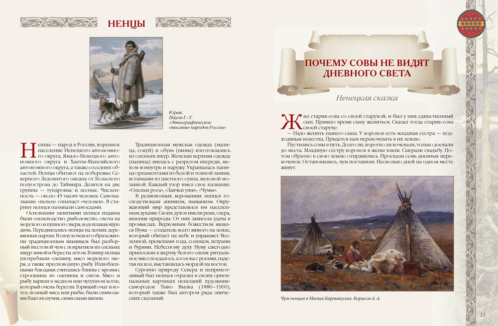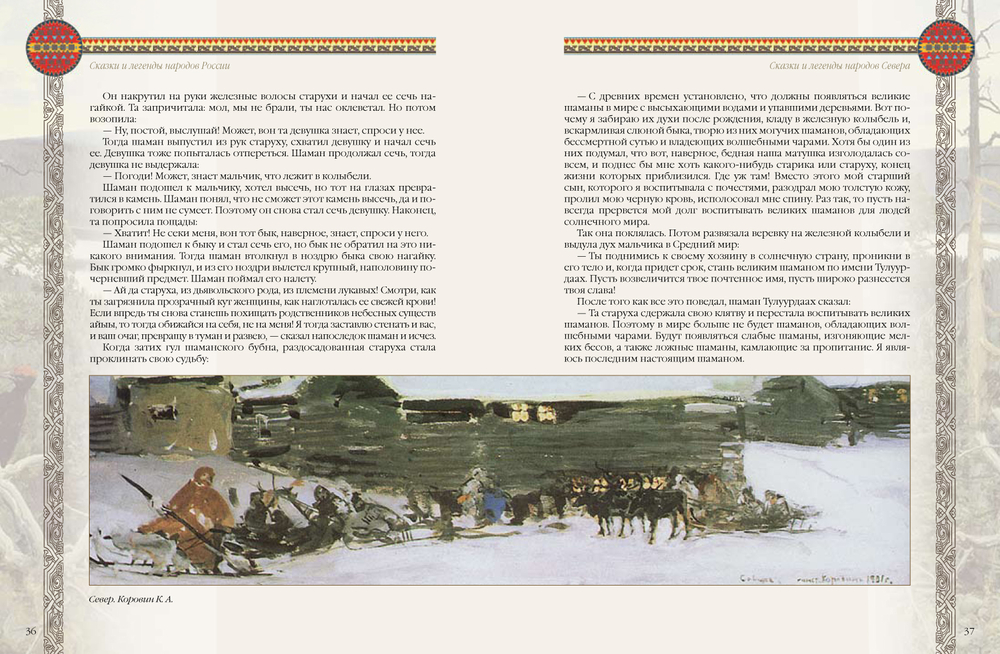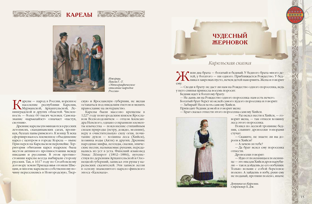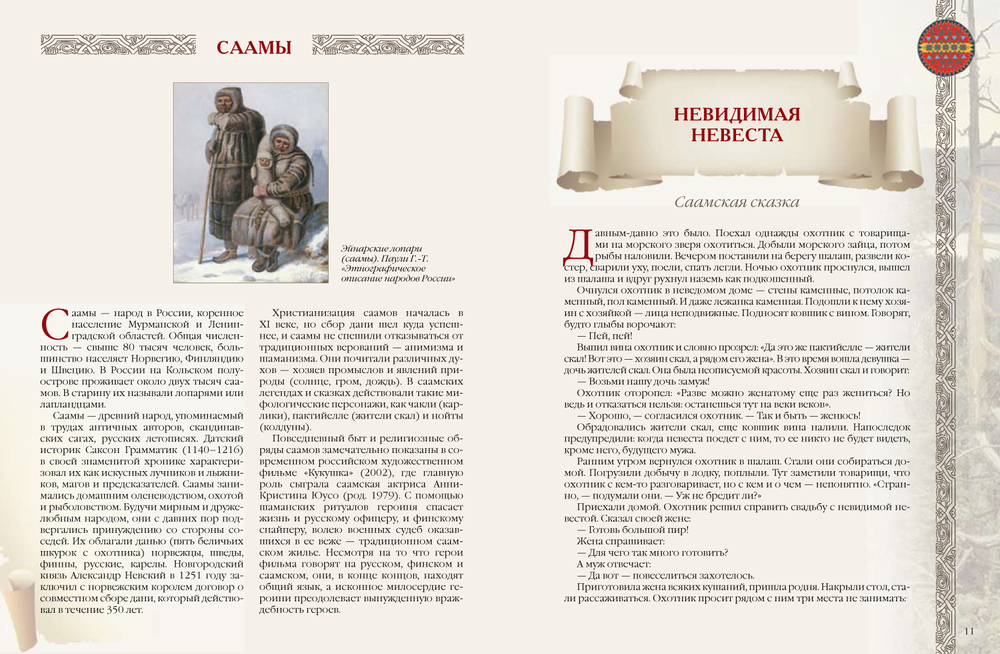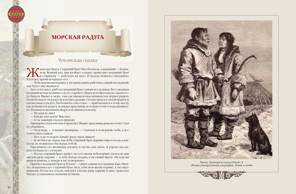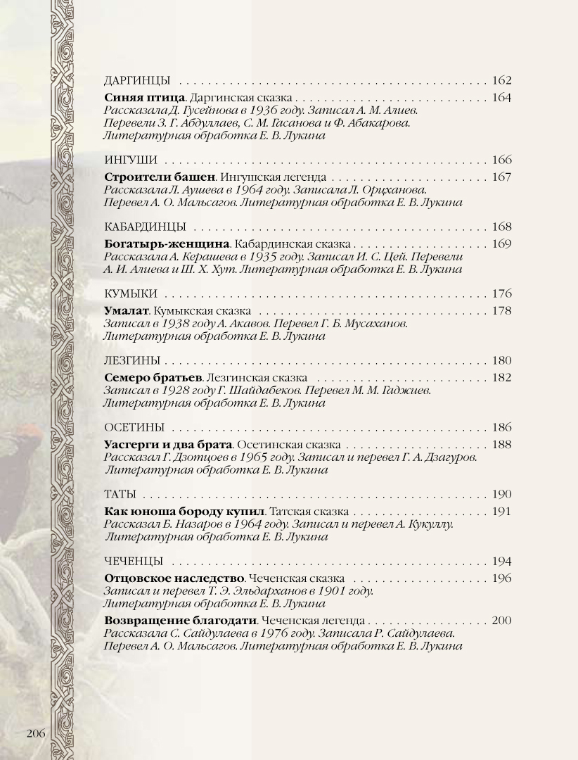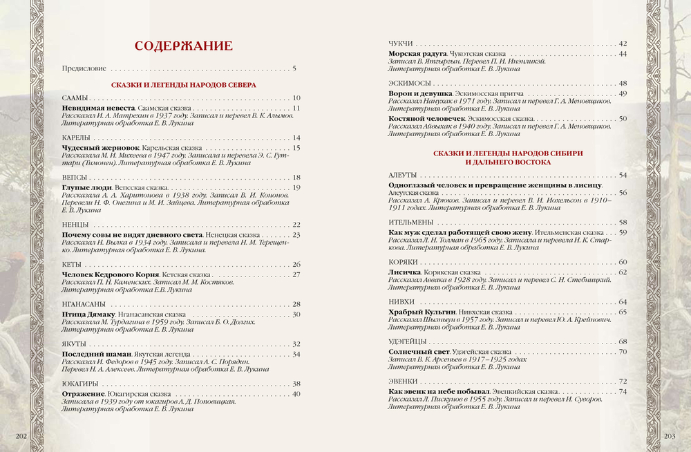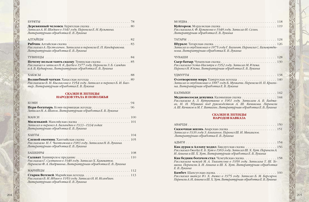 В издании представлены образцы народного творчества карелов, ненцев, чукчей, эскимосов, якутов, бурят, татар, башкир, чувашей, чеченцев, адыгов и многих других. Тексты сказок и легенд даны в литературной обработке петербургского писателя и историка Евгения Лукина. Издание богато иллюстрировано классическими изображениями представителей народностей в национальных костюмах, картинами повседневного народного быта и природных ландшафтов.