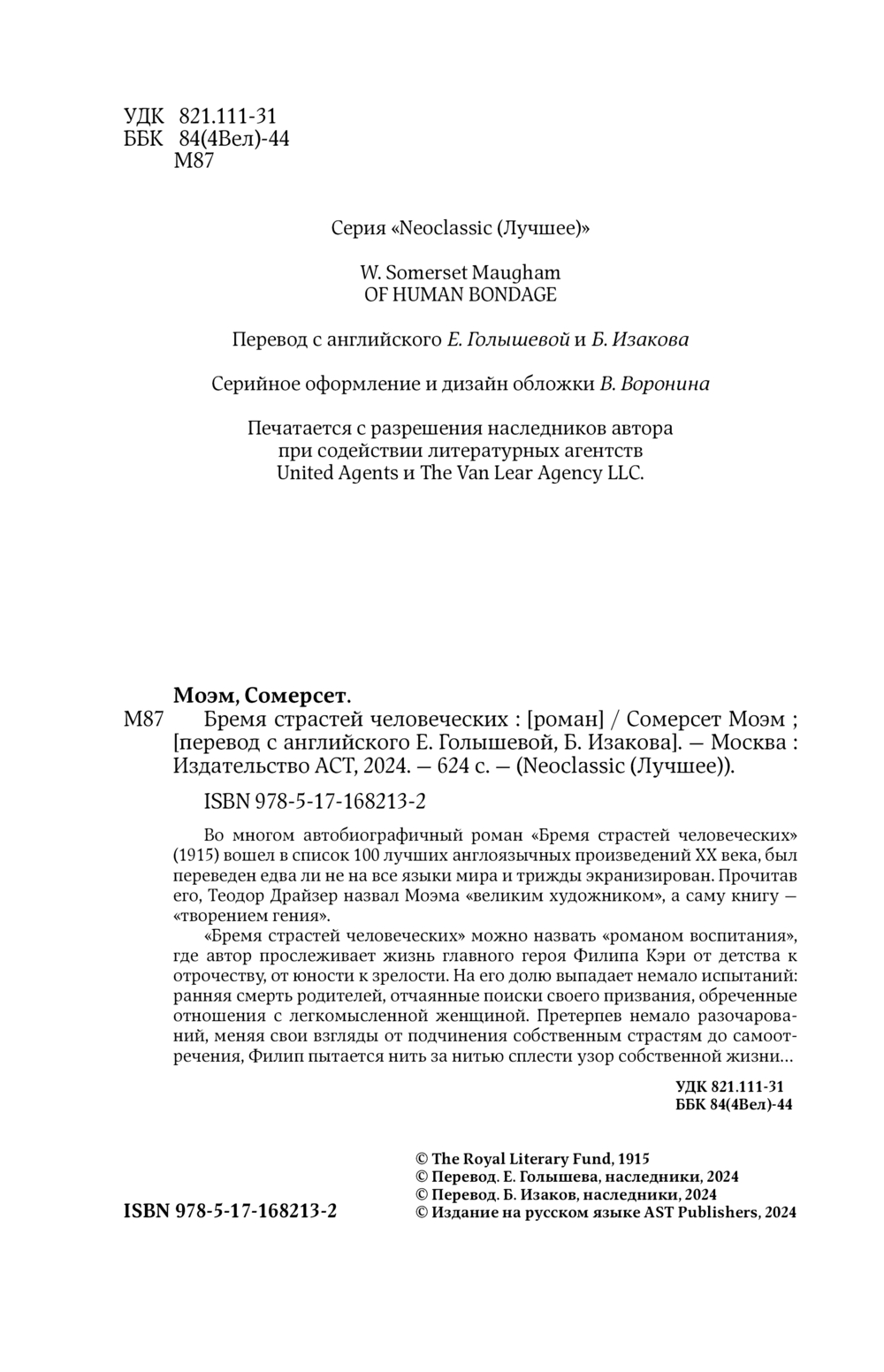 Во многом автобиографичный роман "Бремя страстей человеческих" (1915) вошел в список 100 лучших англоязычных произведений XX века, был переведен едва ли не на все языки мира и трижды экранизирован. Прочитав его, Теодор Драйзер назвал Моэма "великим художником", а саму книгу – "творением гения".