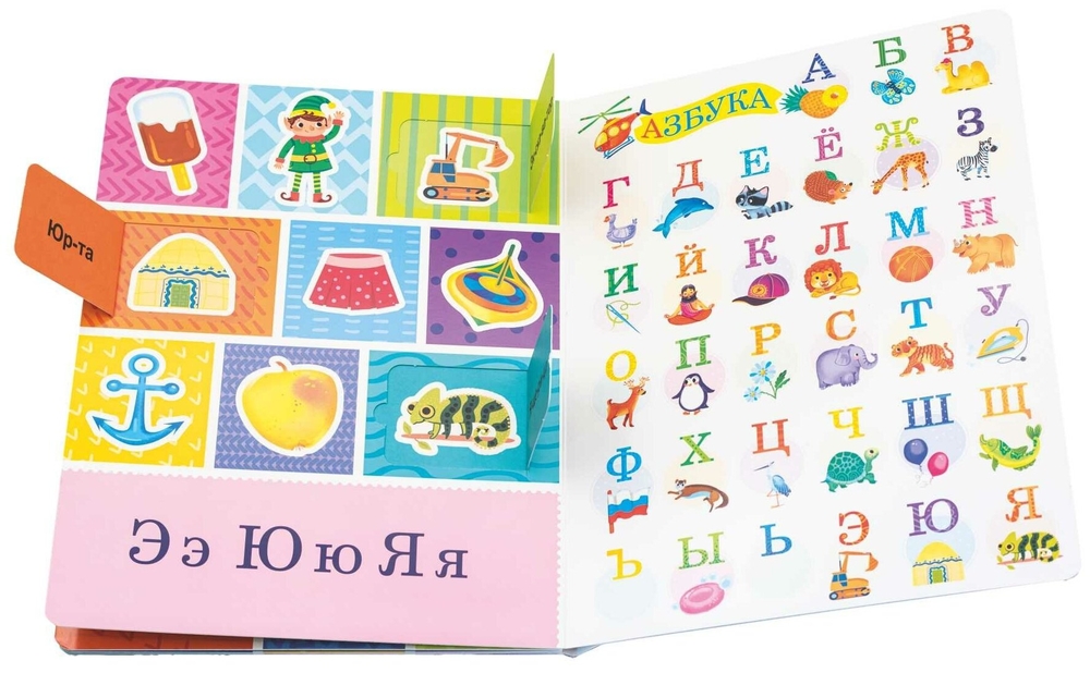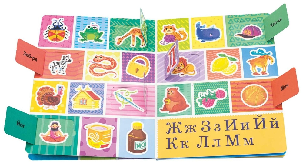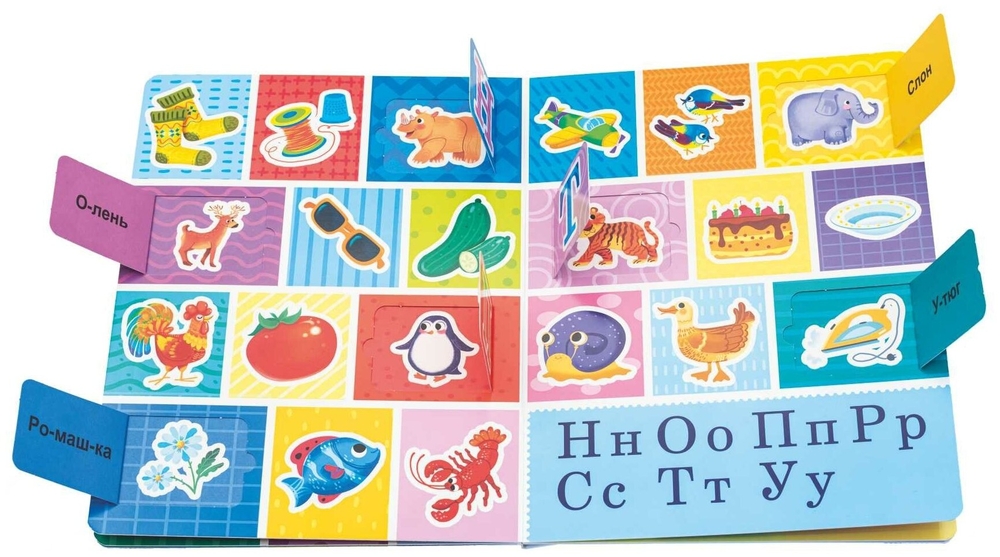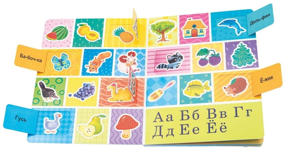 Эта книжка предназначена для первого знакомства малыша с буквами. Крупные яркие рисунки и узнаваемые образы помогут сделать первые шаги в мир грамоты. Картинки на каждую букву можно отыскать на страницах книг и в окошках-створках.