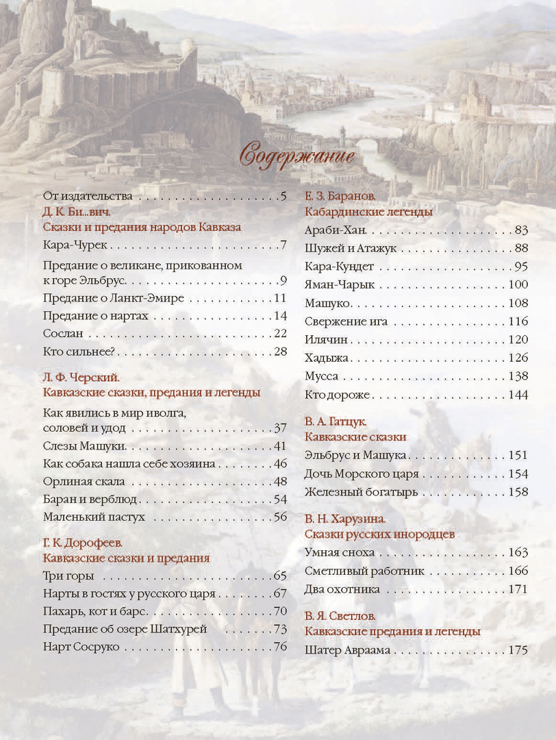 В сборнике представлено более тридцати кавказских сказок и легенд, любовно собранных и переработанных русскими фольклористами Л. Ф. Черским, Г. К. Дорофеевым, Е. З. Барановым, В. А. Гатцуком, В. Н. Харузиной, В. Я. Светловым и другими.