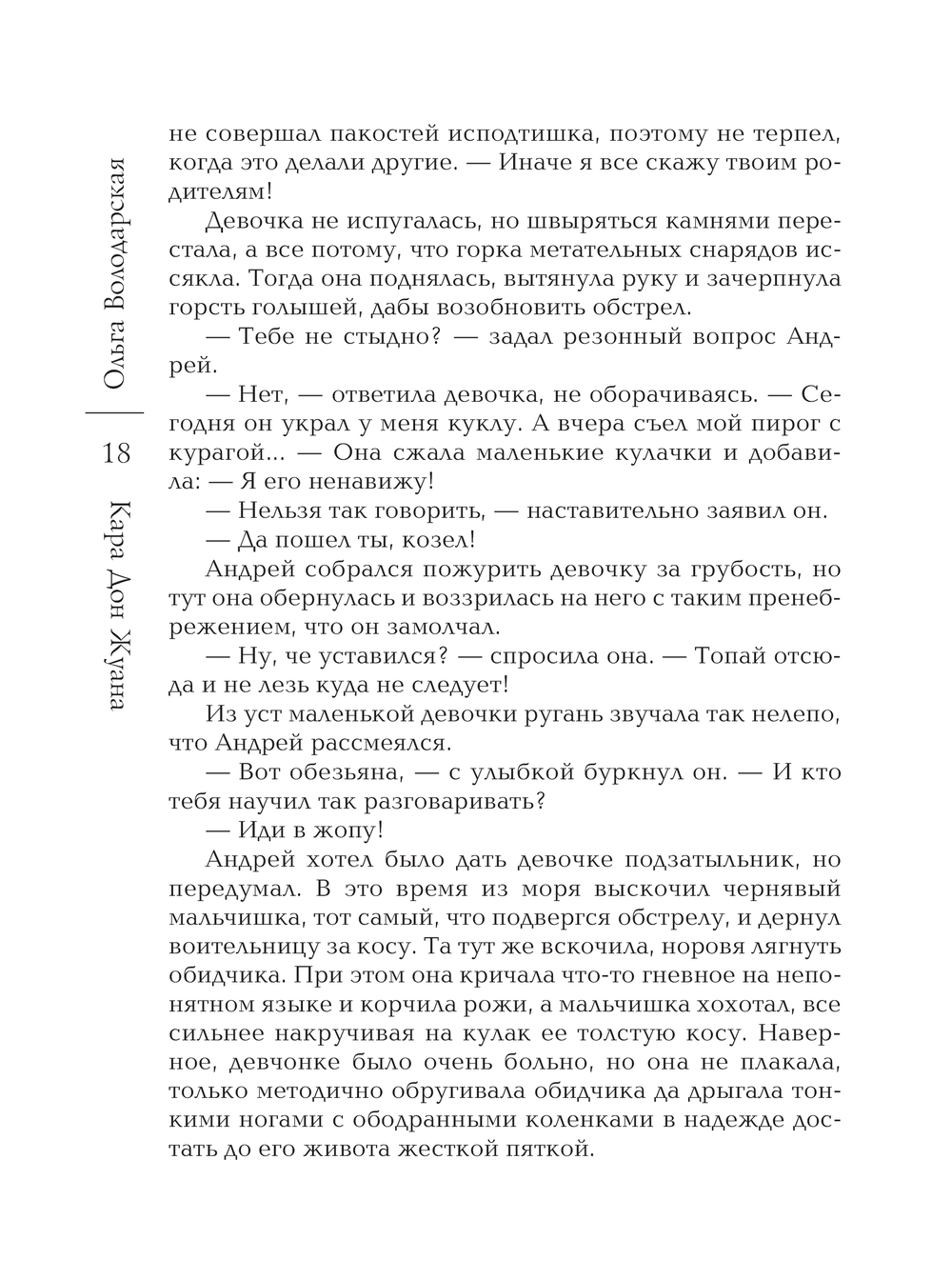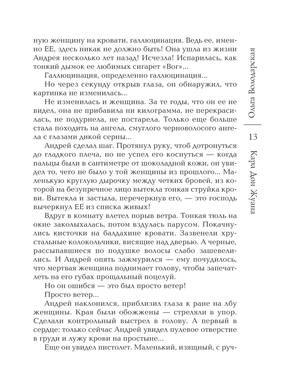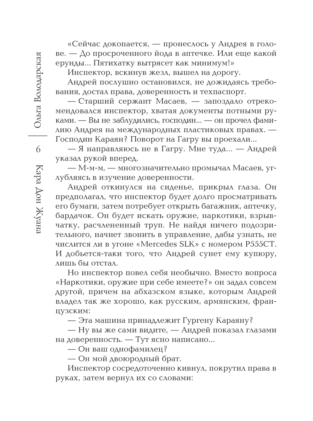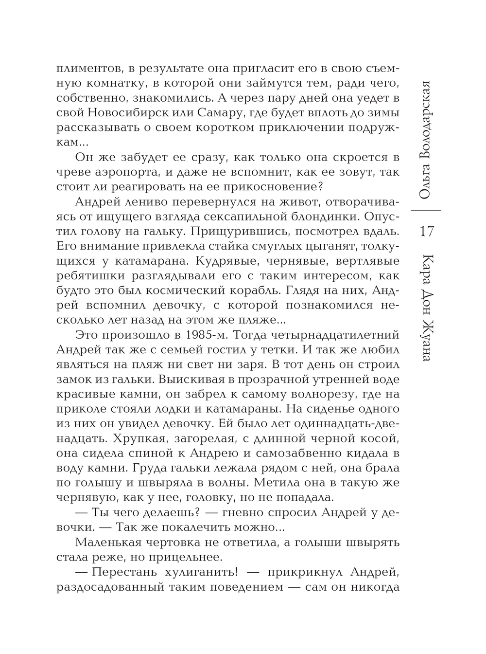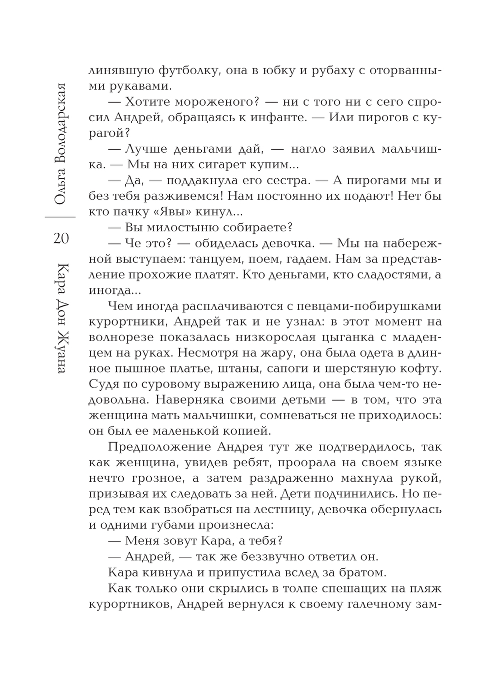 У нее было удивительное имя – Кара! Андрей познакомился с ней много лет назад, когда она танцевала на набережной. Черноглазая дикарка с грязными пятками, она стала первой любовью Андрея. Первой любовью, женой, судьбой и... карой! Их счастье было скоротечным, расставание неожиданным, разлука долгой, а воссоединение запоздалым – Кару похитили спустя год после свадьбы. Десять лет Андрей искал ее, а нашел только теперь, когда она мертва...