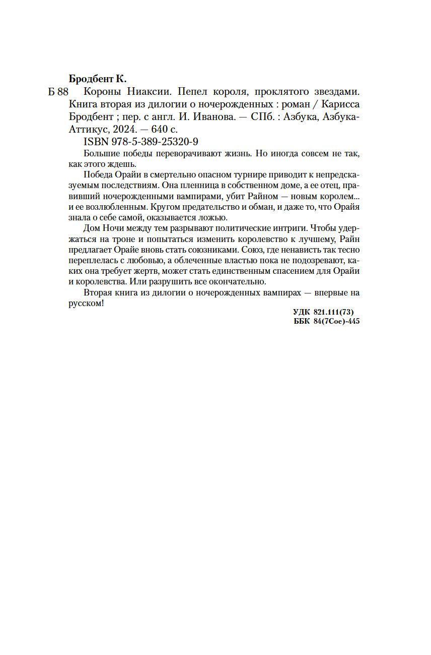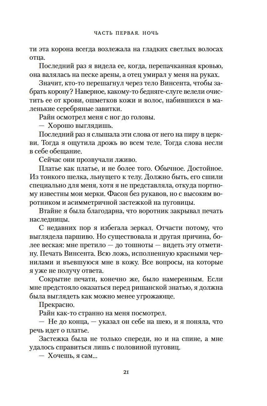Победа Орайи в смертельно опасном турнире приводит к непредсказуемым последствиям. Она пленница в собственном доме, а ее отец, правивший ночерожденными вампирами, убит Райном – новым королем... и ее возлюбленным. Кругом предательство и обман, и даже то, что Орайя знала о себе самой, оказывается ложью.