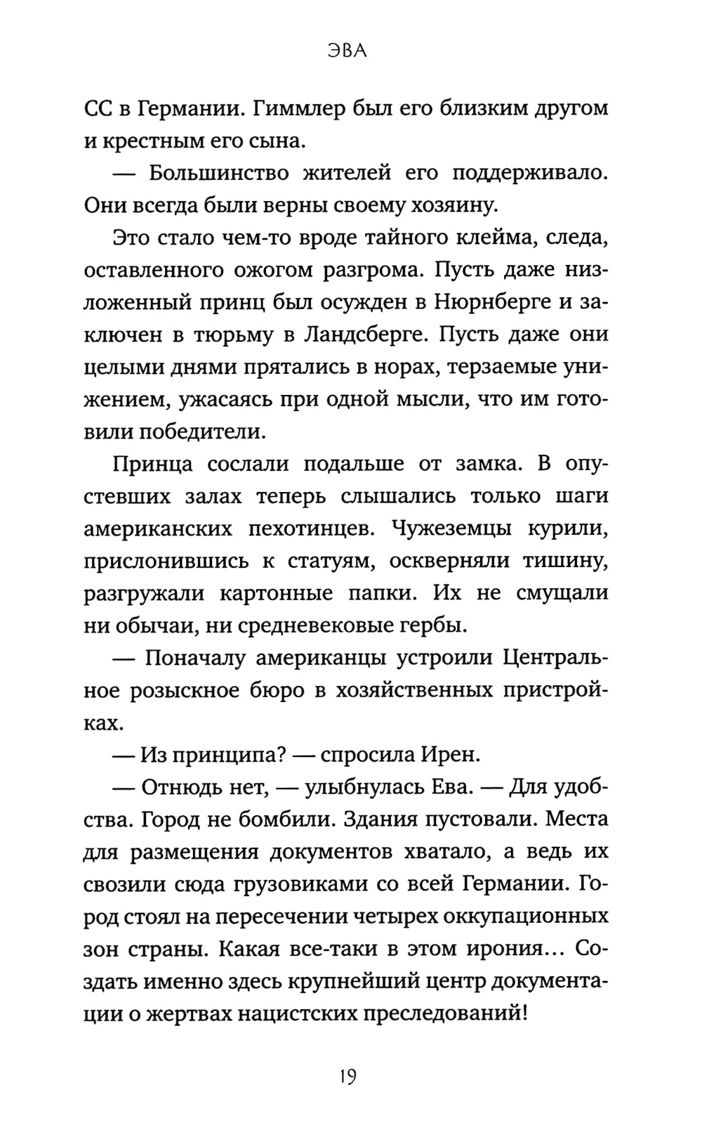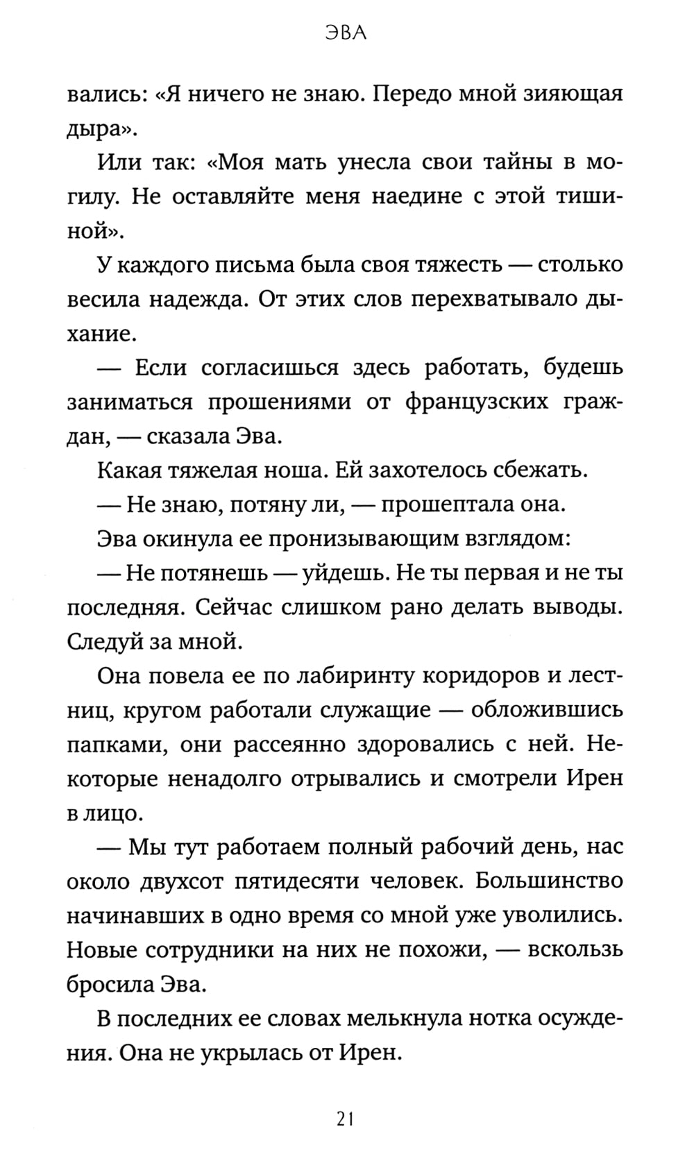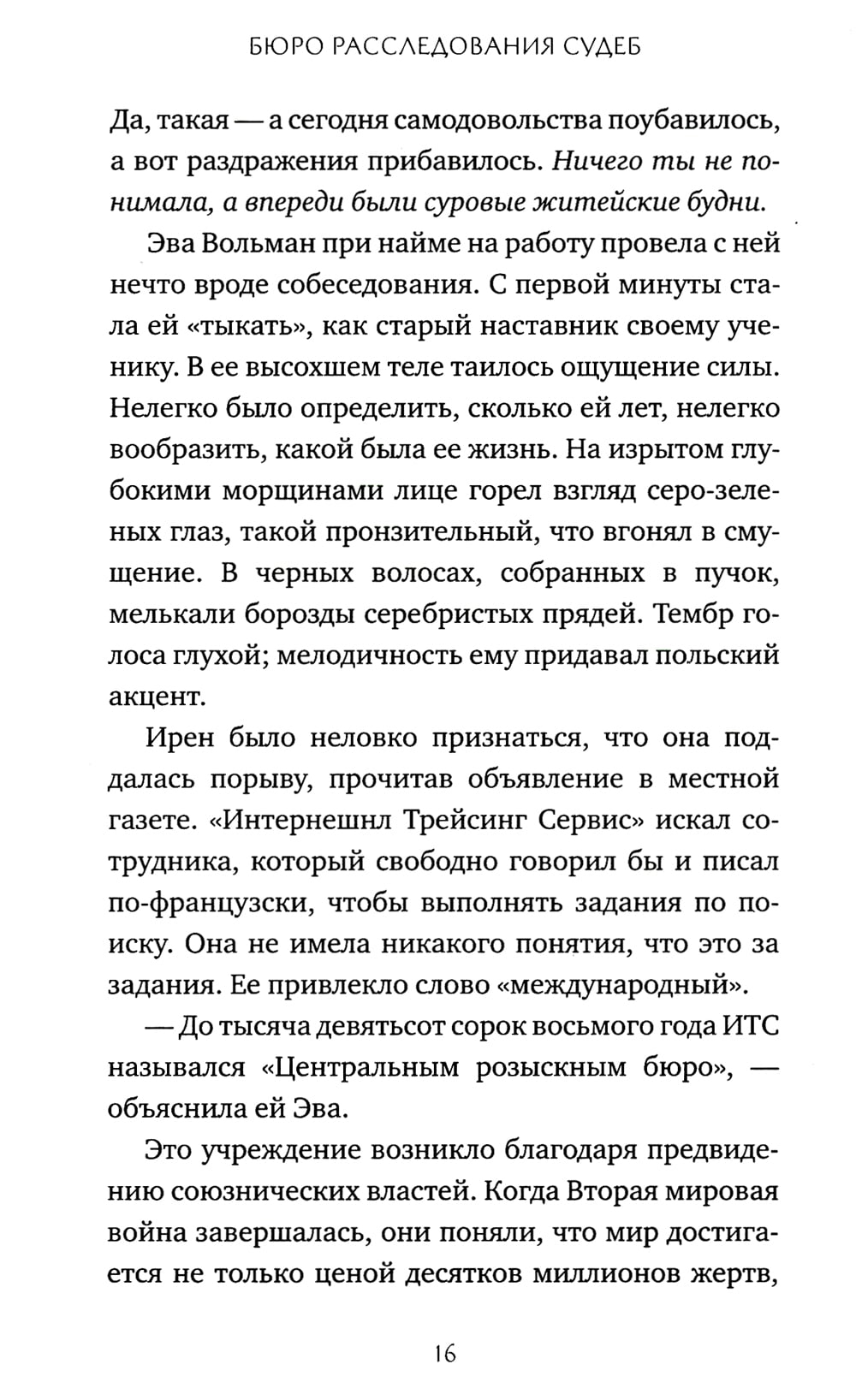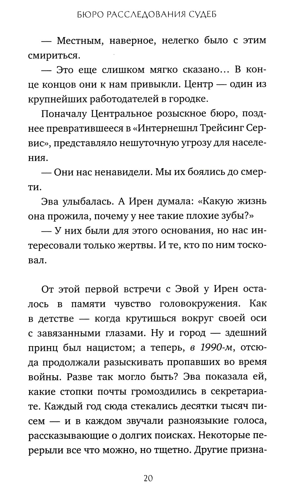 Ирен работает в агентстве, которое занимается расследованием преступлений немецких фашистов. Ее насущная задача – вернуть владельцам тысячи и тысячи вещей, найденных на территории концентрационных лагерей. За каждой вещью стоит судьба человека, и Ирен, совершенно не жалея себя, разбивая вдребезги личную жизнь, пытается заниматься реконструкцией. Что, например, может рассказать выцветшая кукла Пьеро, или медальон с Богородицей, или несвежий платок с вышивкой? Какие тайны их окружают? Кто они, их владельцы, попавшие в горнило истории, и кто их потомки?