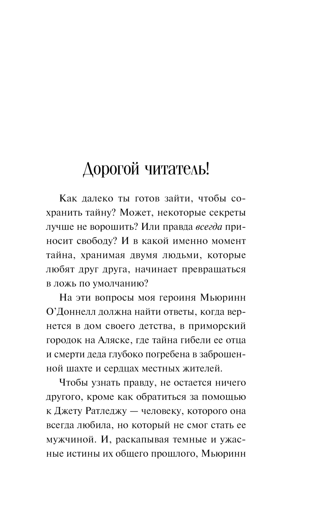Журналистка Мьюринн О'Доннелл возвращается в родной город на Аляске, чтобы расследовать таинственную смерть отца и деда. Она просит помощи у единственного человека, которому доверяет – пилота Джета Ратледжа, своей первой любви.