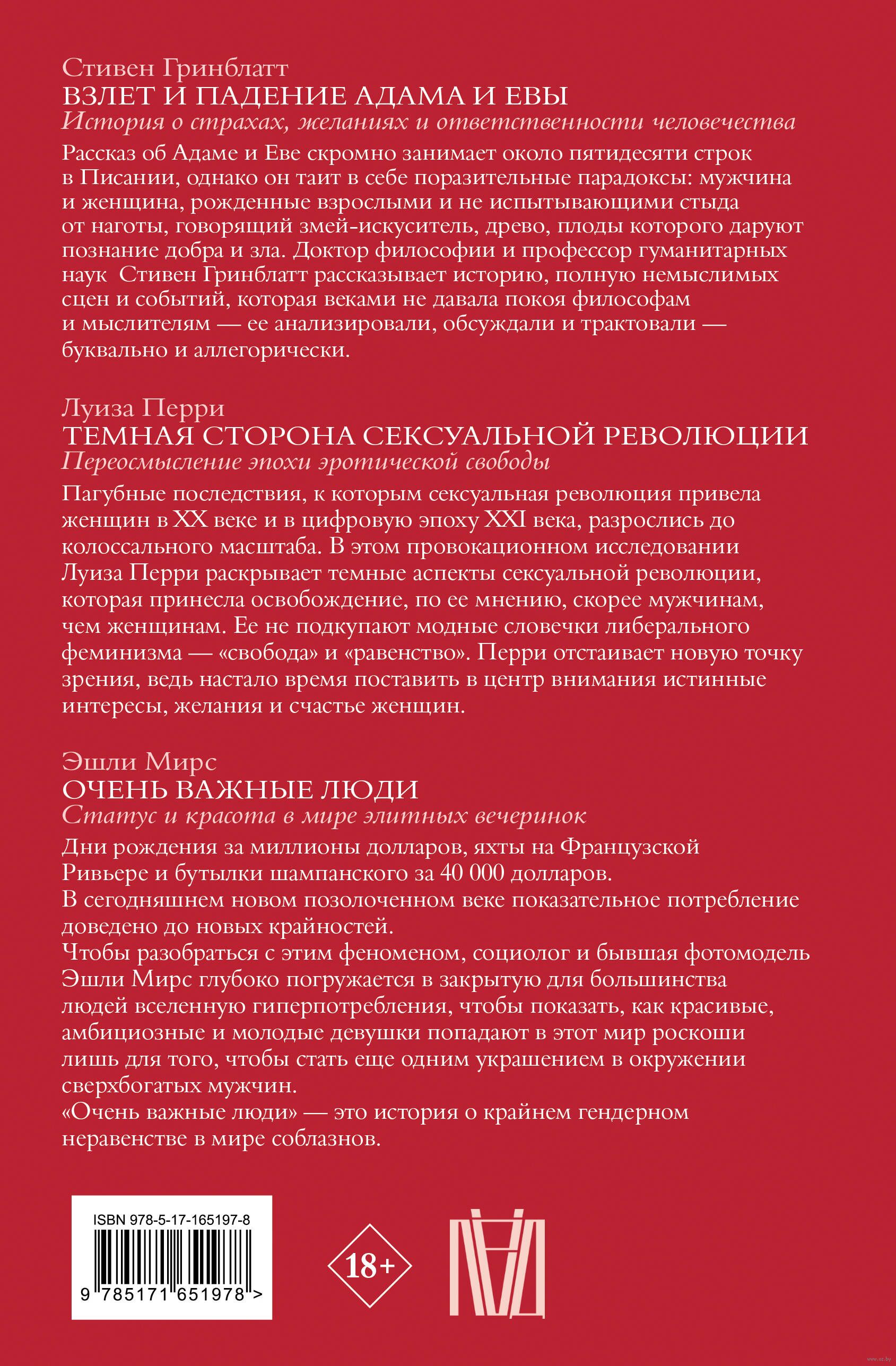 Пагубные последствия, к которым сексуальная революция привела женщин в XX веке и в цифровую эпоху XXI века, разрослись до колоссального масштаба. В этом провокционном исследовании Луиза Перри раскрывает темные аспекты сексуальной революции, которая принесла освобождение, по ее мнению, скорее мужчинам, чем женщинам. Ее не подкупают модные словечки либерального феминизма – "свобода" и "равенство". Перри отстаивает новую точку зрения, ведь настало время поставить в центр внимания истинные интересы, желания и счастье женщин.