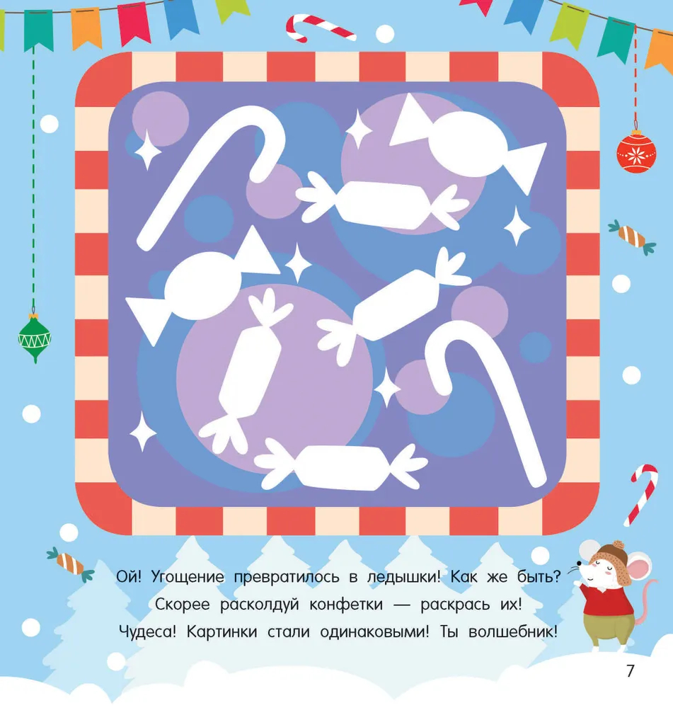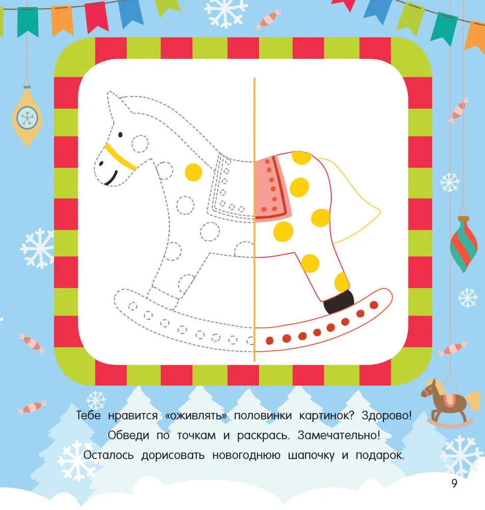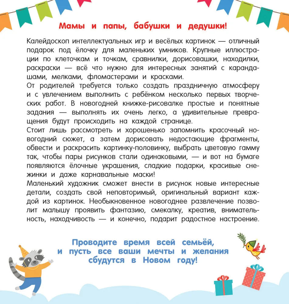 Книжка "Новогодний маскарад" – коллекция красочных и ярких новогодних картинок с цветными образцами. Это отличный подарок малышам к Новому году. Обводить, сравнивать, дорисовывать и раскрашивать забавные рисунки на плотной бумаге можно цветными карандашами, фломастерами, мелками, пальчиковыми красками. Игры-рисовашки тренируют интеллект, мелкую моторику, зрительное восприятие и координацию движений руки, и конечно, поднимают настроение и создают праздничную атмосферу.