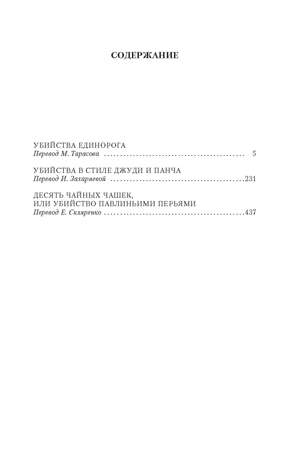 В настоящем сборнике представлены романы "Убийства единорога", "Убийства в стиле Джуди и Панча" и "Десять чайных чашек, или Убийство павлиньими перьями", которые продолжают серию о великолепном сэре Генри Мерривейле – обаятельном, эксцентричном, взбалмошном толстяке, ставшем, по признанию критиков, одним из самых неординарных сыщиков в детективной литературе.