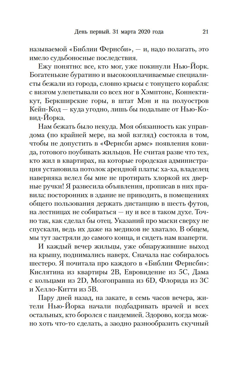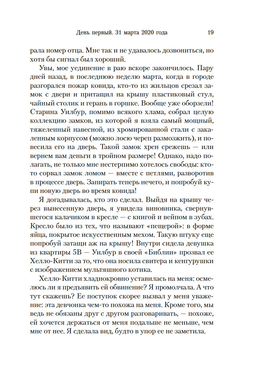Пандемия 2020 года еще раз доказала, что история, при всей жестокости ее уроков, ничему нас не учит. Нашествие вируса посеяло не меньшую панику, чем в Средние века. Были те, кто, подобно героям "Декамерона", бежал из больших городов, а кому-то бежать было некуда и пришлось самоизолироваться в четырех стенах. Эти люди и стали героями уникального романа в новеллах, созданного 36 авторами под редакцией таких признанных мастеров, как Маргарет Этвуд и Дуглас Престон, и при поддержке Гильдии писателей США. Книга названа событием в мире литературы – это своего рода головоломка, напоминающая великий роман-эксперимент Жоржа Перека "Жизнь, способ употребления".