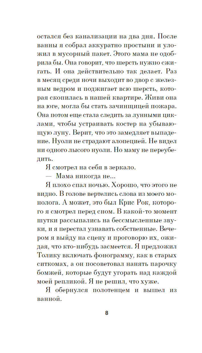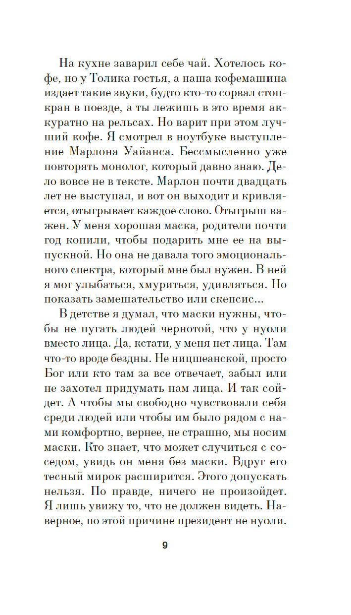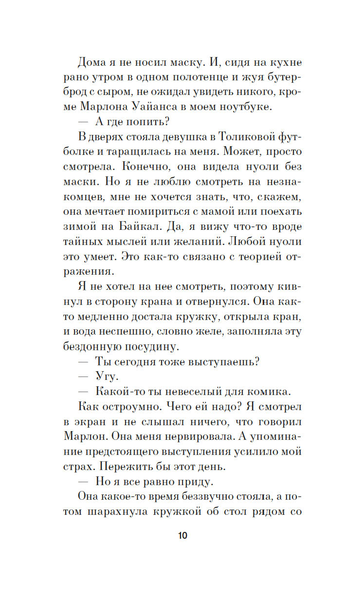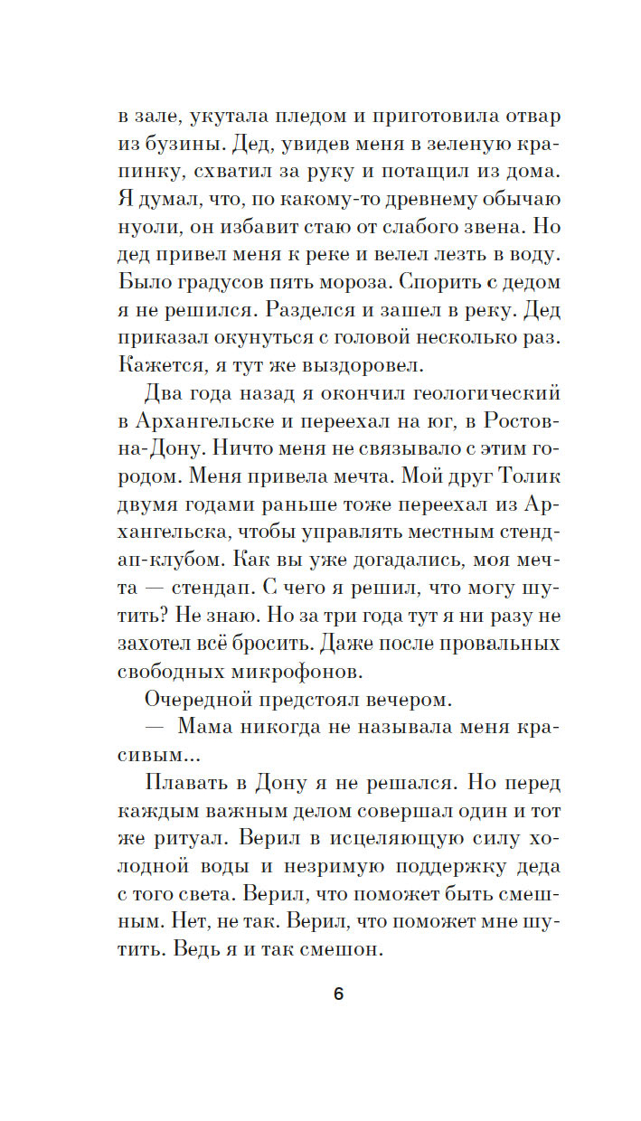 Йалка Симонов – обычный парень, если не считать того, что он представитель нуоли – древнего северного народа. Тела нуоли покрыты густой шерстью, а вместо лица у них бездна, поэтому нуоли вынуждены носить специальные маски. Йалка живет в Ростове-на-Дону, работает в офисе, мечтает сделать карьеру в стендапе (пока получается не очень) и в целом ощущает себя неудачником. Но Йалка отлично знает, что ему никогда не удастся слиться с окружающим ландшафтом: он слишком не похож на остальных. Впрочем, и от культуры нуоли Йалка отдаляется все больше. Единственный ритуал, который он неукоснительно выполняет, – купание в холодной воде (не важно, в ванне или реке): это придает ему сил. Надеясь что-то понять о себе, Йалка записывается на сценические курсы; параллельно с этим новым увлечением он влюбляется в коллегу – Натали, но ответит ли она ему взаимностью? И как быть с Элиной, девушкой-нуоли, которая, кажется, собирается выйти за него замуж? А главное, что делать с самим собой? "Как найти себя, когда ты с собой каждый день?"