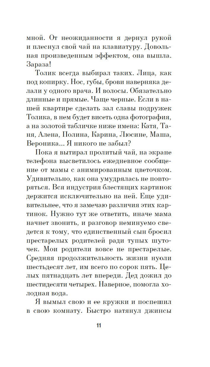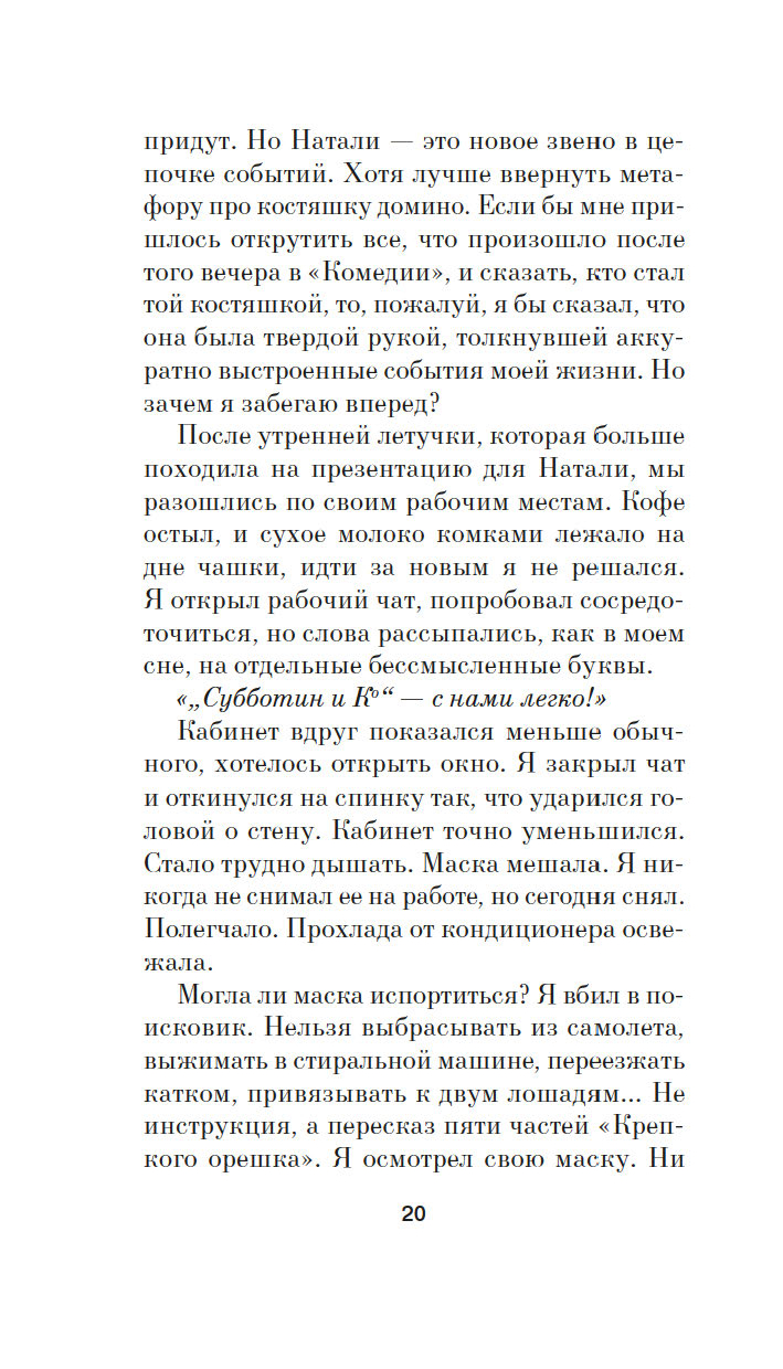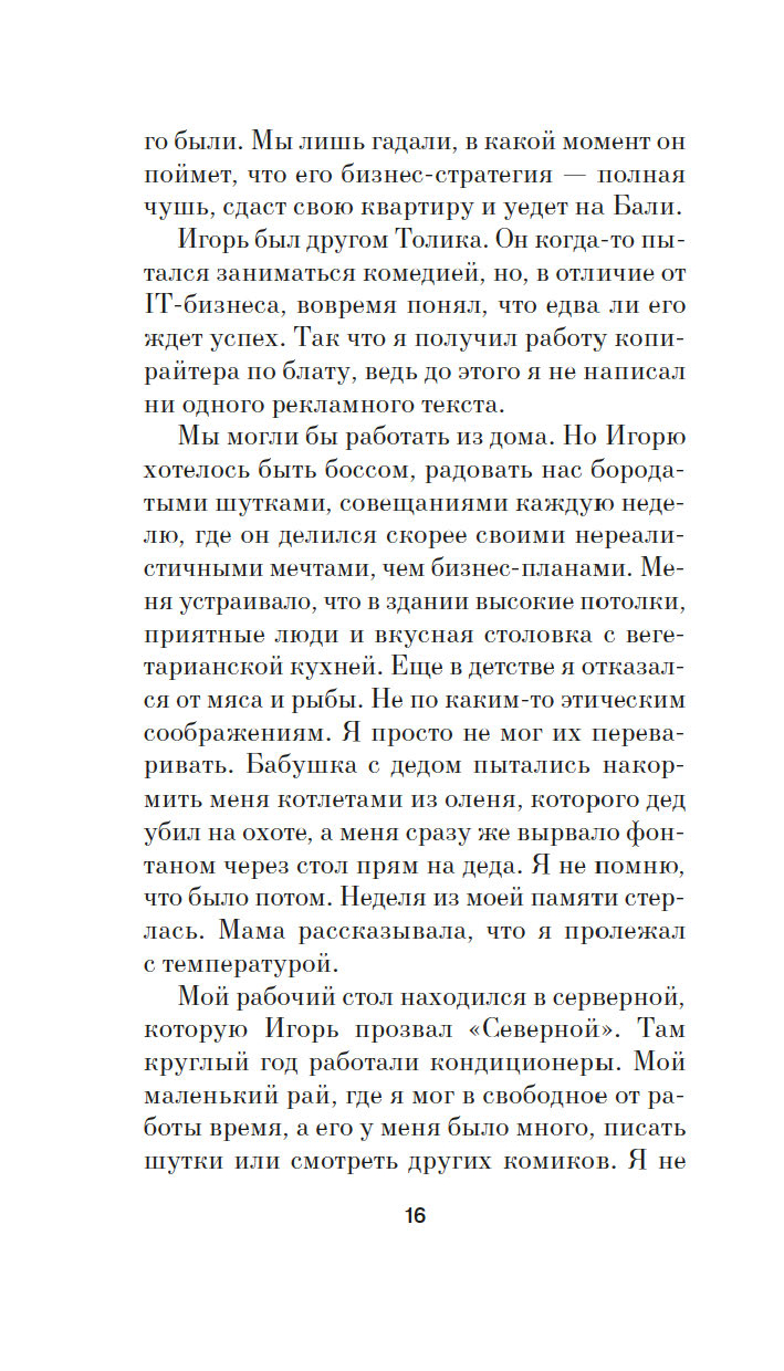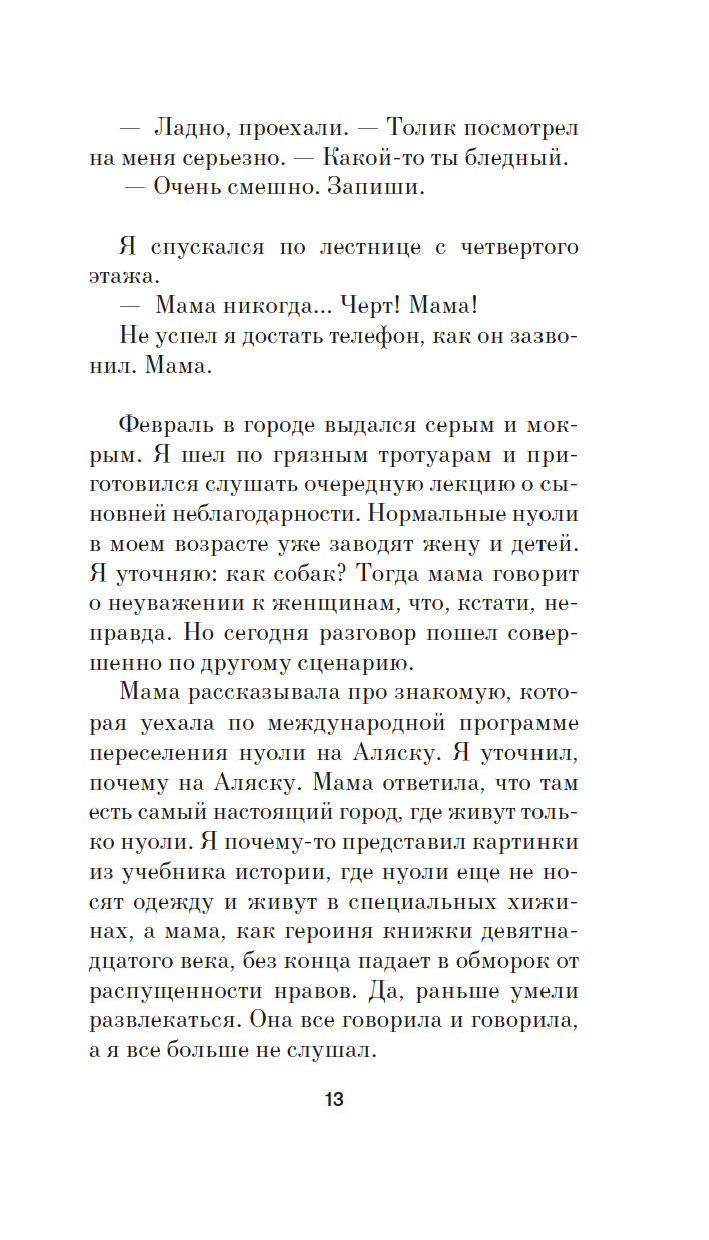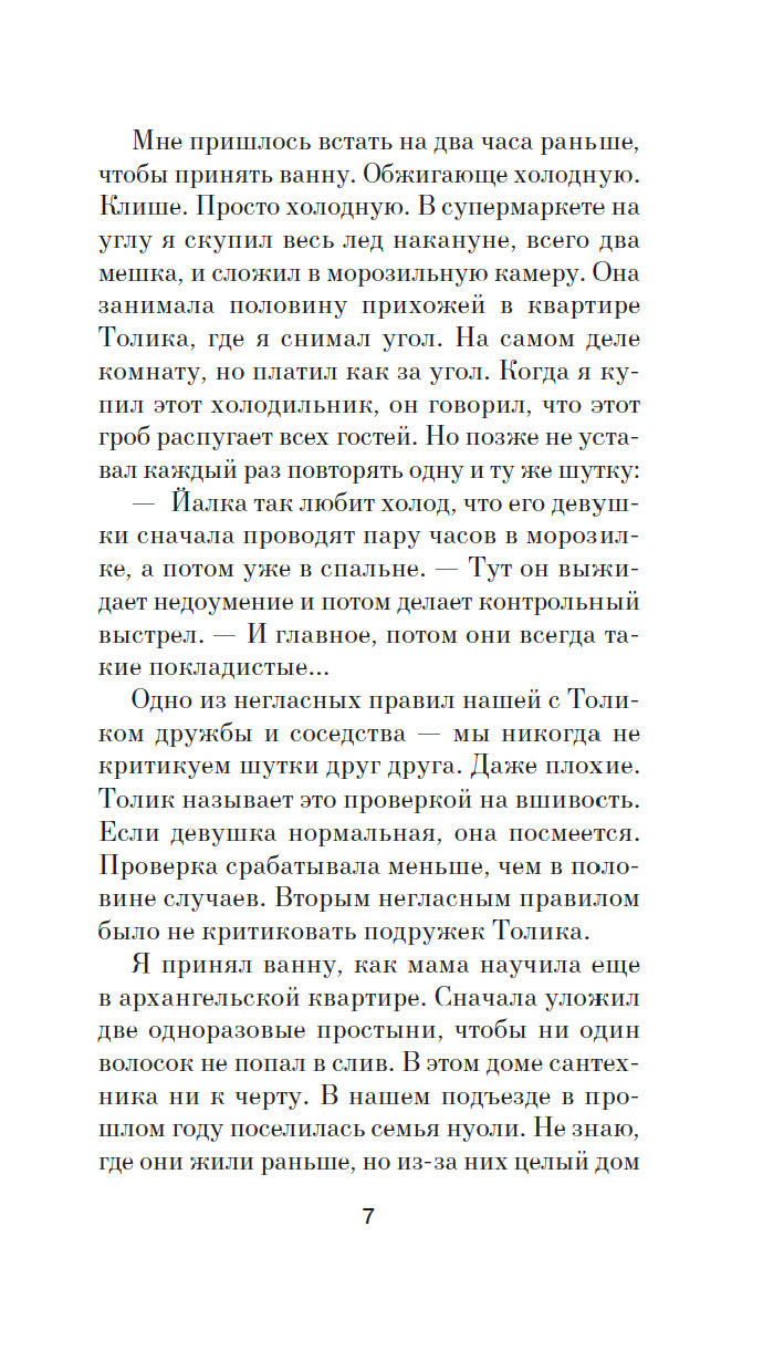 Йалка Симонов – обычный парень, если не считать того, что он представитель нуоли – древнего северного народа. Тела нуоли покрыты густой шерстью, а вместо лица у них бездна, поэтому нуоли вынуждены носить специальные маски. Йалка живет в Ростове-на-Дону, работает в офисе, мечтает сделать карьеру в стендапе (пока получается не очень) и в целом ощущает себя неудачником. Но Йалка отлично знает, что ему никогда не удастся слиться с окружающим ландшафтом: он слишком не похож на остальных. Впрочем, и от культуры нуоли Йалка отдаляется все больше. Единственный ритуал, который он неукоснительно выполняет, – купание в холодной воде (не важно, в ванне или реке): это придает ему сил. Надеясь что-то понять о себе, Йалка записывается на сценические курсы; параллельно с этим новым увлечением он влюбляется в коллегу – Натали, но ответит ли она ему взаимностью? И как быть с Элиной, девушкой-нуоли, которая, кажется, собирается выйти за него замуж? А главное, что делать с самим собой? "Как найти себя, когда ты с собой каждый день?"