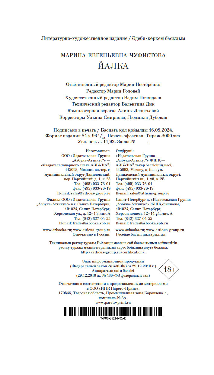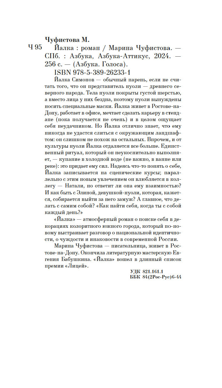 Марина Чуфистова – писательница, живет в Ростове-на-Дону. Окончила литературную мастерскую Евгения Бабушкина. "Йалка" вошел в длинный список премии "Лицей".