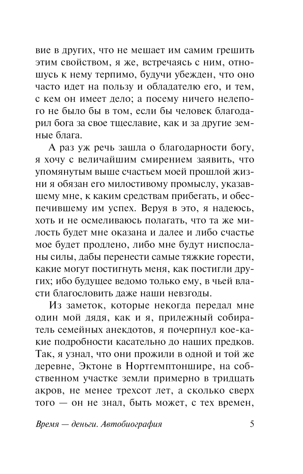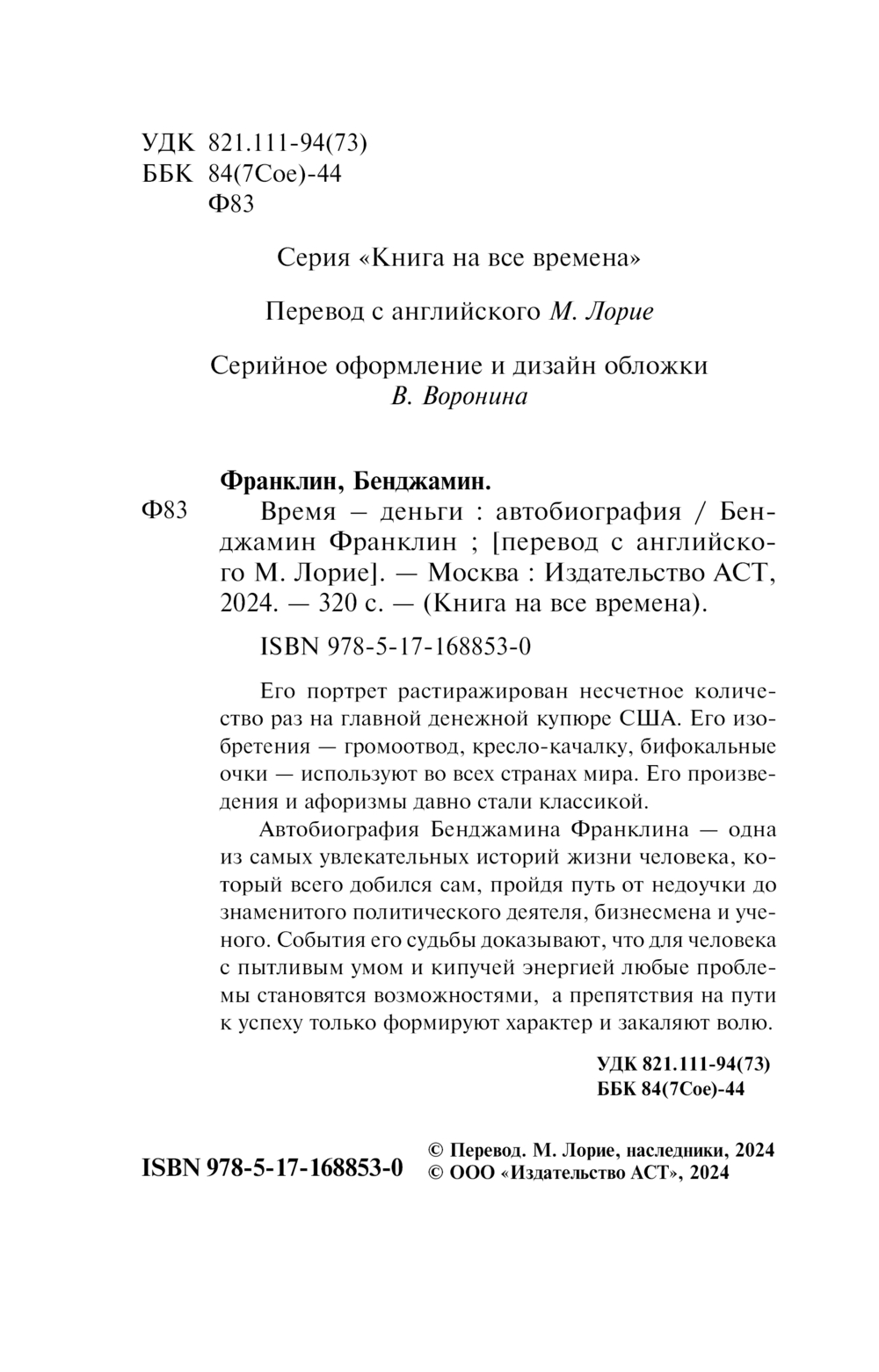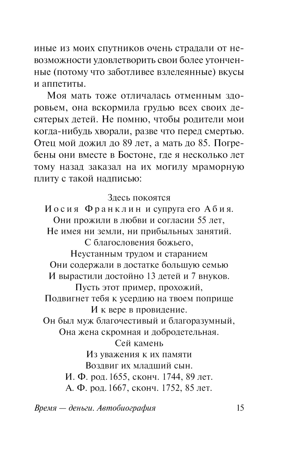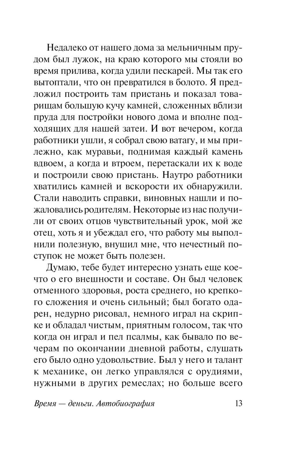 Автобиография Бенджамина Франклина – одна из самых увлекательных историй жизни человека, который всего добился сам, пройдя путь от недоучки до знаменитого политического деятеля, бизнесмена и ученого. События его судьбы доказывают, что для человека с пытливым умом и кипучей энергией любые проблемы становятся возможностями, а препятствия на пути к успеху только формируют характер и закаляют волю.