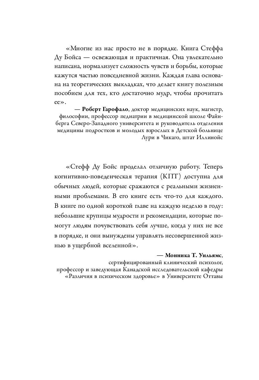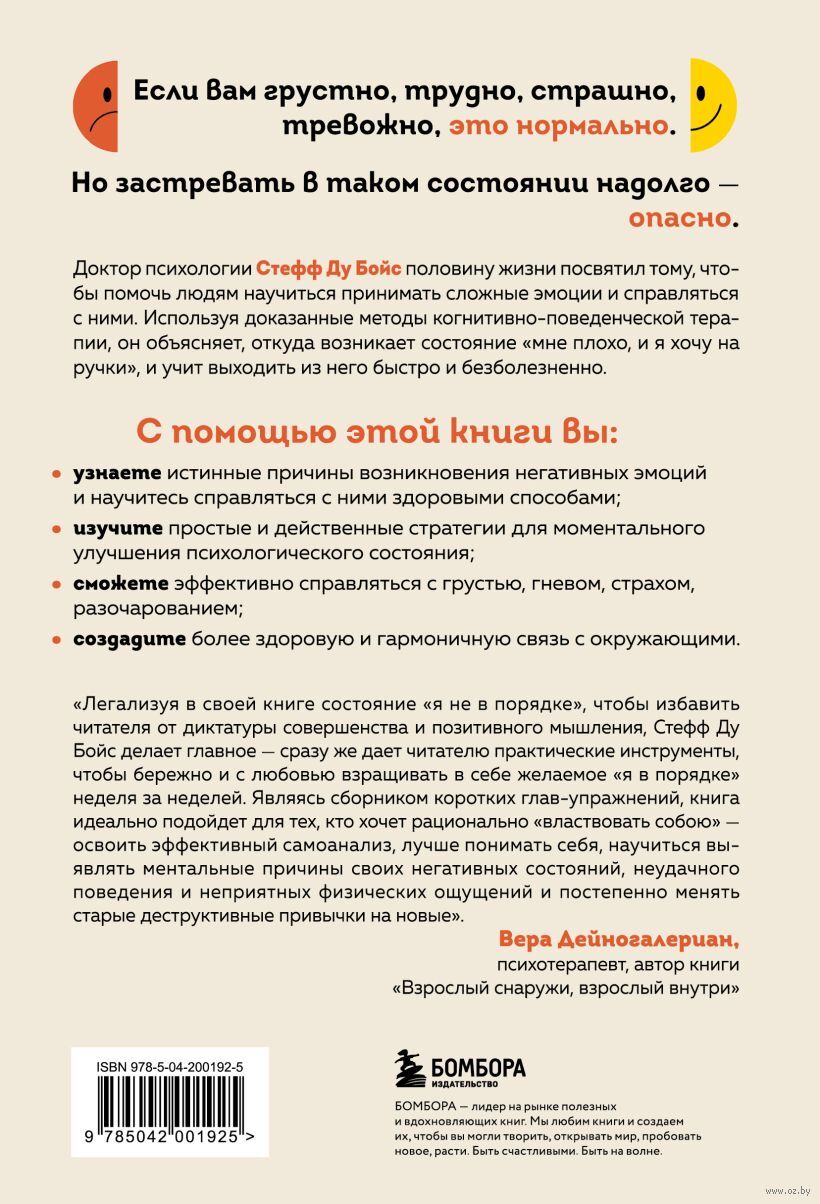 Доктор психологии Стефф Ду Бойс половину жизни посвятил тому, чтобы помочь людям научиться принимать сложные эмоции и справляться с ними. Используя доказанные методы когнитивно-поведенческой терапии, он объясняет, откуда возникает состояние "мне плохо, и я хочу на ручки" и учит выходить из него быстро и безболезненно.