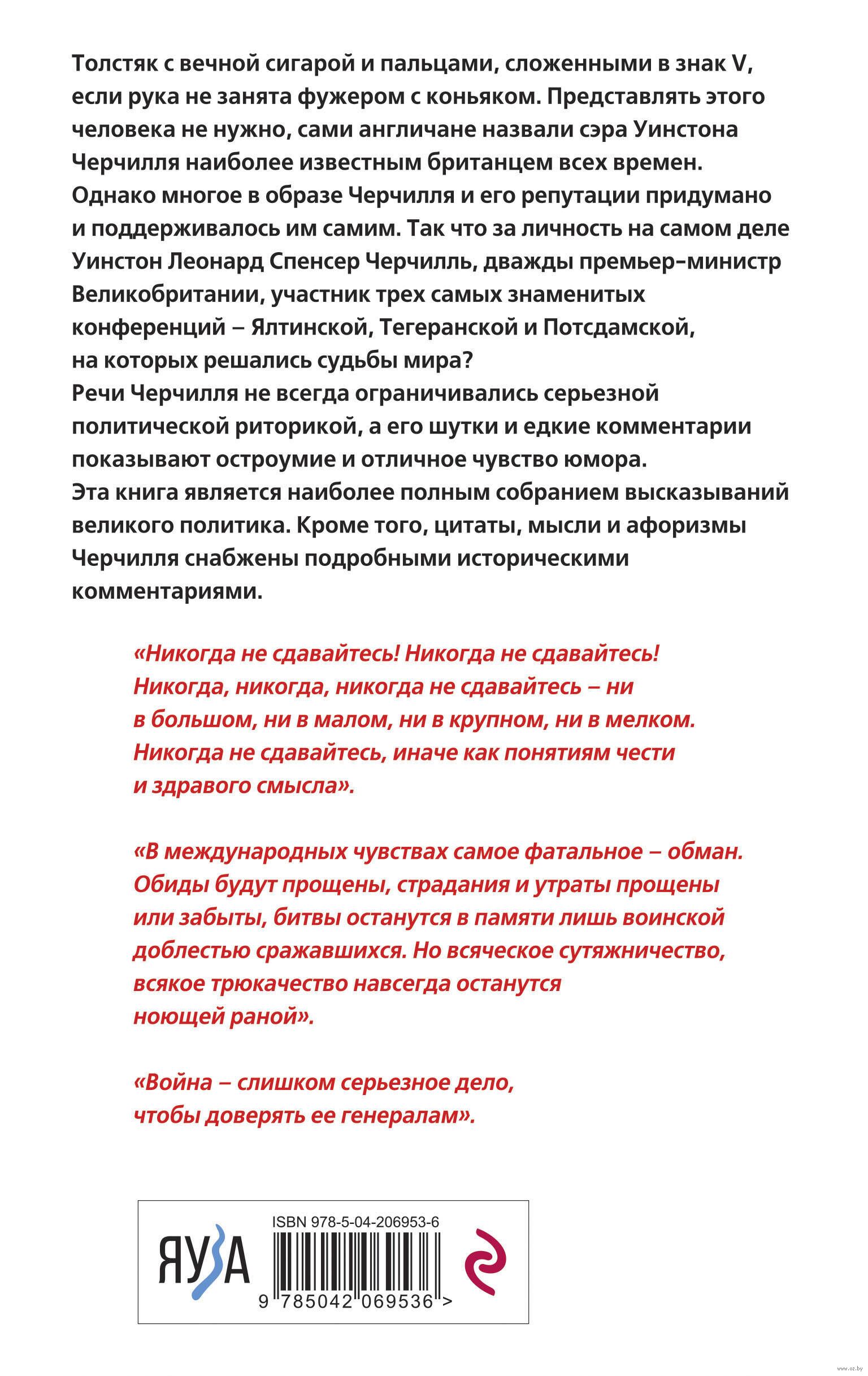 Речи Черчилля не всегда ограничивались серьезной политической риторикой, а его шутки и едкие комментарии показывают остроумие и отличное чувство юмора. Эта книга является наиболее полным собранием высказываний великого политика. Кроме того, цитаты, мысли и афоризмы Черчилля снабжены подробными историческими комментариями.