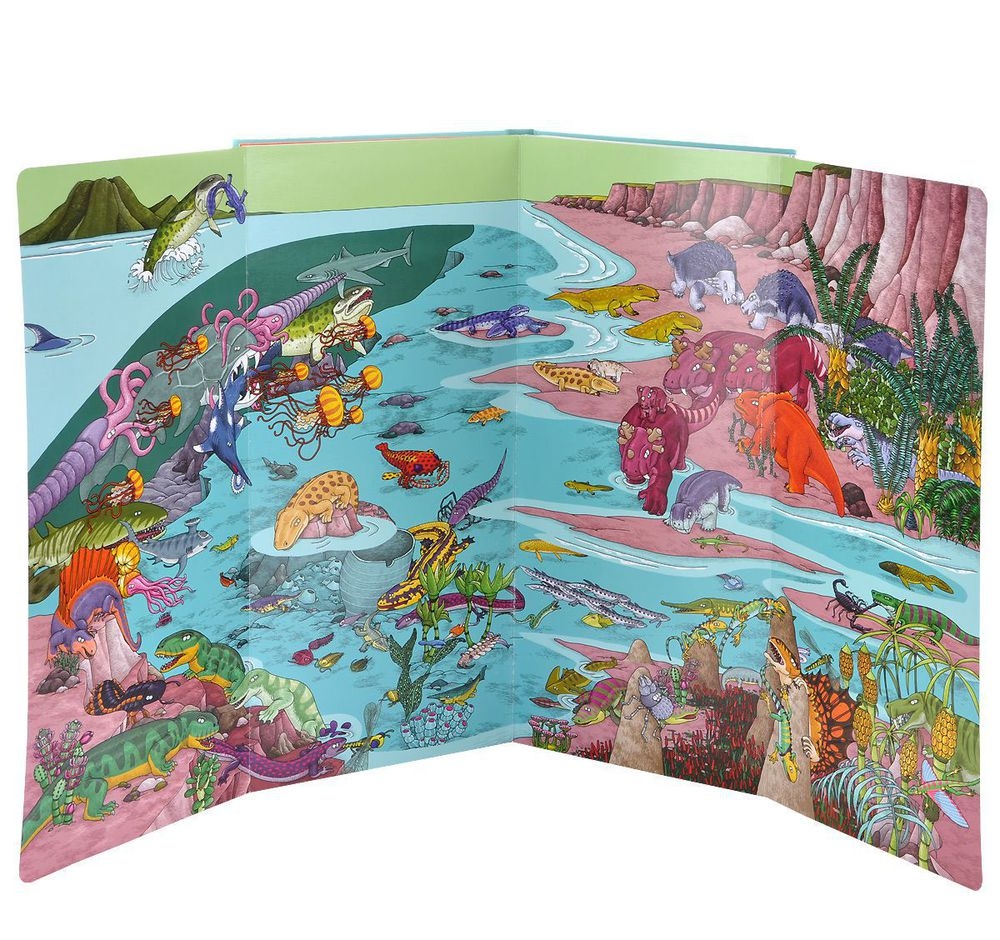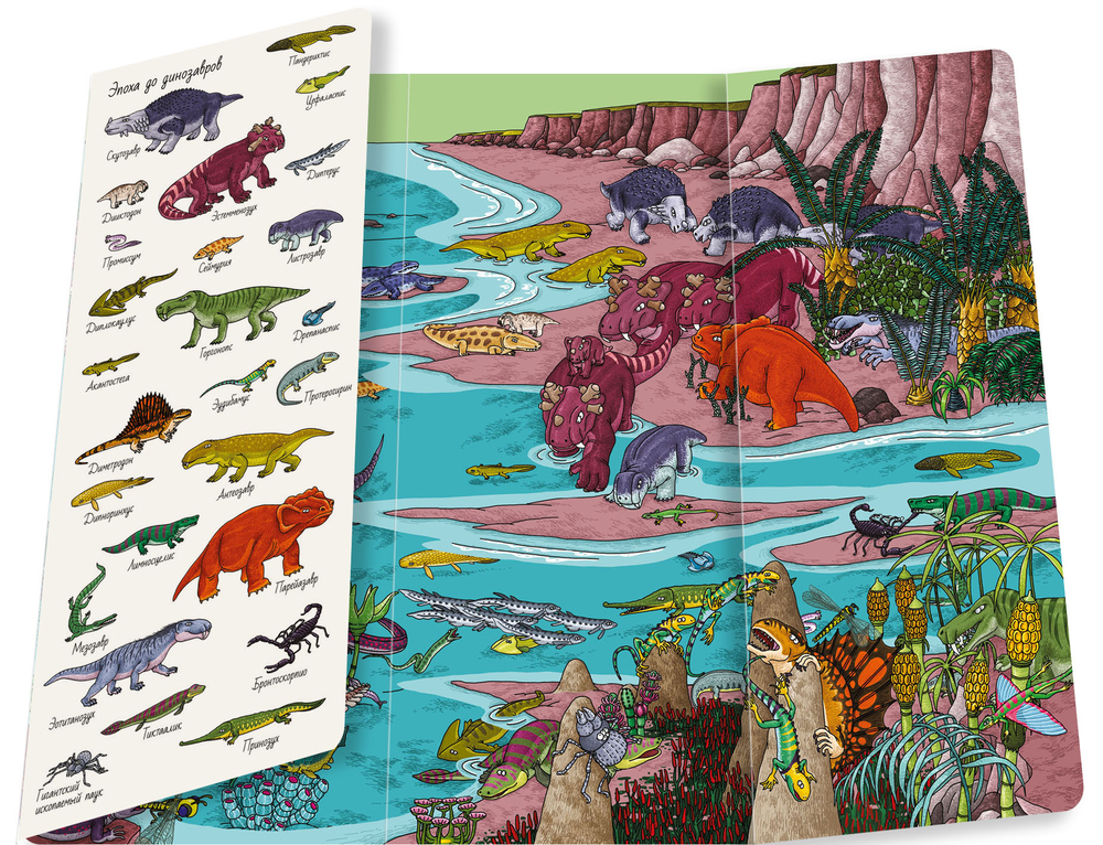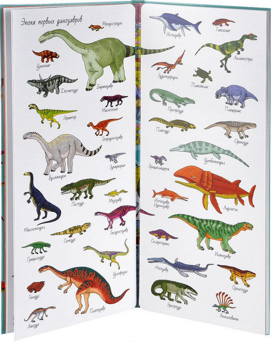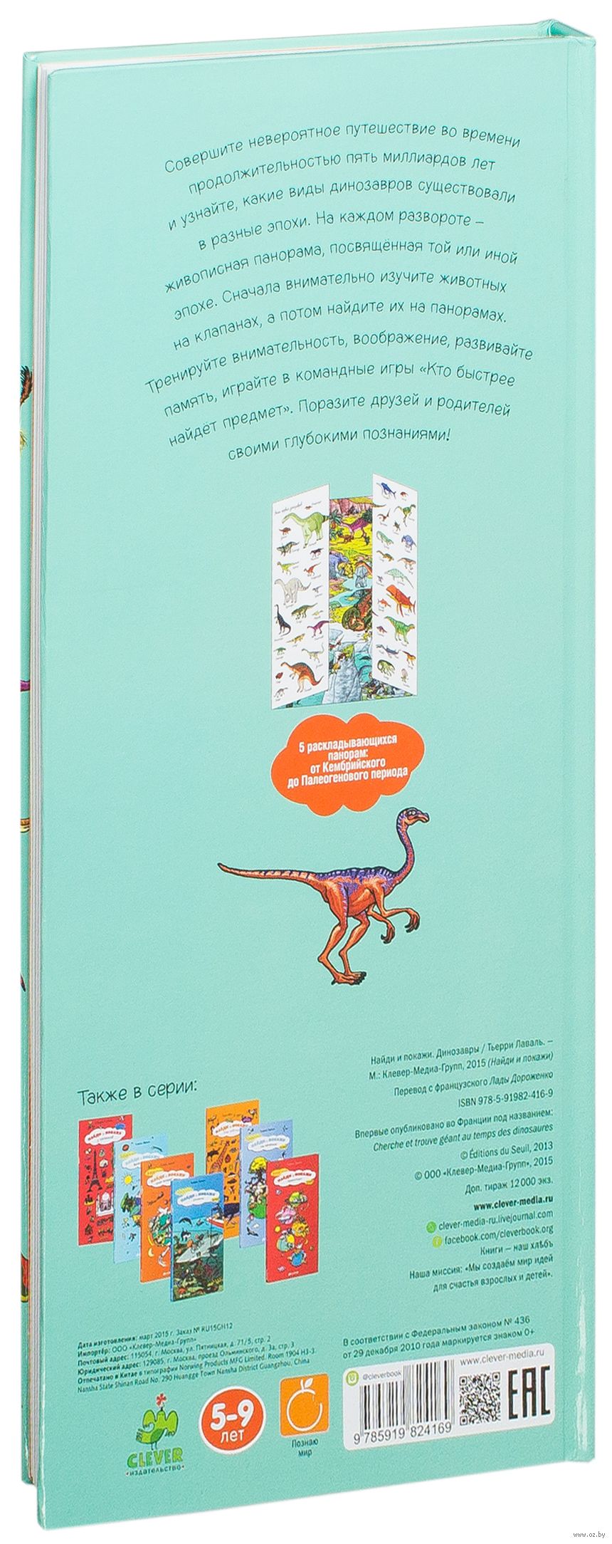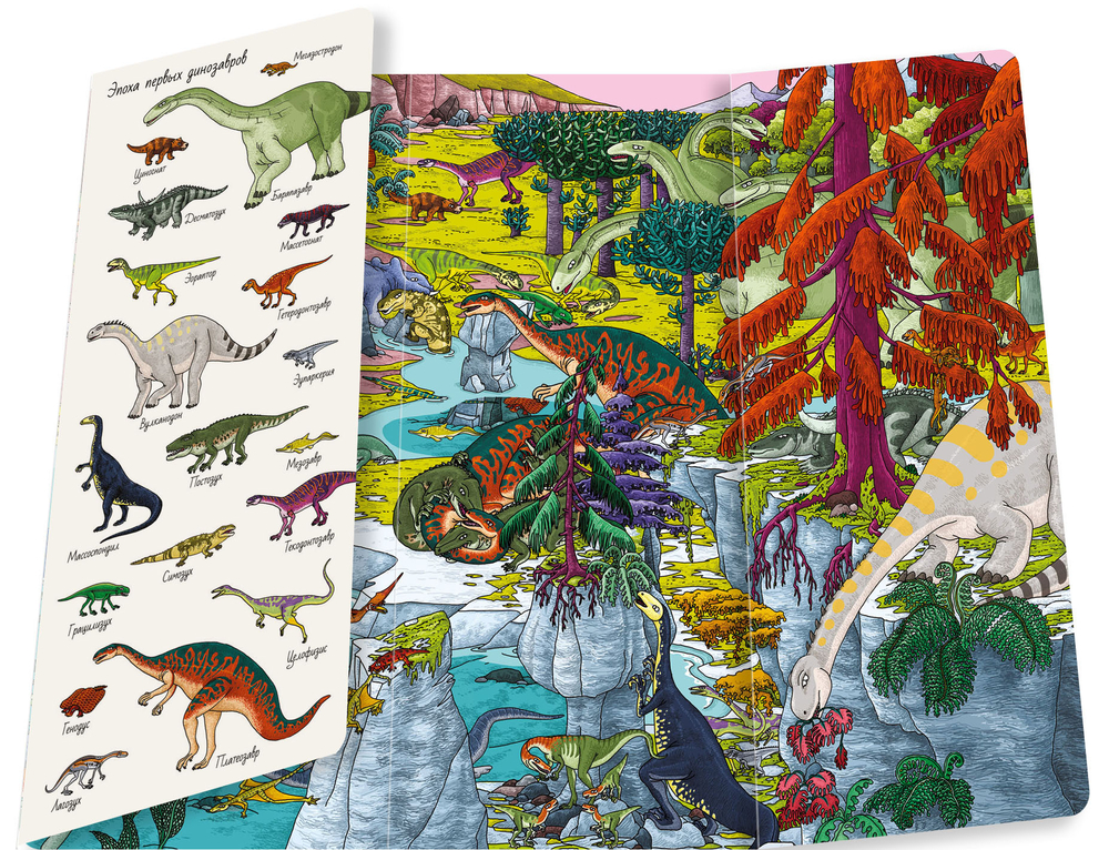 Совершите невероятное путешествие во времени продолжительностью пять миллиардов лет и узнайте, какие виды динозавров существовали в разные эпохи. На каждом развороте – живописная панорама, посвященная той или иной эпохе. Сначала внимательно изучите животных на клапанах, а потом найдите их на панорамах. Тренируйте внимательность, воображение, развивайте память, играйте в командные игры "Кто быстрее найдет предмет". И поразите друзей и родителей своими глубокими познаниями!