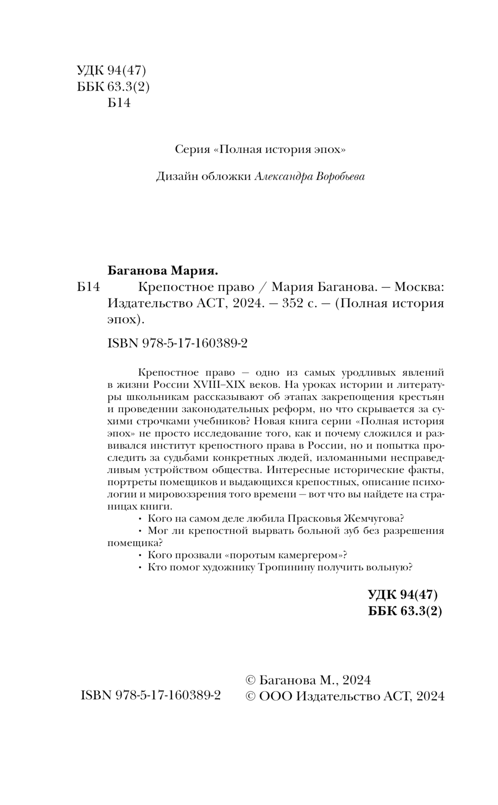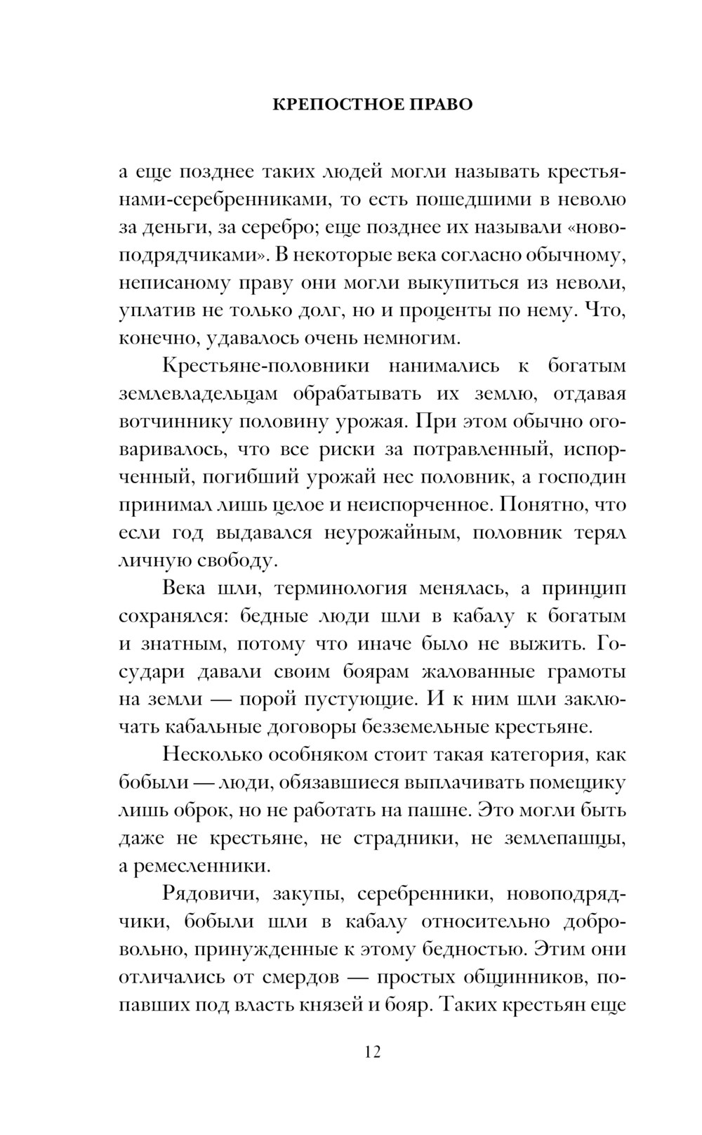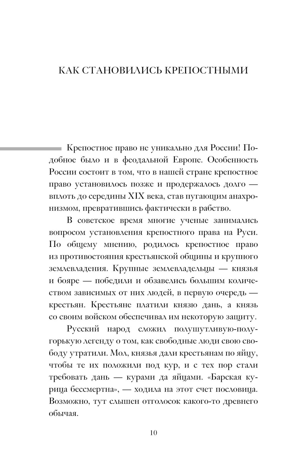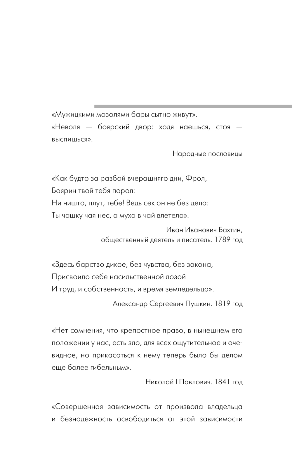 Новая книга серии "Полная история эпох" не просто исследование того, как и почему сложился и развивался институт крепостного права в России, но и попытка проследить за судьбами конкретных людей, изломанными несправедливым устройством общества. Интересные исторические факты, портреты помещиков и выдающихся крепостных, описание психологии и мировоззрения того времени – вот что вы найдете на страницах книги.