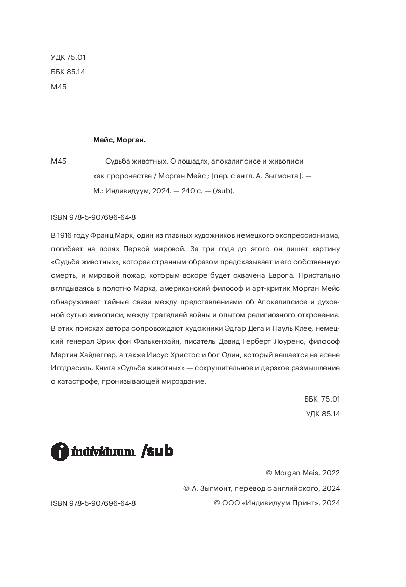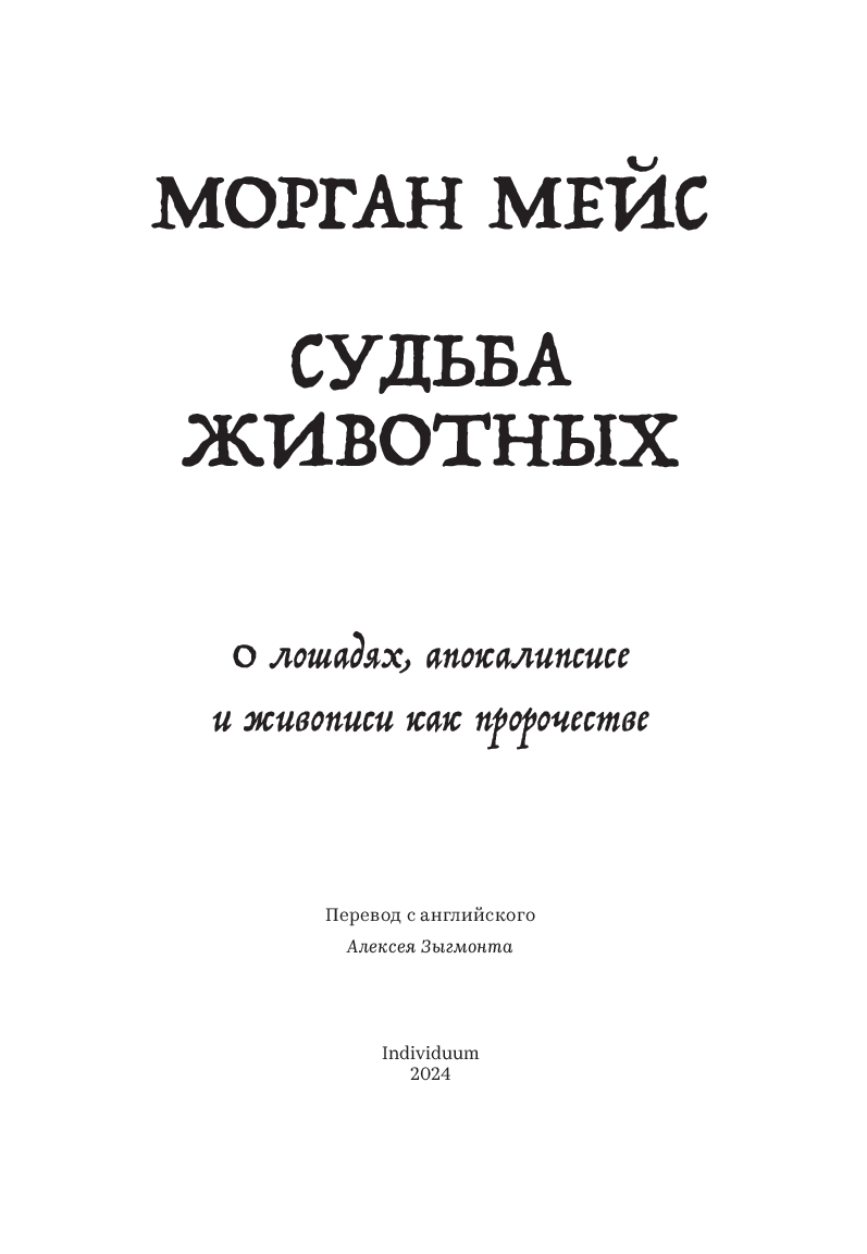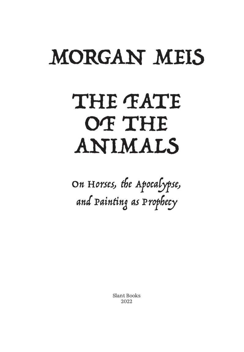 | Название в оригинале | Fate of the Animals: On Horses, the Apocalypse, and Painting as Prophecy |
