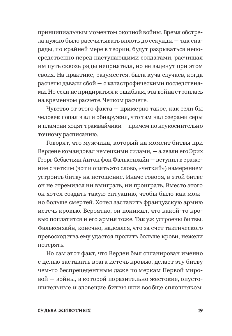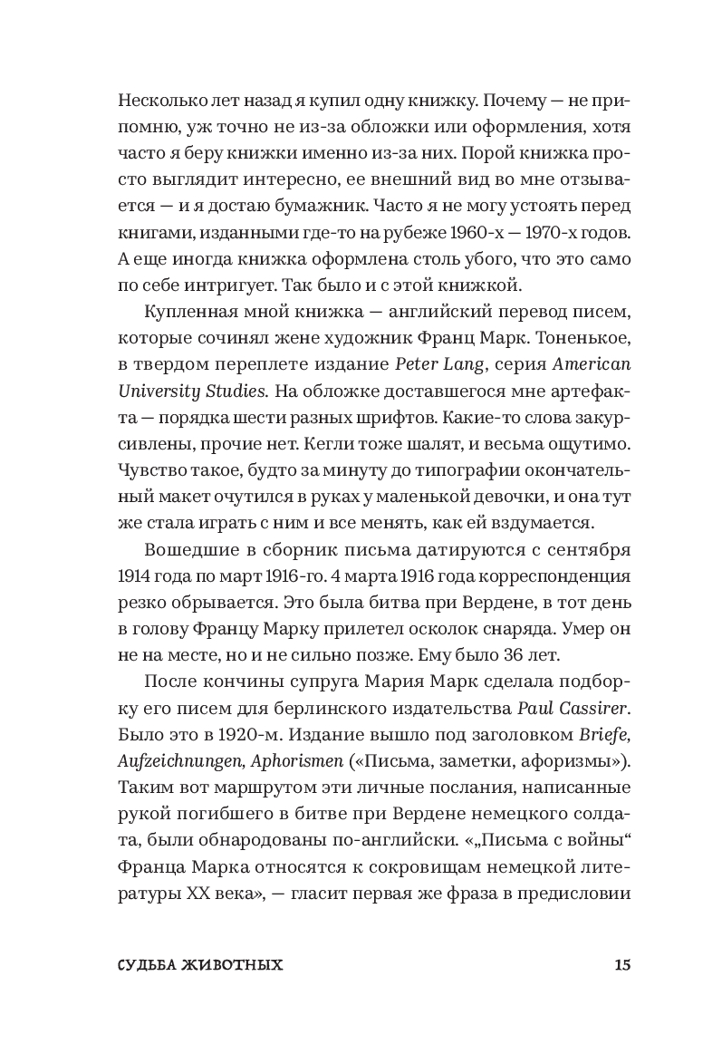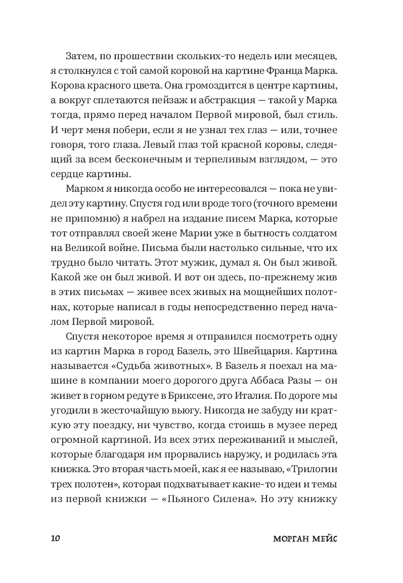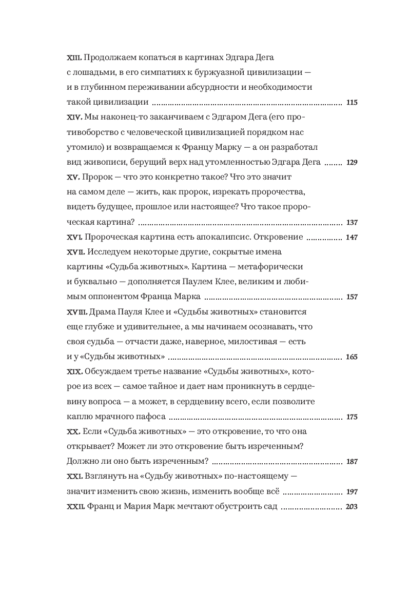 В 1916 году Франц Марк, один из главных художников немецкого экспрессионизма, погибает на полях Первой мировой. За три года до этого он пишет картину "Судьба животных", которая странным образом предсказывает и его собственную смерть, и мировой пожар, которым вскоре будет охвачена Европа. Пристально вглядываясь в полотно Марка, американский философ и арт-критик Морган Мейс обнаруживает тайные связи между представлениями об Апокалипсисе и духовной сутью живописи, между трагедией войны и опытом религиозного откровения. В этих поисках автора сопровождают художники Эдгар Дега и Пауль Клее, немецкий генерал Эрих фон Фалькенхайн, писатель Дэвид Герберт Лоуренс, философ Мартин Хайдеггер, а также Иисус Христос и бог Один, который вешается на ясене Иггдрасиль. Книга "Судьба животных" – сокрушительное и дерзкое размышление о катастрофе, пронизывающей мироздание.