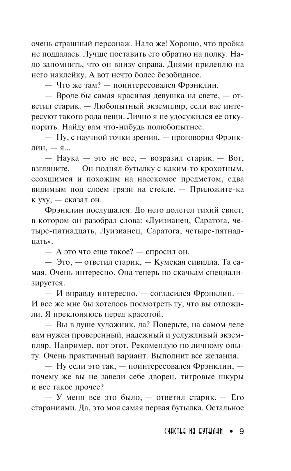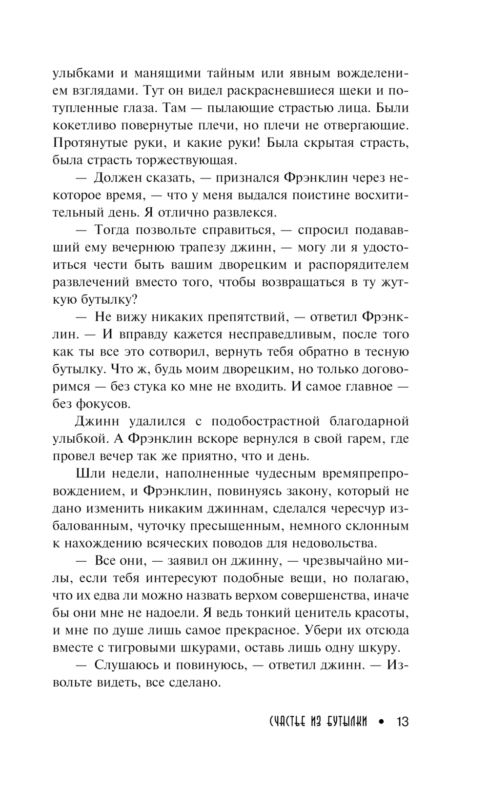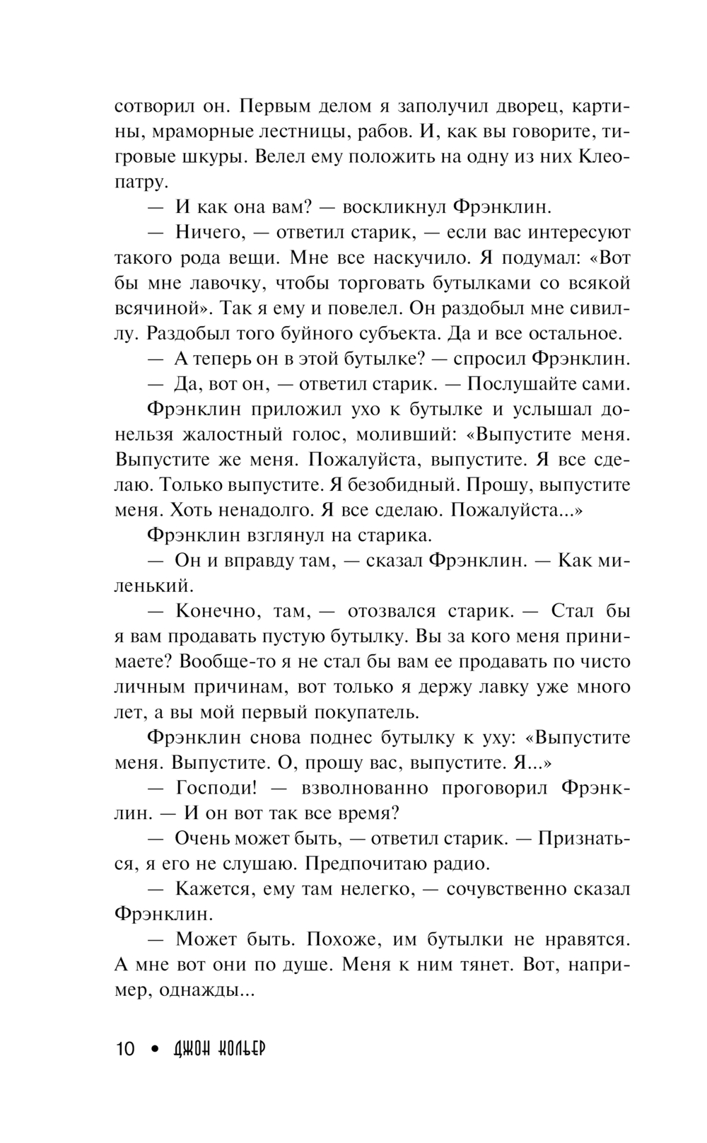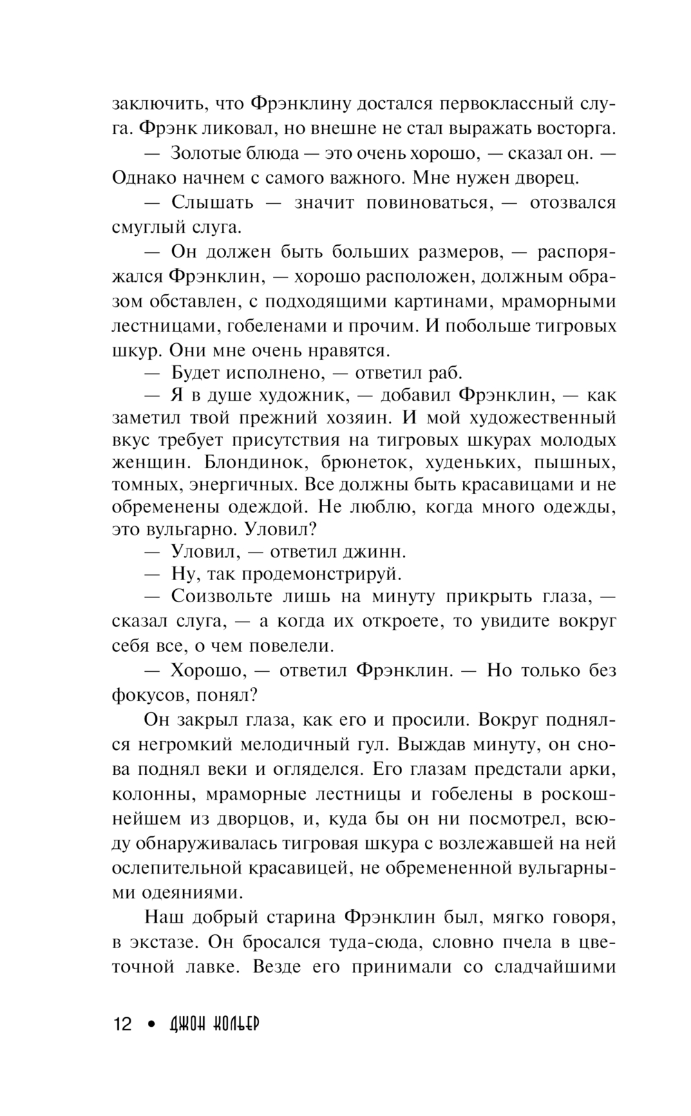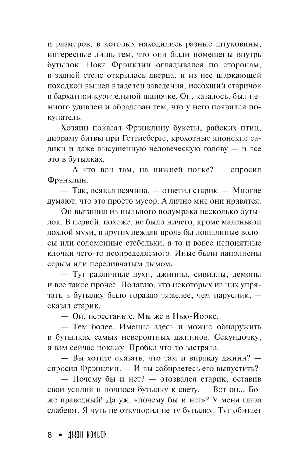 В книгу вошли рассказы, опубликованные в сборнике под названием "Fancies and Goodnights", за который Джон Кольер (однажды охарактеризованный как "коллекционер демонов и старый знакомый самого дьявола") получил премию "Эдгар". Среди засилья всевозможных необычных персонажей можно встретить и джинна, заключенного в бутылку, и простуженного демона, и бесстрашную амазонку, и целый выводок призраков из универмага. А играя с бессмертной темой сделки с дьяволом, которая уже многие века распространена в фольклоре, Кольер, благодаря своему воображению, придает ей неповторимый колорит и юмор.