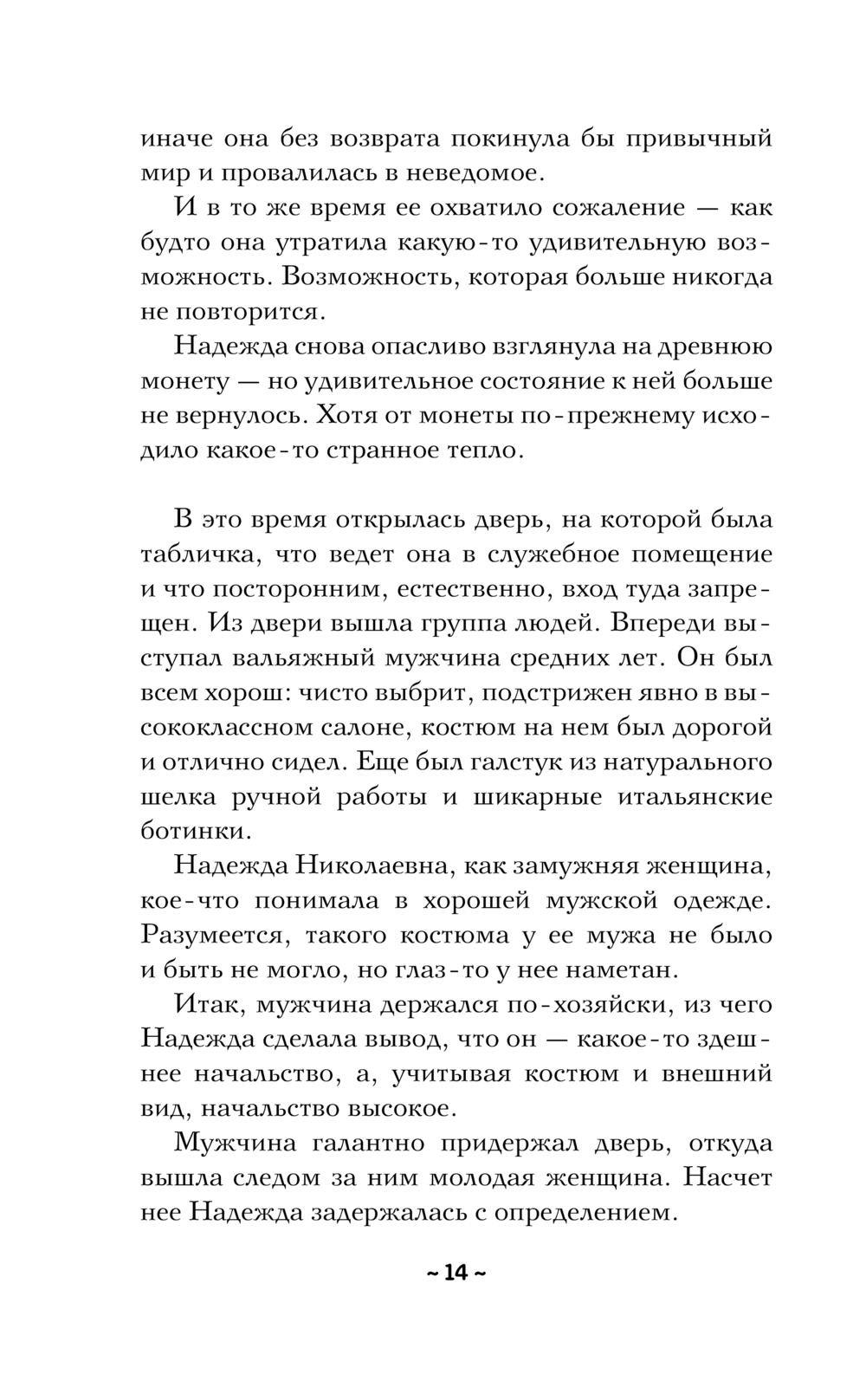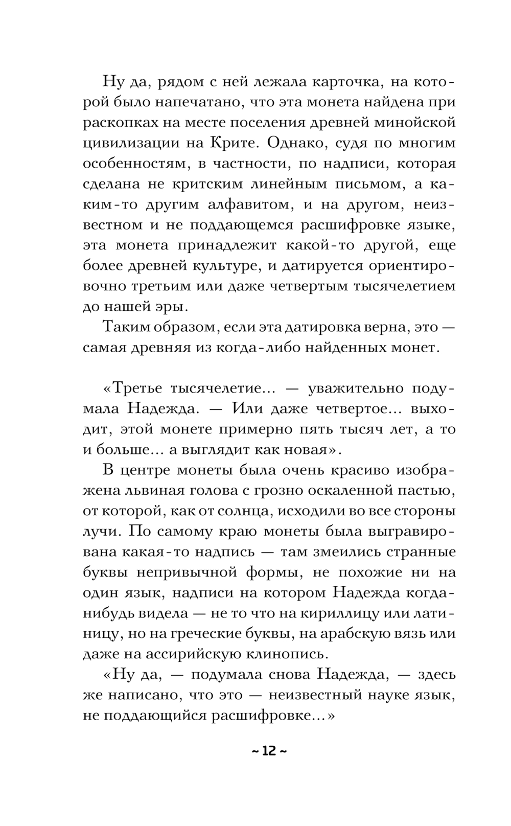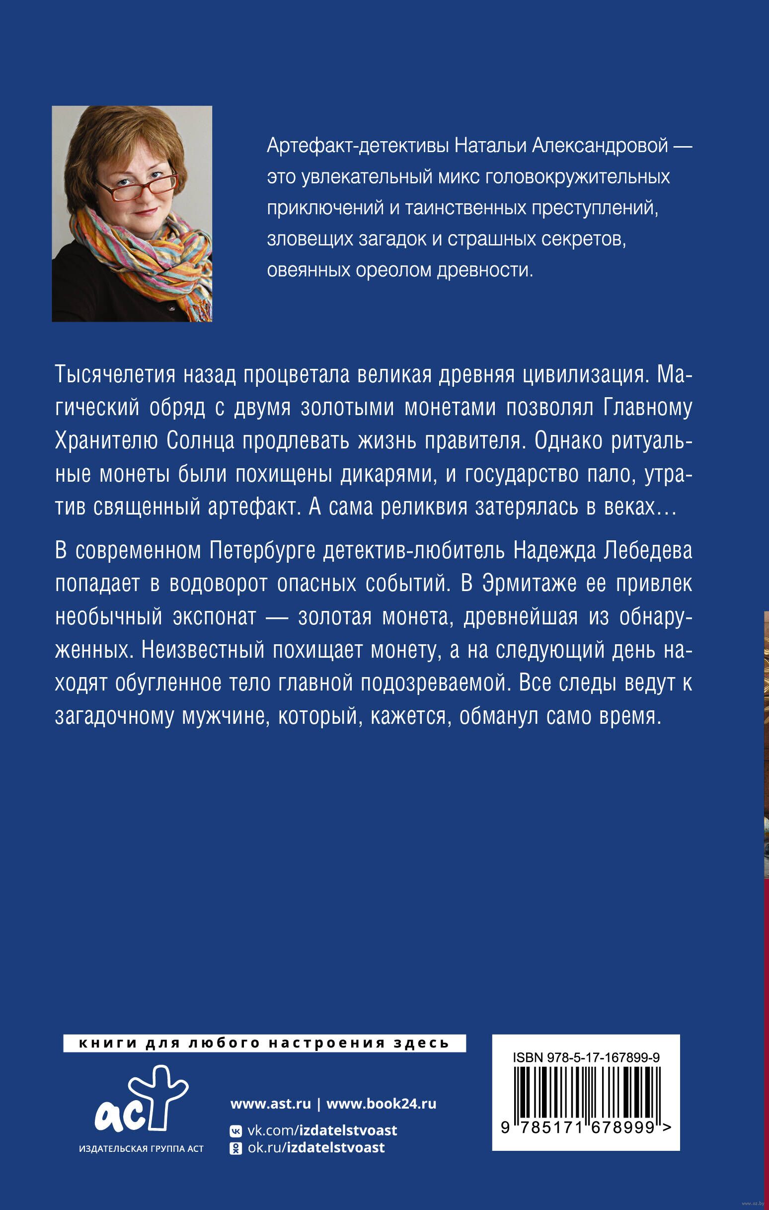 В современном Петербурге детектив-любитель Надежда Лебедева попадает в водоворот опасных событий. В Эрмитаже ее привлек необычный экспонат – золотая монета, древнейшая из обнаруженных. Неизвестный похищает монету, а на следующий день находят обугленное тело главной подозреваемой. Все следы ведут к загадочному мужчине, который, кажется, обманул само время.