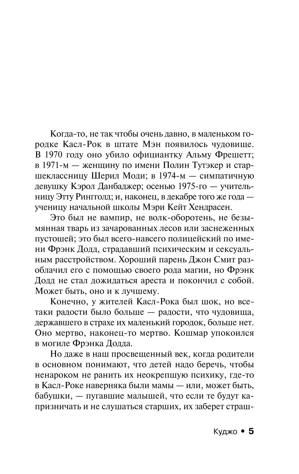 Один из обитателей тихого провинциального городка Касл-Рок – добродушный сенбернар Куджо. Однажды, преследуя кролика, он загоняет его в маленькую пещеру, где получает укус летучей мыши. На первый взгляд безобидное происшествие оборачивается настоящей трагедией. И возвращается Куджо к хозяевам уже совсем другим – чудовищем, сеющим смерть.