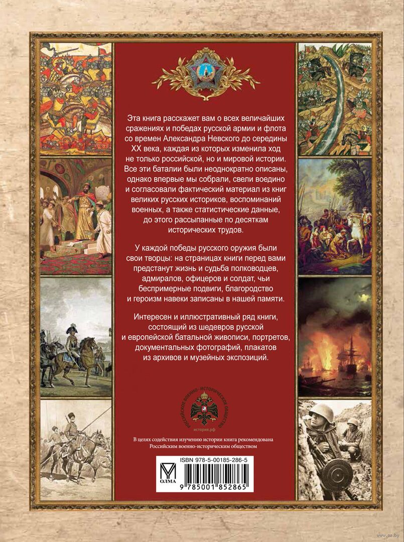 Эта книга расскажет вам о всех величайших сражениях и победах русской армии и флота со времен Александра Невского до середины ХХ века, каждая из которых изменила ход не только российской, но и мировой истории. Все эти баталии были неоднократно описаны, однако впервые мы собрали, свели воедино и согласовали фактический материал из книг великих русских историков, воспоминаний военных, а также статистические данные, до этого рассыпанные по десяткам исторических трудов.