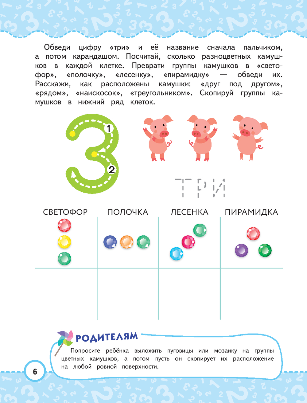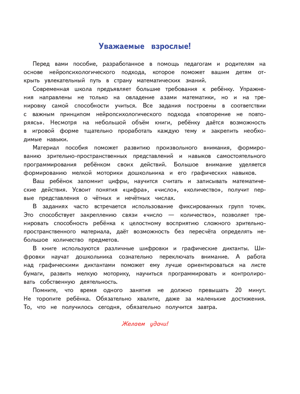 Это не просто учебное пособие, а комплексный инструмент, который поможет каждому ребёнку, начиная с 5 лет, полюбить мир чисел, формируя при этом позитивное отношение к учёбе. Автор уделяет особое внимание методам профилактики и преодоления нейропсихологических проблем, которые могут затруднять обучение. Ребёнок освоит счёт до 10 в прямом и обратном порядке, арифметические действия сложения и вычитания, запомнит названия геометрических фигур и их свойства, потренируется писать цифры, привыкнет пользоваться числовым лучом и легко подготовится к собеседованию для поступления в первый класс.