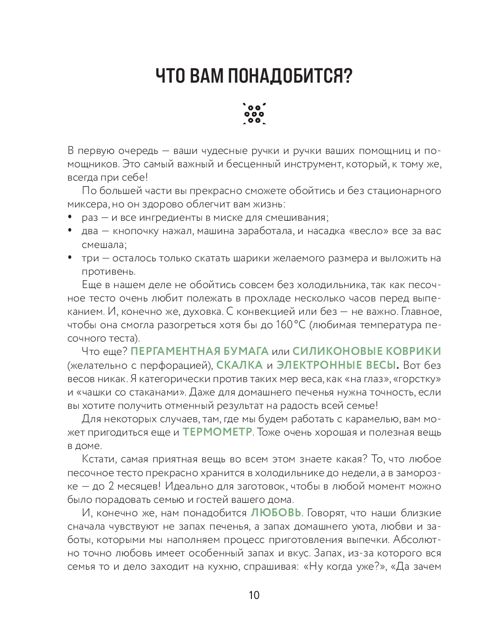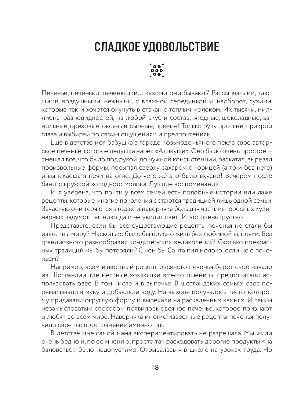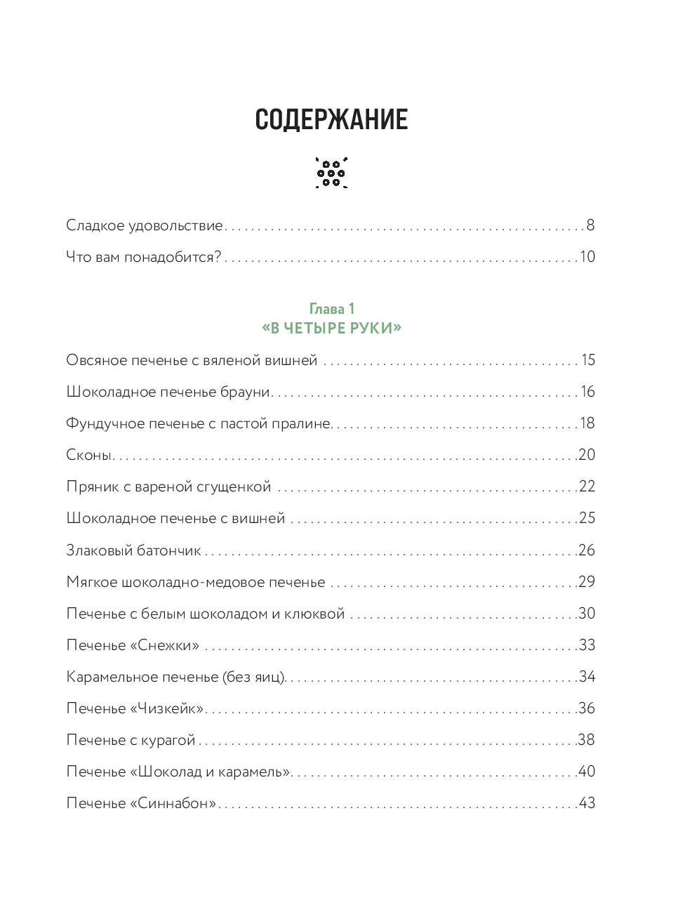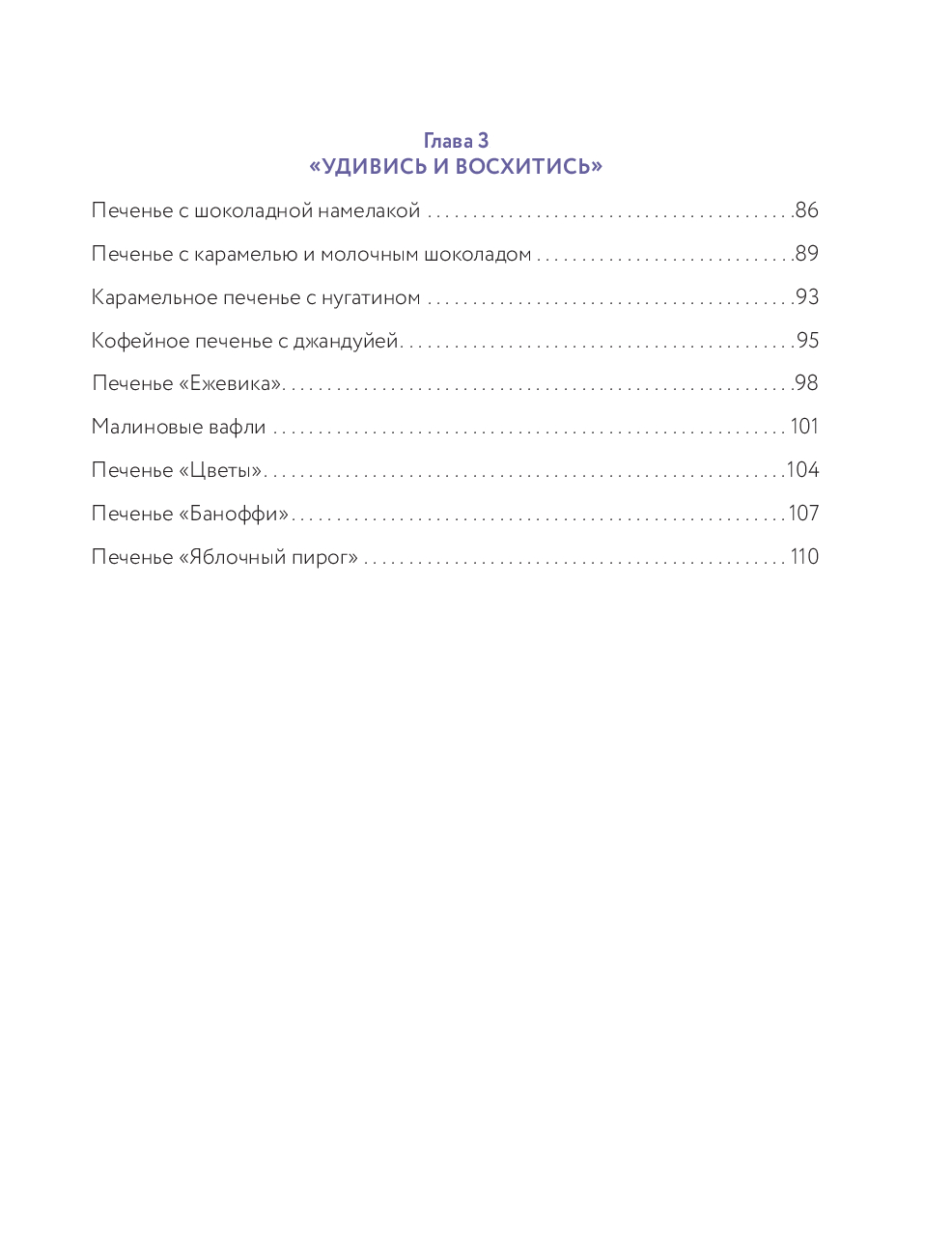 В книге три главы: первая и самая большая глава предлагает приготовить простое авторское печенье. Рецепты этого раздела идеально подойдут для готовки с детьми. Вторая глава – несладкое закусочное печенье. Третья – высокий и изящный уровень кондитерского искусства. Приготовление печенья из этого радела потребует определенных навыков и большего времени.