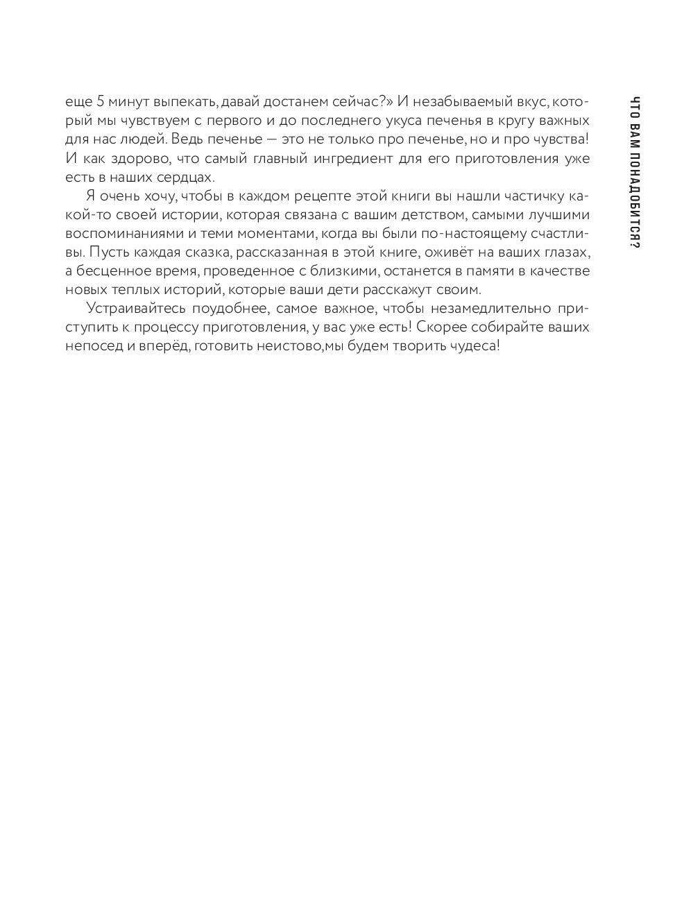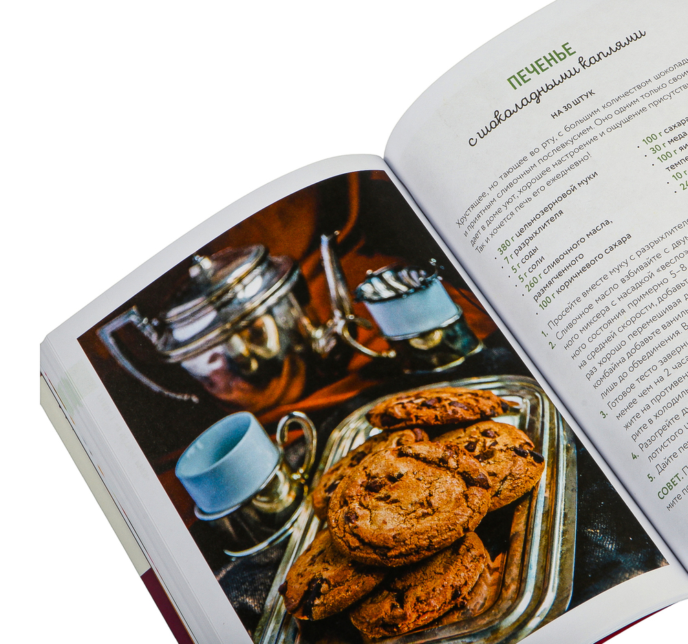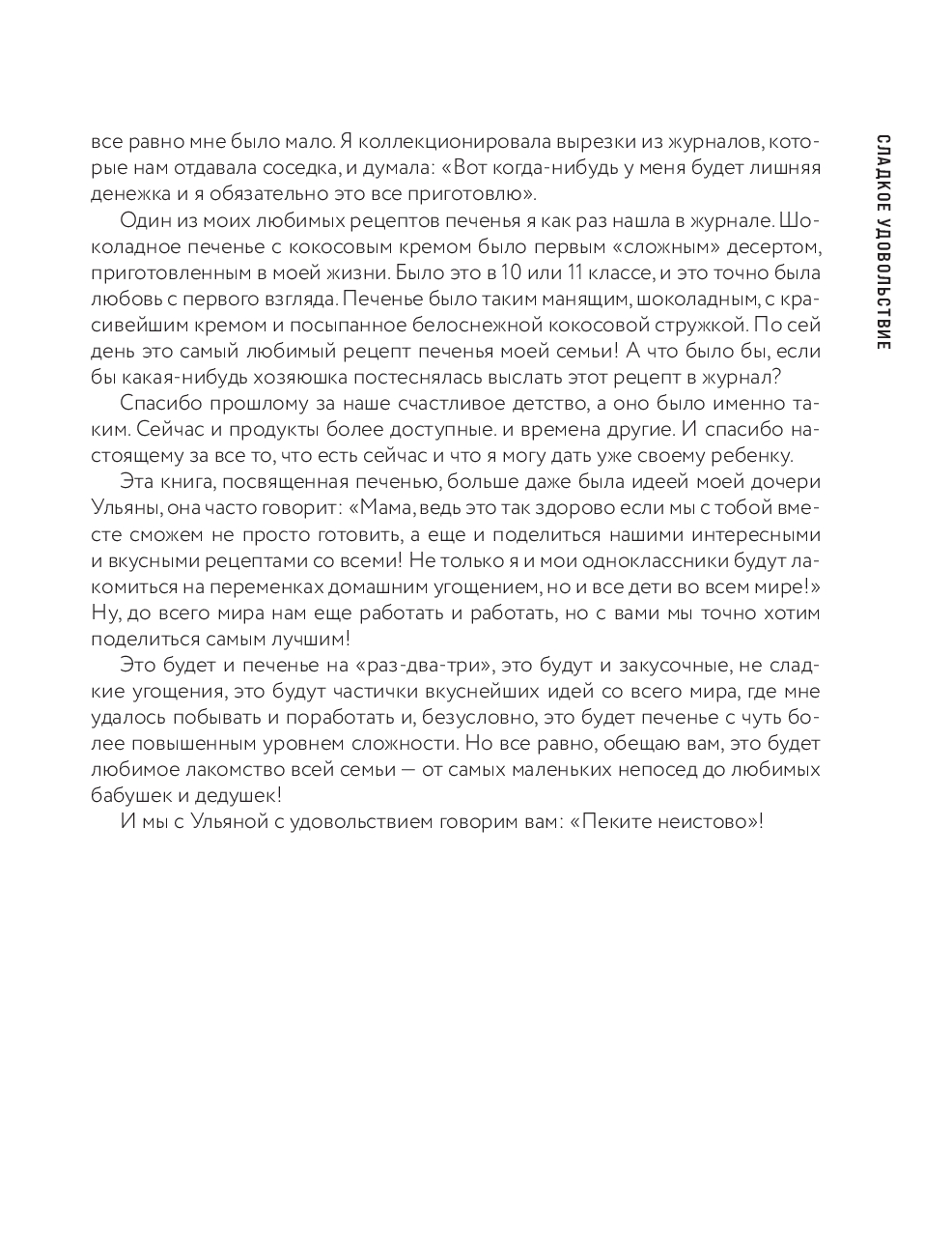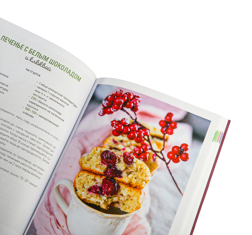 В книге три главы: первая и самая большая глава предлагает приготовить простое авторское печенье. Рецепты этого раздела идеально подойдут для готовки с детьми. Вторая глава – несладкое закусочное печенье. Третья – высокий и изящный уровень кондитерского искусства. Приготовление печенья из этого радела потребует определенных навыков и большего времени.