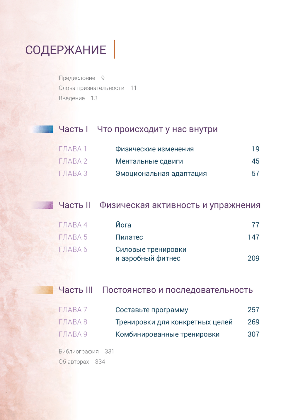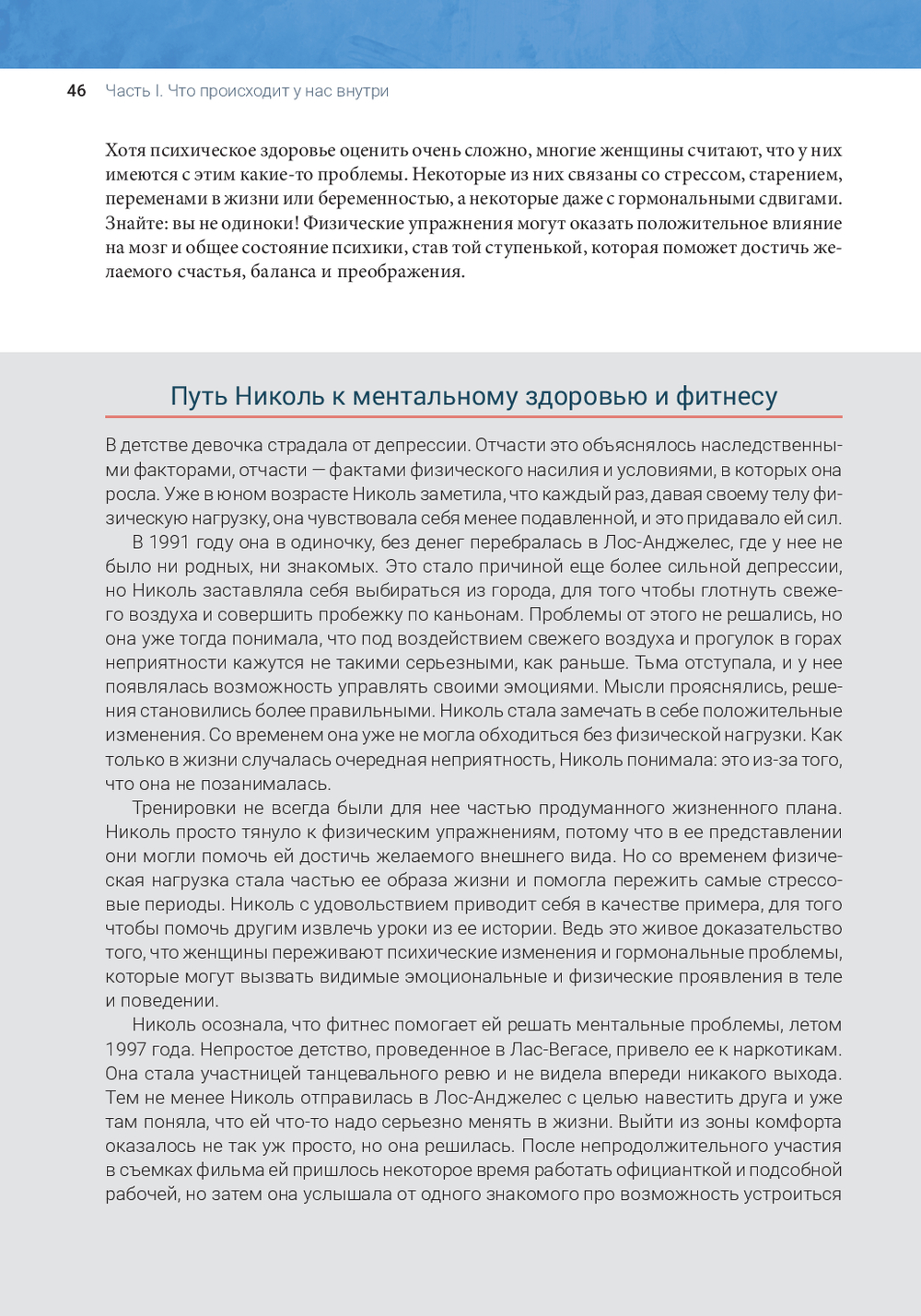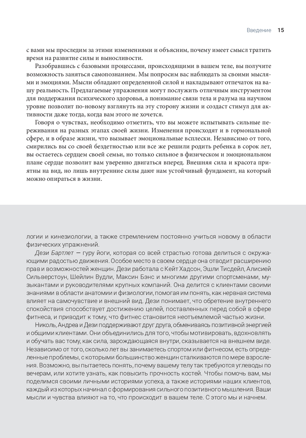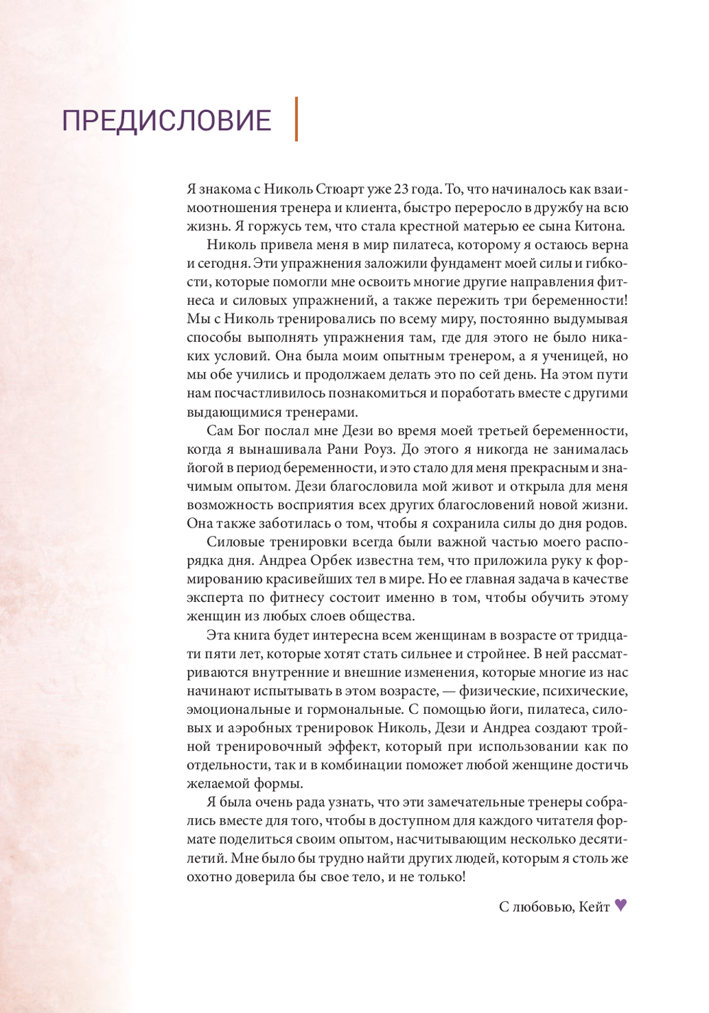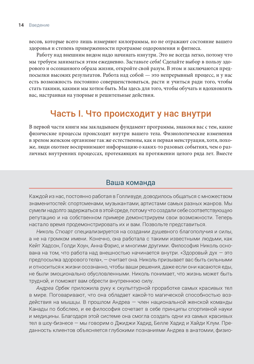 Это не просто руководство по фитнесу. Вы узнаете, чего ждать во время и после беременности или менопаузы, как гормоны влияют на ваше тело и эмоциональное состояние, какое воздействие упражнения оказывают на мозг и какое значение имеет питание для внешнего вида и самочувствия. Также вы найдете в книге инсайдерские рекомендации и истории знаменитых клиенток.