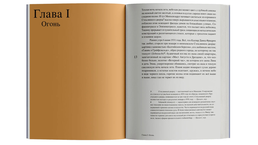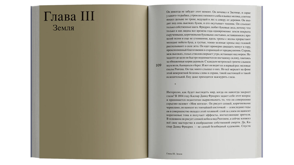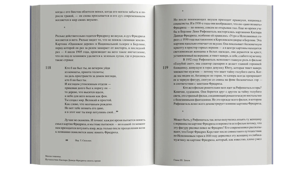 Двести пятьдесят лет немецкой истории – от 1774 года и до наших дней – разворачиваются сквозь пейзажи Каспара Давида Фридриха, самого немецкого из художников, открывшего всему миру романтическое томление духа. Гёте, например, так раздражала эта специфическая меланхоличность, что он расколотил одну из картин об стол; Диснея работы Фридриха вдохновляли настолько, что стали основой и фоном для знаменитого мультфильма "Бэмби". Нашедший поклонников среди известных авторов начала XX века и боготворимый нацистами, ненавидимый поколением 1968 года и презираемый своими современниками, Каспар Давид Фридрих столь же противоречив, как и написанные им картины. Флориан Иллиес продолжает традицию, заданную его предыдущими работами, и проводит читателей по закоулкам истории, сталкивает эпохи и личности, внешнюю хронику и частную жизнь, чтобы создать портрет художника, путешествующего во временах и эпохах.
