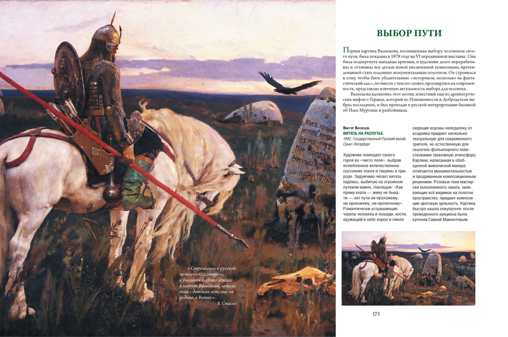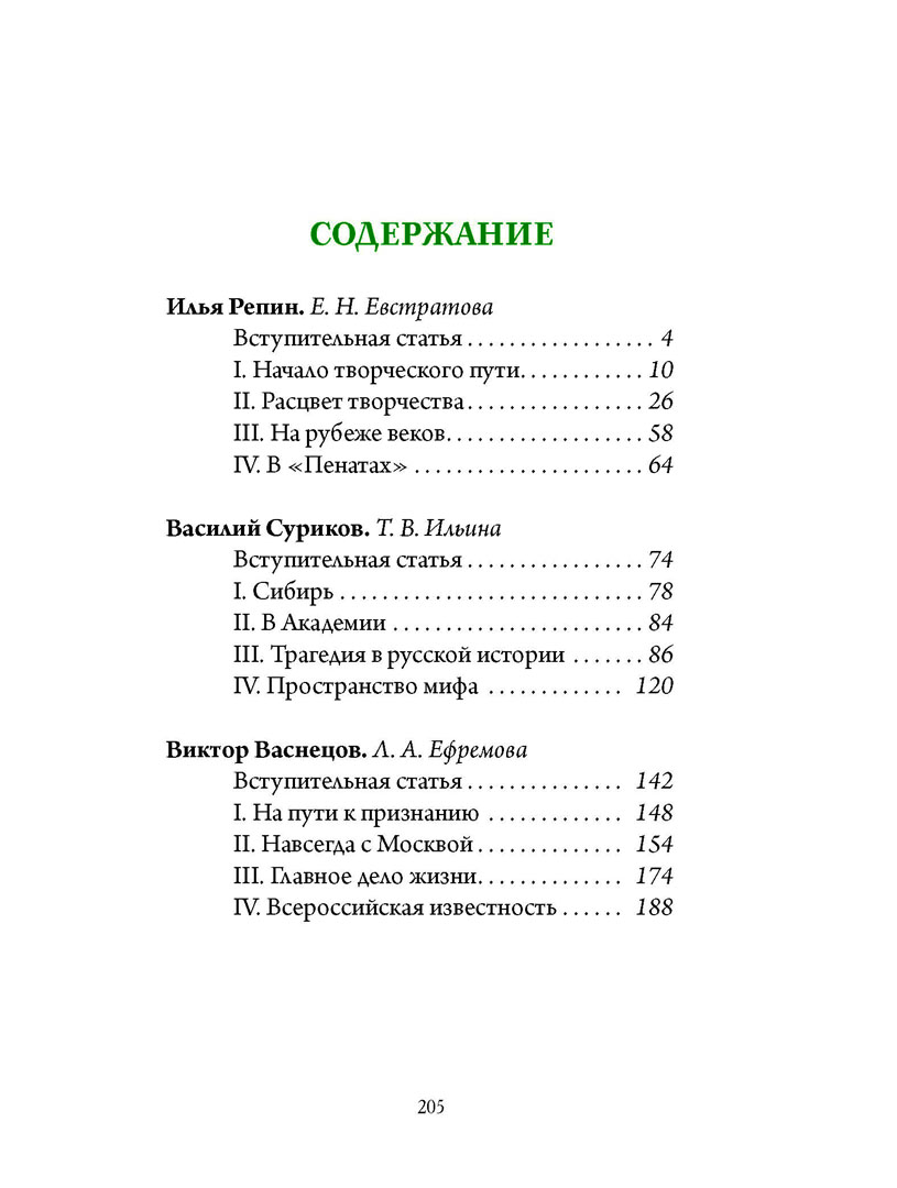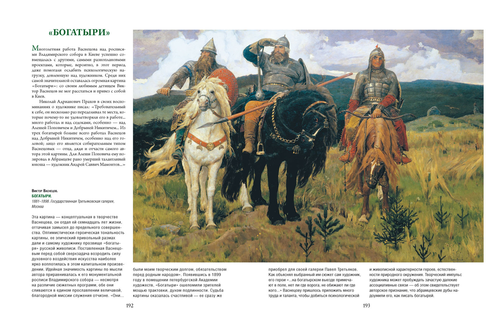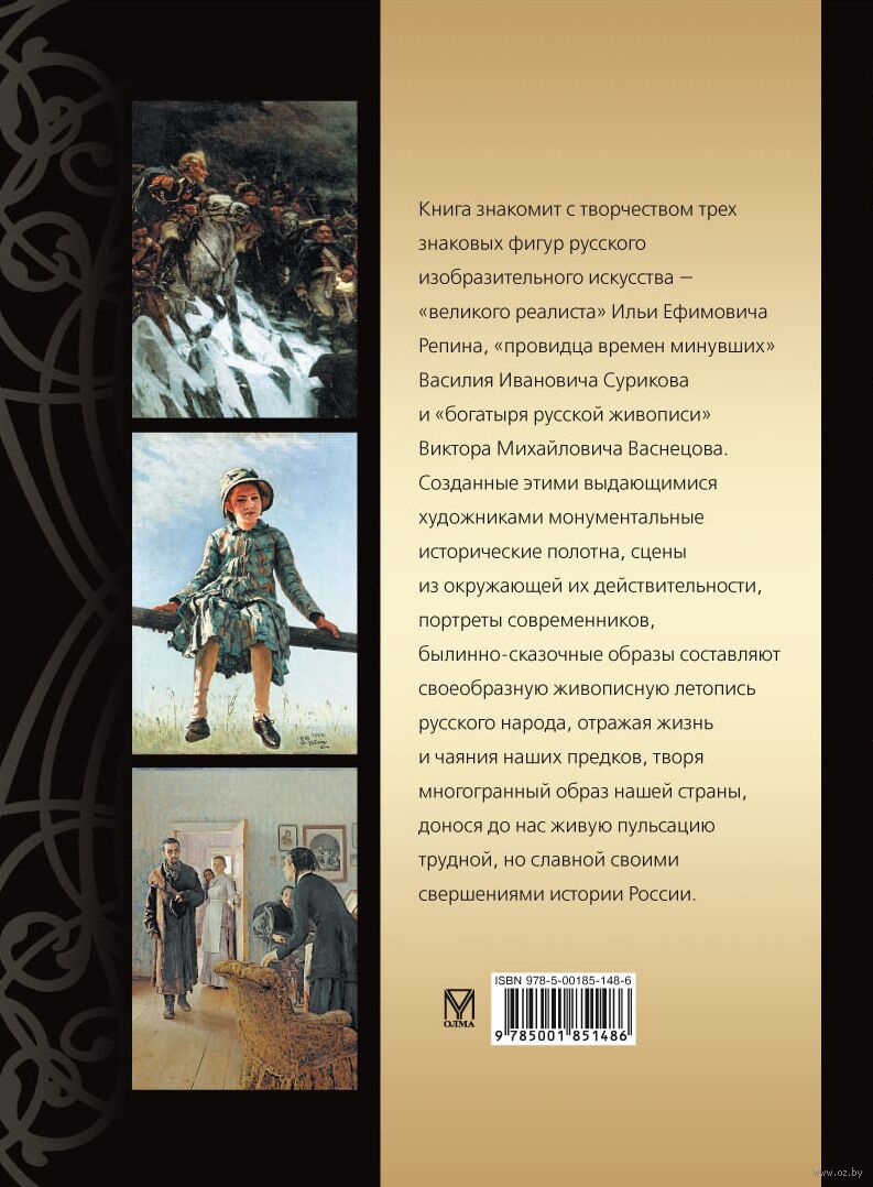 Книга знакомит с творчеством трех величайших русских художников, знаковых фигур отечественного изобразительного искусства – "великого реалиста" Ильи Ефимовича Репина, "провидца времен минувших" Василия Ивановича Сурикова и "богатыря русской живописи" Виктора Михайловича Васнецова.