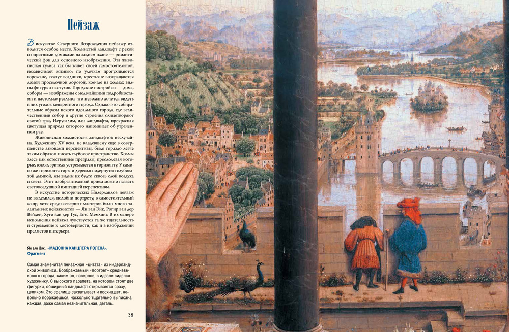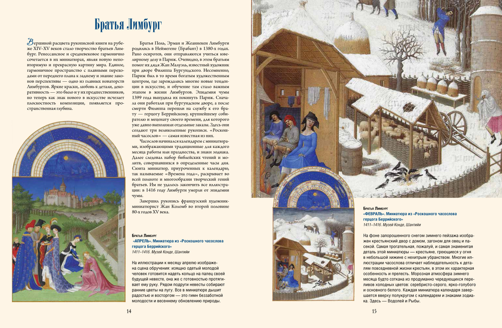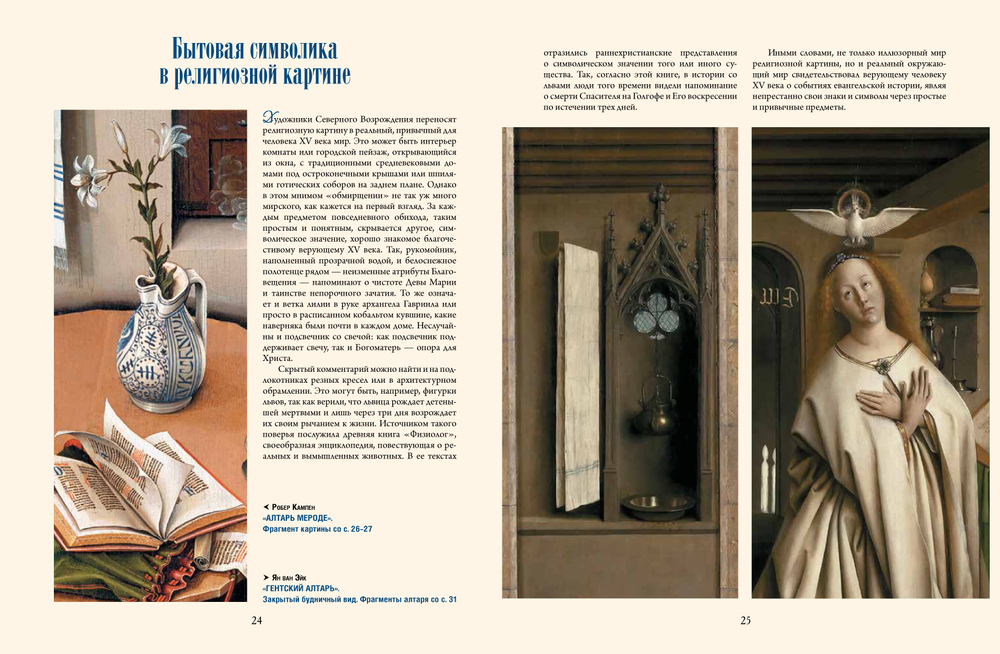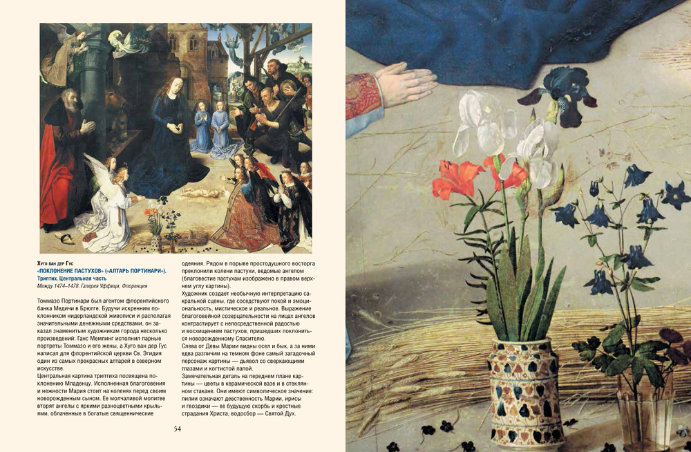 Всего в альбоме представлено творчество более 20 художников и весь спектр произведений этой эпохи, от книжной миниатюры до огромных многостворчатых алтарей, от великолепных портретов до библейских сюжетов, пейзажей и жанровых сцен. Все эти произведения созданы с таким мастерством и вниманием к мельчайшим деталям, что удивляешься и поражаешься, насколько это тонко и тщательно сделано. Разглядывать картины мастеров Северного Возрождения можно бесконечно долго, находя в них всё новые и новые подробности, поэтому многие произведения в этом издании даны с крупными фрагментами.
