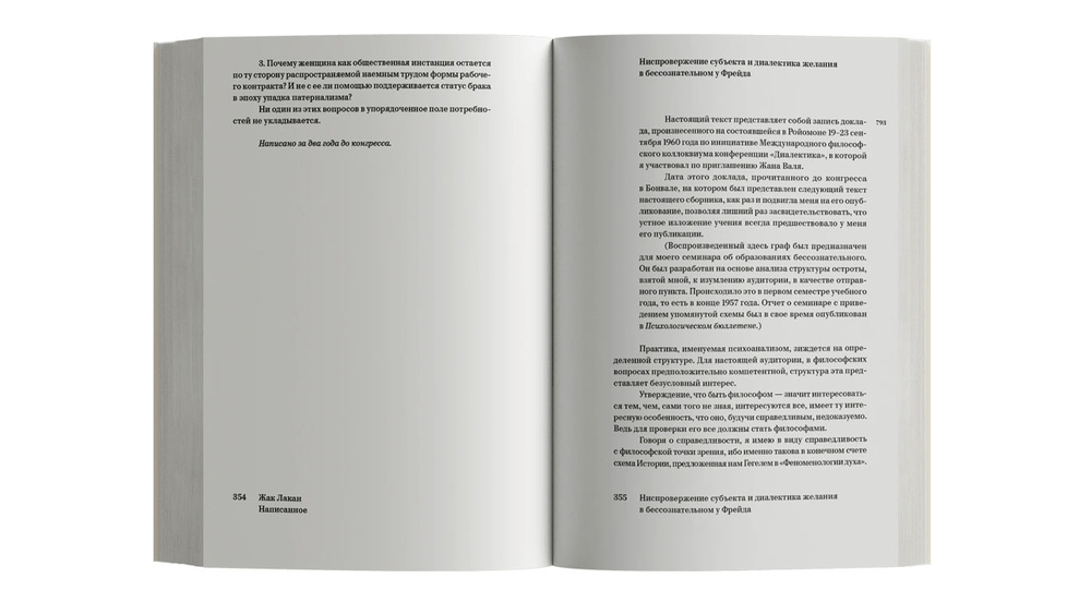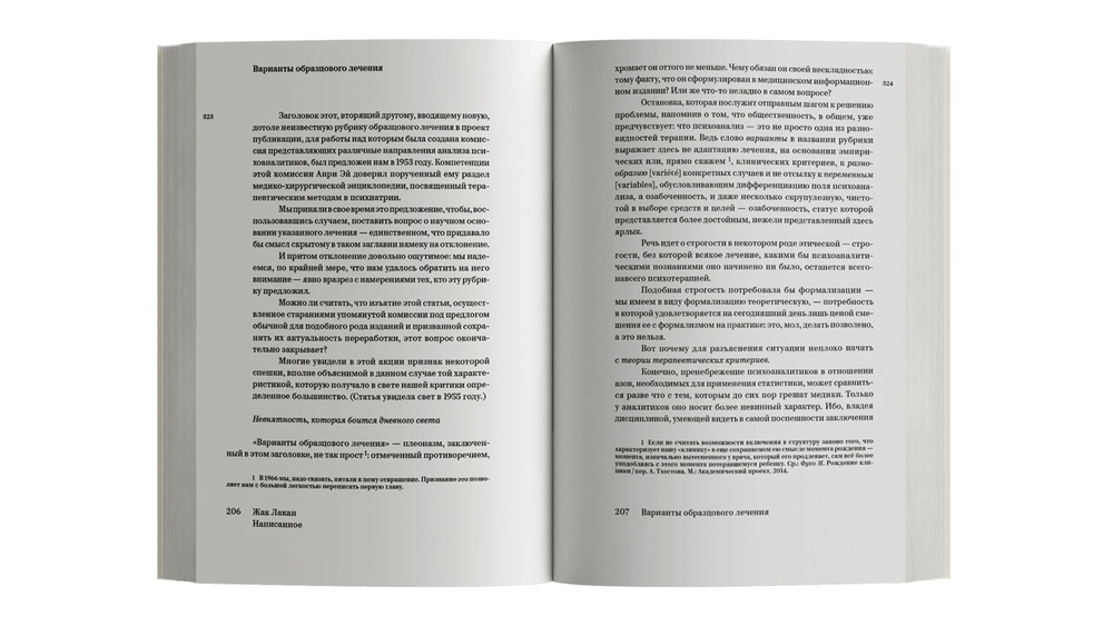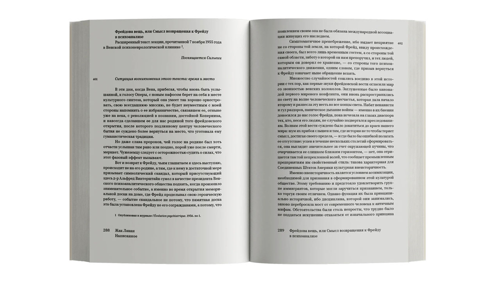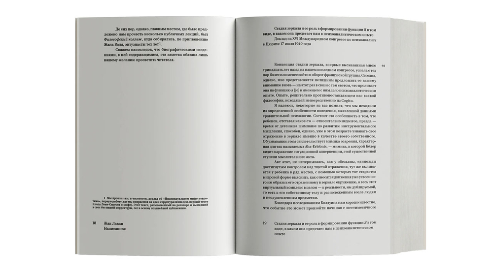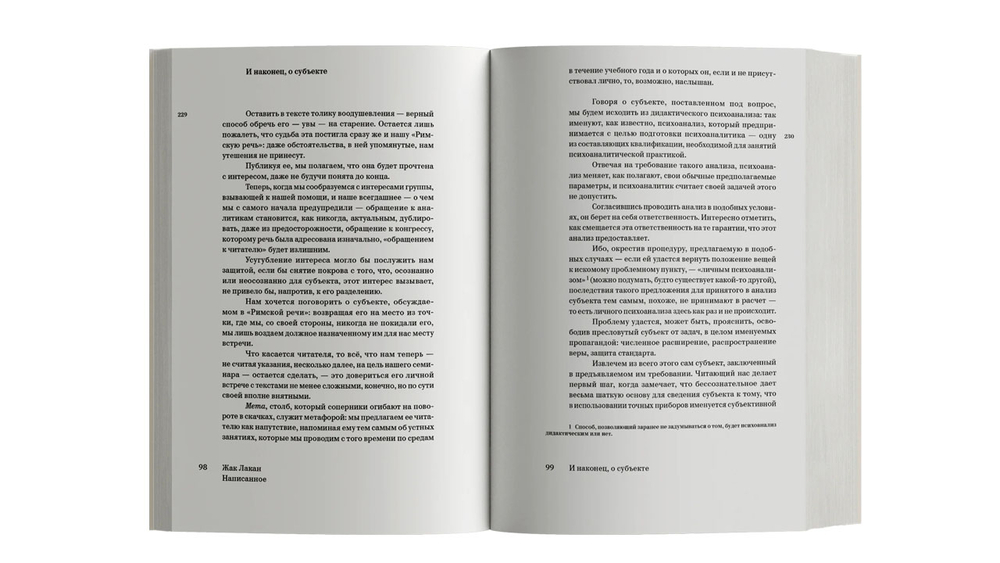 На русском "Написанное" выходит впервые, в двух томах, первый из которых включает в себя, в частности, знаменитую "Римскую речь" ("Функция и поле речи и языка в психоанализе"), статьи "Стадия зеркала…", "Фрейдова вещь…", "И наконец, о субъекте".