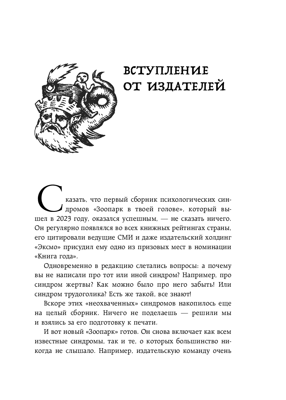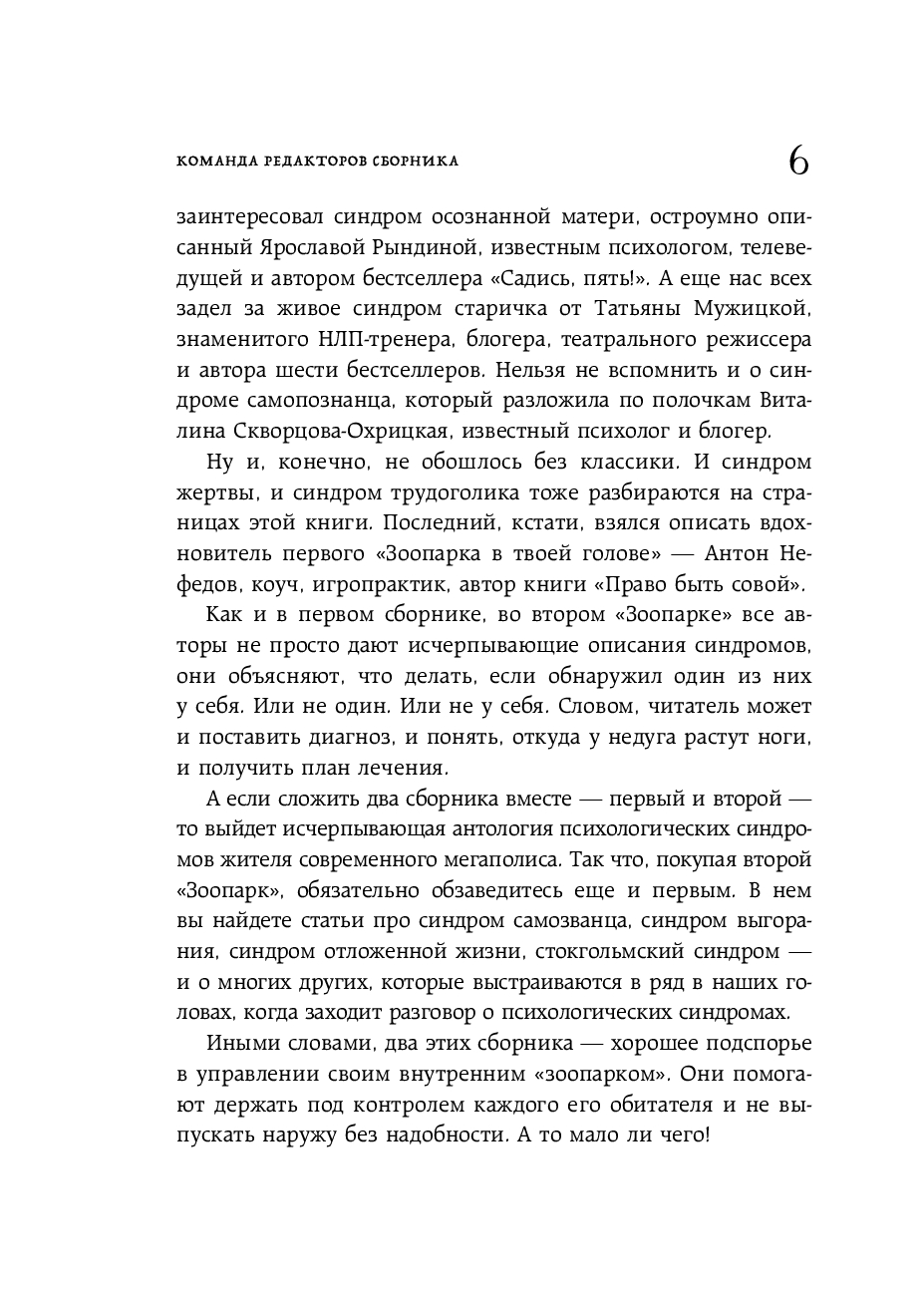 Во вторую часть сборника вошло все то, что не поместилось в первом "Зоопарке в твоей голове". Это и хорошо знакомые большинству читателей "недуги", вроде Синдрома жертвы и трудоголика, и "звери", о которых сложно отыскать что-то в сети. Например, Синдром самопознанца, русалочки, осознанной матери и пр.