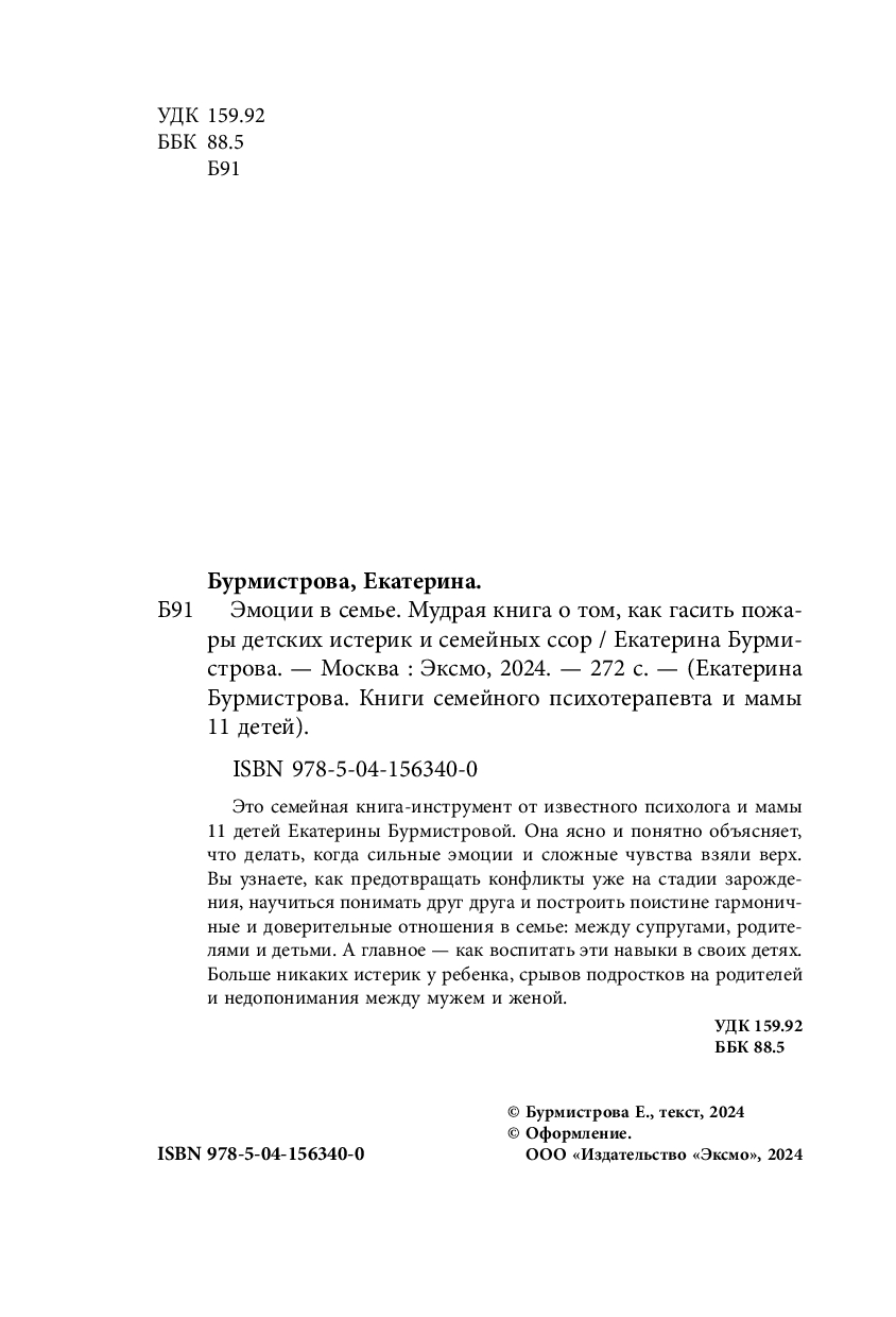 Это семейная книга-инструмент от известного психолога и мамы 11 детей Екатерины Бурмистровой. Она ясно и понятно объясняет, что делать, когда сильные эмоции и сложные чувства взяли вверх. Вы узнаете, как предотвращать конфликты уже на стадии зарождения, научиться понимать друг друга и построить поистине гармоничные и доверительные отношения в семье: между супругами, родителями и детьми. А главное – как воспитать эти навыки в своих детях. Больше никаких истерик у ребенка, срывов подростков на родителей и недопонимания между мужем и женой.