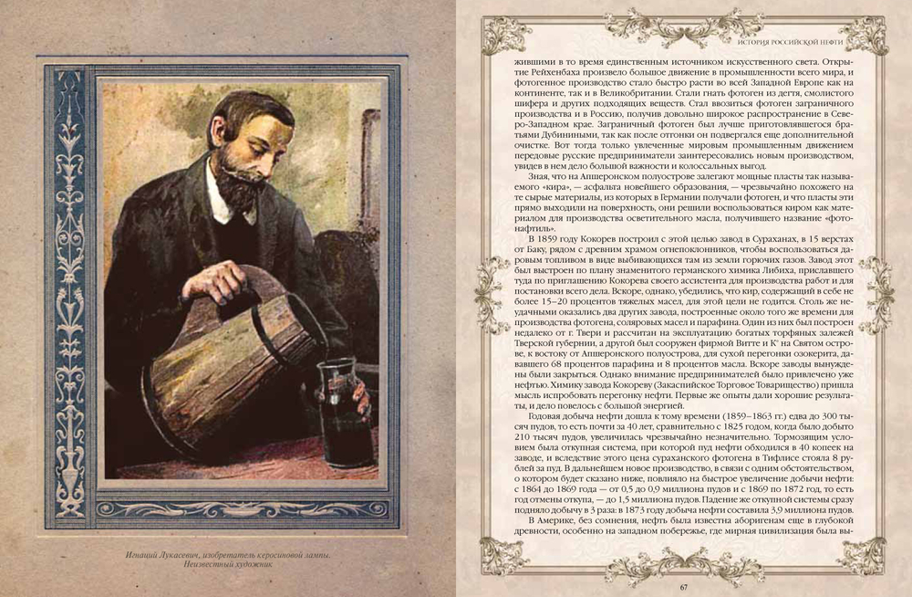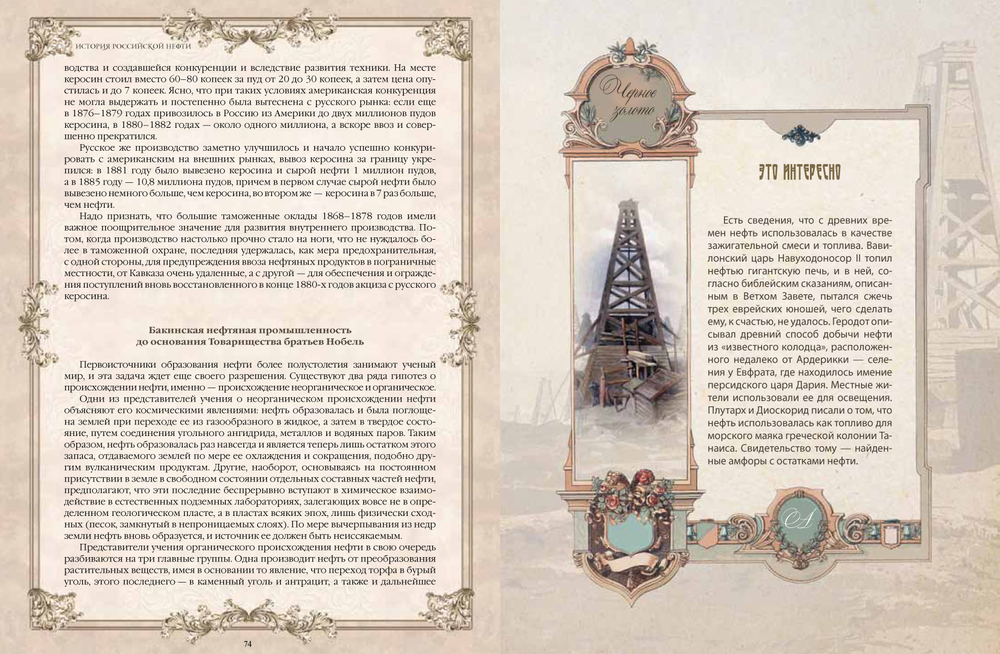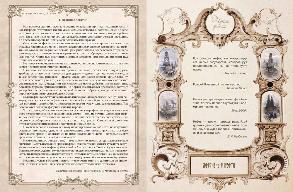 Книга "История российской нефти" уникальна и не имеет аналогов в России: большая часть вошедших в нее исторических текстов и документов неизвестна массовому читателю. Издание оформлено богатым иллюстративным материалом из подарочных альбомов, изданных к различным юбилеям "Товарищества братьев Нобель", а также произведениями классической живописи.