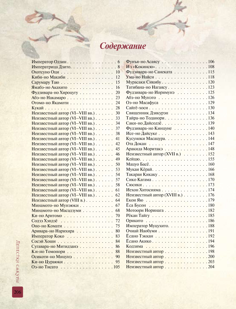 Это собрание лучших образцов японской классической поэзии, насчитывающее 150 стихов восьмидесяти двух поэтов II–ХХ веков, связанных единой темой — цветами и гармонией природы. Столетиями японские поэты и живописцы соревновались между собой, воспевая прелесть цветущей сакуры, апельсинового дерева, хризантем, гвоздик, ирисов, лотоса и удивительного "цветка Фудзи" — глицинии...