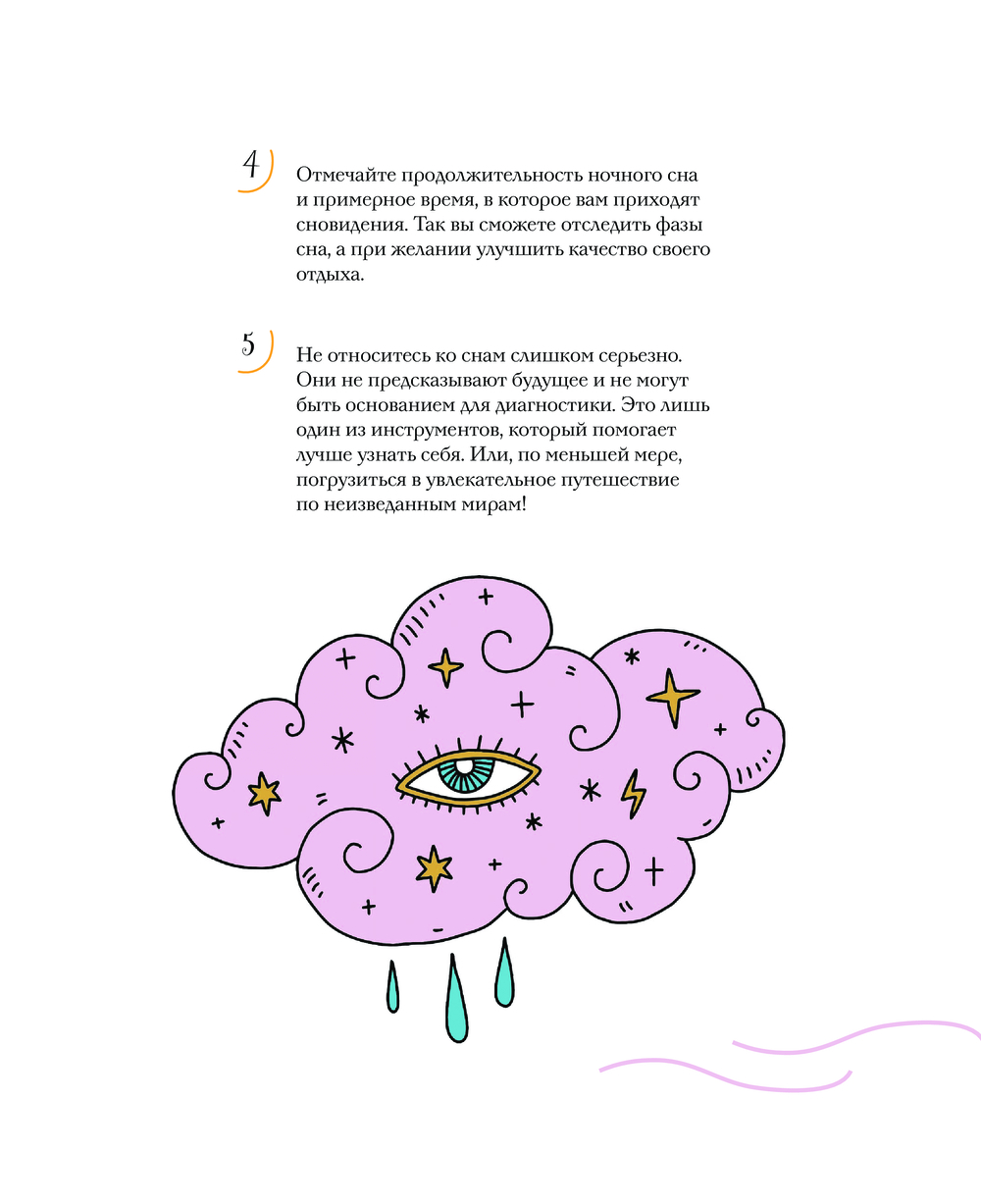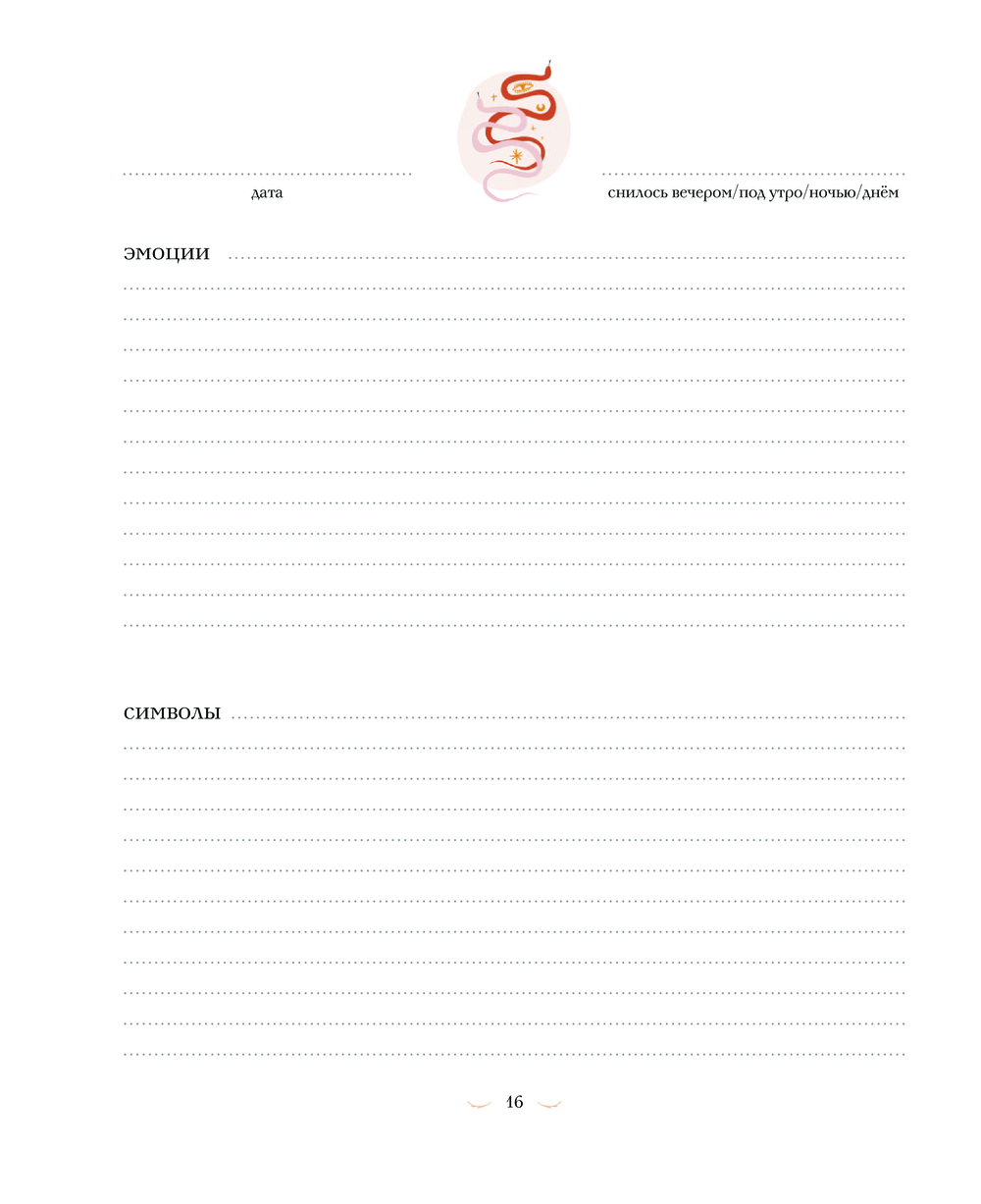 Блокнот включает специальные поля для записи ключевой информации о каждом сновидении: дата, эмоции, символы и сюжет. Такой формат позволяет в любое время вернуться к записям и сопоставить особенности сюжетов, эмоции к схожим символам.