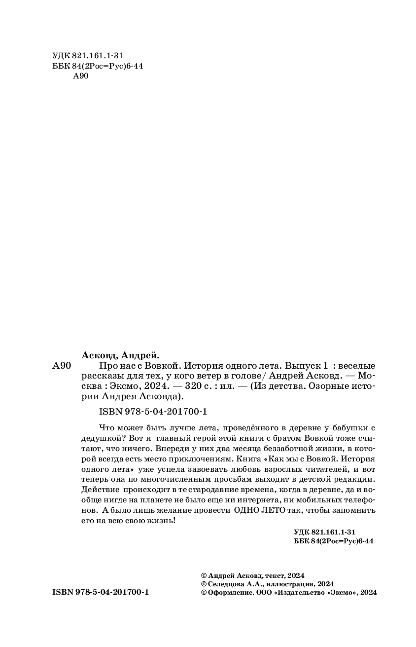 Что может быть лучше лета, проведённого в деревне у бабушки с дедушкой? Вот и главный герой этой книги с братом Вовкой тоже считают, что ничего. Впереди у них два месяца беззаботной жизни, в которой всегда есть место приключениям. Автор бестселлеров про Вовку, Андрей Асковд, уверен, что эта книга станет для детей самой любимой. И заставлять их читать вам точно не придется!
